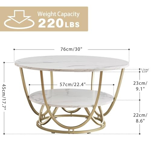 Return Policy Fast Delivery Trusted seller Round Coffee Table with Storage, 30 Inch Modern Coffee Table for Living Room,Wooden Tabletop-Marble White Print with Gold Frame Product Description [Modern Coffee Table] The coffee table has a square base and semicircular-frame side braces that support a white marble print surface full of textural beauty, creating a modern and gorgeous look. The unique and elegant design makes the coffee table perfect for living room, bedroom, balcony, etc. [Exquisite coffee table top] The coffee table top is made of 0.6" thick MDF wood board, with smooth and delicate white marbling print surface, waterproof and pressure resistant. 30" wide top provides enough space for green plants, magazines, laptops, etc. [Sturdy and Durable Coffee Table] The frame of the coffee table features a rose gold powder coat finish that is rust resistant. The heavy-duty steel frame provides strong support for the coffee table and can withstand loads of up to 220 lbs. 4 adjustable feet protect both the coffee table and your floor. [Multifunctional Coffee Table] The stylish coffee table is both practical, with 2 levels of spacious storage space for frequently used or larger items such as books, magazines, potted plants and some decorative items. The spacious space at the bottom is w cats like to hide and play. [Easy to Assemble & Dimensions] Simple construction makes it possible for anyone to assemble it in 20 minutes. Includes all parts and instructions, no more tools needed.Overall Dimension: 30"(D) x 30"(W) x 17.7"(H), weight: 25.13 lbs. Shipping Returns Payment Shipping Shipping is FREE to all addresses other than APO/PO boxes in the lower 48 states. All our stock ships from US-based warehouses. Shipped via USPS or UPS (depending on location and package weight) Unless stated otherwise, all orders will ship within 24-72 hours of your payment being processed. Check our feedback to see the great reviews of FAST shipping we offer. Returns Seller does not accept returns Payment We currently accept payment via eBay managed payments only. Once payment is cleared, we will dispatch your shipment within 1-3 business days. Please refer to the "Shipping" tab for more information regarding shipping speed to your destination.