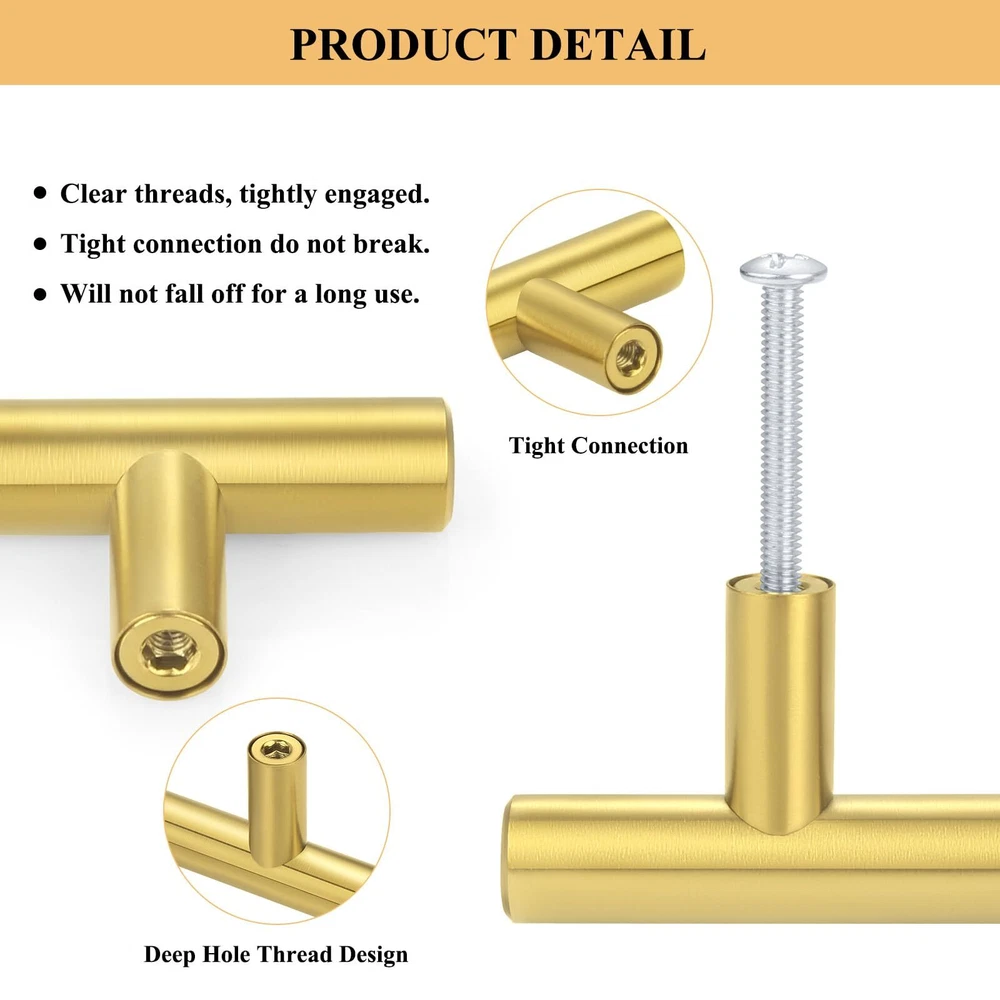 PREMIUM MATERIAL: Plustool Gold Cabinet Handles are made of high-precision quality stainless steel with perfect brushed brass finish, which do not leave any fingerprint; The flat surface of dresser handles is smooth without losing texture, not easy to fade,rust,oxidation and easy to clean; Durable and strong, elegant addition to any home SAFE DESIGN OF ROUNDED EDGES: The modern euro round style pulls are designed of round body; Compared with the square handles, the round edges design is safer and prevents scratching, which makes the drawer pulls feel more comfortable in use; In addition,the pulls base adopts high-precision drilling technology, and the deep spiral design is much stronger MEASUREMENT: Hole Centers: 3 inch(76mm), Overall Length: 5 inch(127mm),Height: 1.2 inch(32mm),Diameter: 0.4 inch(12mm) You will receive 30PCS cabinet handles, each handle in the box is individually wrapped to avoid scratching during shipping TWO SIZES SCREWS: We offer 1" and 1.57" screws that help you to fit different thickness of the furniture; Matched with 4 screws( 2 x 1'' and 2 x 1.57'') per handle WIDELY COMPATIBLE: Suitable for different styles of cabinets, use these gold hardware to decorate your cabinets or update some old furniture,bring you a modern look; Very stylish and unique. Ideal for kitchen, bathroom, bedroom, cabinet, drawer, dresser, door, cupboard, wardrobe, closet; Smooth and clear stainless steel handles, great helper to pull out drawer soon and conveniently