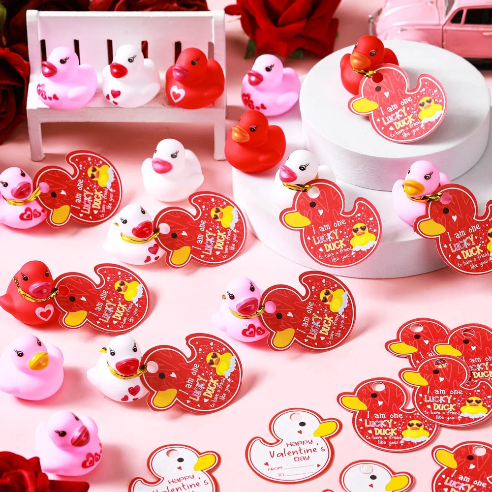 These mini rubber ducks are absolutely adorable and perfect for Valentine's Day! The set comes with cute gift cards and gold foil string, making them ideal for classroom exchanges or party favors. The ducks are well-made, and the variety adds a fun touch. Great value for the price—everyone loved them!