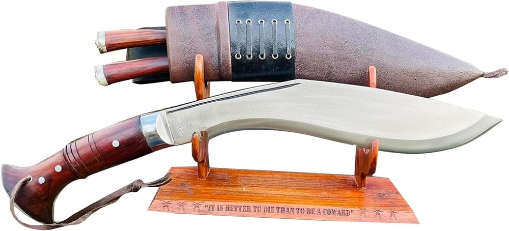 Spec of 12" long blade famous Survival Military Kukri Knife: This is handcrafted kukri therefore please note that each one might have slight variations in measurement. Blade size: 12 inches, semi-polished blade Handle size: 5.5 inches full tang dark white sadan wood handle Overall Length: 17.5 inches from tip of the blade to pommel (Approx). Weight: about 1.75 lbs (28 oz) with blade, sheath & utility knives. Scabbard: Cotton Covered in Buffalo leather Origin: Hand forge at EGKH factory in kathamandu Nepal. Blade Hardness: spine: 22-25 RC, Belly: 45-46 RC, Edge: 58-60 RC, Steel General Information about Kukri