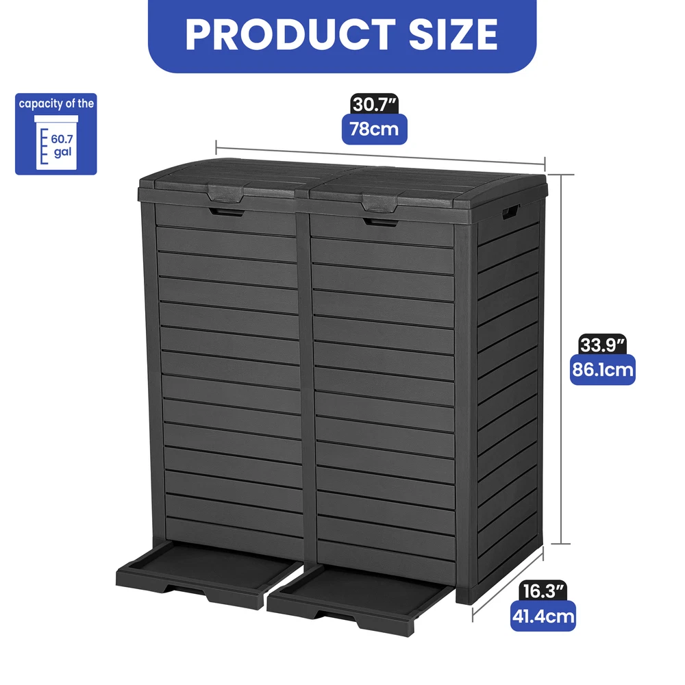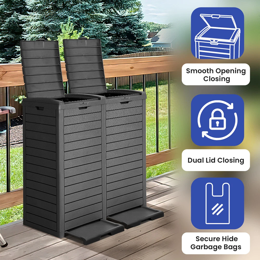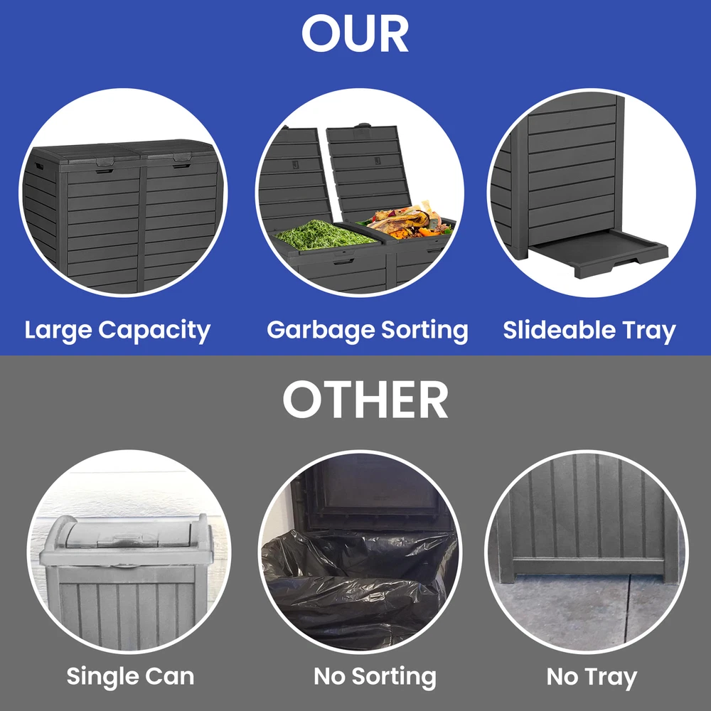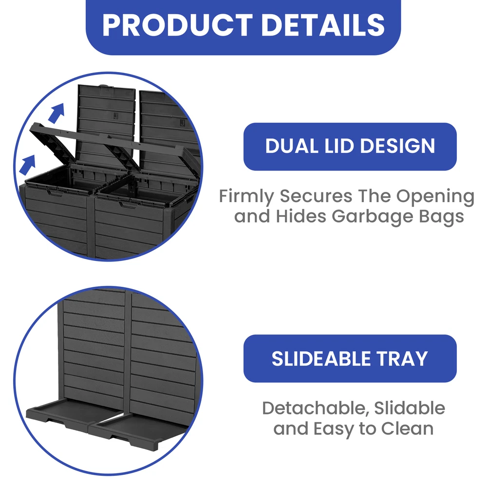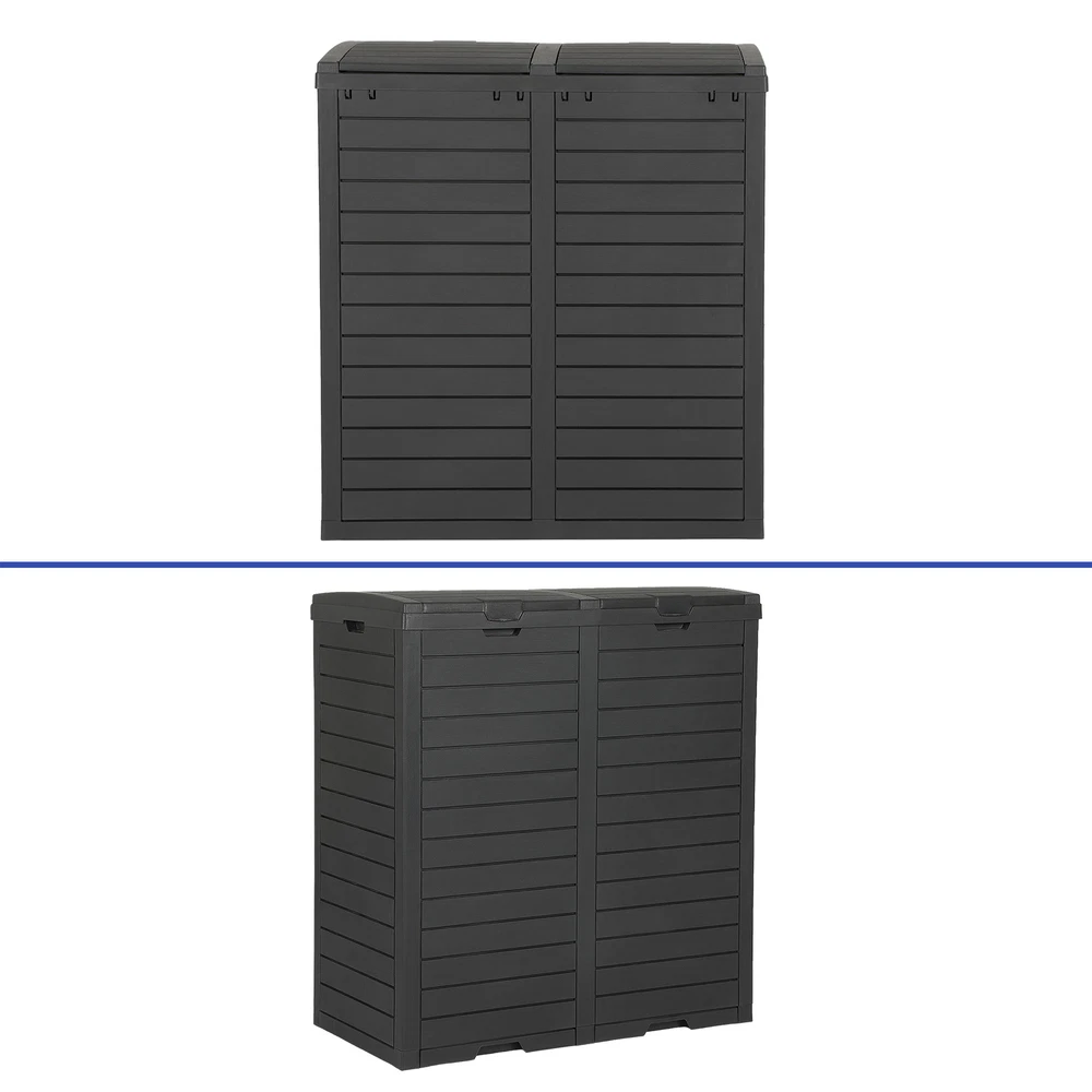 30" Outdoor Trash Bin 62 Gallon Storage Can Patio Kitchen Garden Waste Dual Tray Product Description NOTE: Professional Installation would be Highly Recommended. Description: 1. Color : Black 2. Features : Lockable Lid, Slideable Tray, Water/Weatherproof, With Handles 3. Material : Polypropylene and Resin 4. Mounting : Free Standing 5. Number of Compartments : 2 6. Room : Garden, Kitchen, Patio, etc 7. Suitable For : Food, General, Paper, and Plastic Features: Ample Capacity with Organized Compartments With a generous 62 lbs capacity and two compartments , our trash bin is suitable for storing food, paper, plastic, and general waste. It keeps waste sorted and neatly contained, making it an excellent choice for eco-conscious households and businesses. Our free-standing design adds to our versatility, fitting seamlessly into different spaces. Weatherproof and Durable Construction Crafted from polypropylene and resin . Our bin is designed to withstand outdoor elements like rain, sun, and wind. It maintains our sleek black finish and structural integrity over time, ensuring long-lasting use. Whether in your garden, patio, or garage, it stays strong in various conditions while looking modern and professional. Secure and Convenient Design Our bin's lockable lid ensures the safety and cleanliness of its contents, preventing spills caused by animals or weather. Our slidable tray adds an extra convenience layer, making waste sorting and disposal a breeze. Our lightweight yet sturdy build and ergonomic handles make it easy to move around wherever you need it most. Easy to Assemble and Use Our package includes all necessary assembling hardware kits and a clear instruction manual . Allowing for quick and hassle-free setup. At just 27 lb , it’s lightweight yet stable, ensuring effortless use and transport. Please note that padlocks are not included , giving you the flexibility to choose your preferred locking mechanism. Dimensions: 1. Capacity : 62 Gallon 2. Overall Dimensions : 30.7"L x 16.3"W x 33.9"H 3. Weight : 27 lb Package Included: 1. 1x Outdoor Trash Bin 2. Assembling Hardware Kits 3. Instruction Manual Book *) EXCLUDING PADLOCKS Shipping 1. Normally the item will be dispatched within 1 business day if payment is cleared before 12pm PST. 2. Please verify the correct shipping address in your PayPal account before making the payment. We only dispatch the item to the address that is sent to us at the time of checkout. 3. We don't ship to Hawaii, Alaska, Puerto Rico, APO/FPO/PO Boxes. 4. We don't provide local pick-up service. 5. Normally we will use USPS, UPS, FedEx & LTL to dispatch items. Payment 1. We accept PayPal and credit card. 2. We will ship to the confirmed Paypal shipping address that is provided with the payment only. Return 1. 30 days Money Back Guarantee. 2. Please contact our customer service to receive a RMA form first if want to return the item. 3. All returned items MUST in new condition with the original package. Contact If has any problem, please contact us by sending an ebay message. Our customer service will resolve the problem as soon as possible. On Feb 13, 2025 at 18:57:03 PST, seller added the following information: