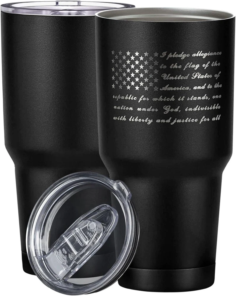 PATRIOTIC DESIGN:Our Pledge of Allegiance incorporates the American flag design,A great way to show your patriotism and American pride. Treat yourself or give this American gift and make someone''s day special. LASER ENGRAVED:Our Pledge of Allegiance American flag laser engraved on the metal tumbler. No need for an American flag decal when you can have it laser engraved to remain as bold and crisp as they appeared on Day One. UNIQUE PATRIOTIC GIFTS FOR WOMEN OR MEN:No matter the occasion, this classic and practical patriotic American flag gift is sure to bring a smile to even the marine veteran. Perfect for Father''s Day, Veterans Day, birthdays, or Christmas, show your appreciation with this thoughtful and patriotic present. BPA-FREE:Made from eco-friendly, phthalate-free, and non-toxic 18/8 stainless steel. This printed Pledge of Allegiance American flag tumbler is available in a capacity of 30 fl oz and is the perfect vacuum-insulated stainless steel tumbler for drinking your favorite beverage on the go. HIGH QUALITY INSULATION:Keep your cold drinks chilled for up to 24 hours and hot drinks steaming for up to 6 hours with our double vacuum insulated tumbler. This Pledge of Allegiance incorporates the American flag coffee tumbler features double-walled insulation, so you can enjoy your favorite beverage at the perfect temperature anytime, anywhere.