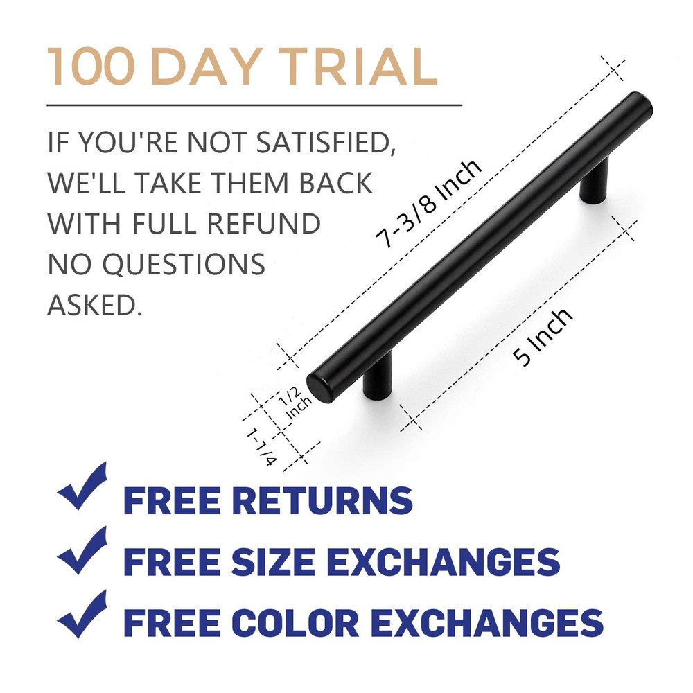 100-Day Evaluation: We believe you'll value the handles. Experience their craftsmanship at your convenience, and if they don't meet your needs, we are here to assist If you're replacing your handle, measure and ensure the center to center hole spacing of the current handle is 5 inches(128mm) Installing new cabinet handles, drill two holes with center to center spacing of 5 inches(128mm) STURDY & STRONG: 30 bar pulls made of stainless steel finished with classic matte black coordinates well with other nickel appliances and accessoriess Simple look: The black cabinet handles have a wide appeal across a range of kitchen cabinet doors and drawers The matte black handles have a clean and timeless look that works with farmhouse, vintage, traditional and transitional styles [MEASUREMENT]: Screw-hole center: 5inch(128mm), Total Length:7-3/8 inch(188mm), Diameter:1/2 inch(12mm) Projection:1-1/4 inch(32mm)