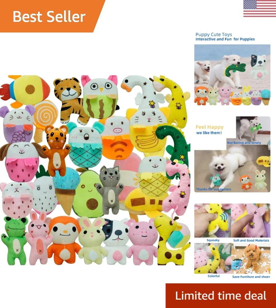 30 Pack Puppy Squeaky Toys Pet Dog Toys Squeeker for Pet Small Puppies Dogs Bundle 30 Pack Dog Squeaky Toy- Multi color Plush Toys Puppy Chew Toys for Small dogs - Cute Stuffed Animal Pet Toys Set Bulk Dog Toys And Unique Shapes: These puppies toys are designed in a variety of vivid shapes. Including different kinds of animals, fruits. Such as tiger, dinosaur, frog, cat, giraffe, rabbit, elephant, owl, duck, airplane, pitaya, pineapple, strawberry,etc. Bright colors and cute shapes are your pup’s favorites . Great Inexpensive Puppies Toys Pack : This dog toys bundle pack contains 30 different plush toys . Various fun in one set ! They will provide lots of fun and entertainment for your puppies and keep them busy for several s , meet different requirements of the dog’s daily life requirements . Keep pets enjoy playing : In addition to training and playing , puppies can effectively clean their teeth and maintain oral hygiene by chewing on these toys, which can also reduce puppies' teeth grinding behavior . Relieve the discomfort of dogs when they are teething . Each toy have a squeaker inside .The funny squeaky sound will greatly decrease the loneliness feeling of your dog when you are not at home. Good Soft Stuffed Toy : These small dog toys are made of good material and plush filling . They are durable, clean, bite-resistant,good and washable. Some Note: These toys are perfect for puppies and small dogs , not recommended for aggressive chewers. If you have any questions, please do not hesitate to contact our messenger. We will try our best to help you. 30 Pcs Puppy Dog Squeaky Toys Bundle 30 Pack Dog Squeaky Toy- Multi color Plush Toys Puppy Chew Toys for Small dogs - Cute Stuffed Animal Pet Toys SetBulk Dog Toys And Unique Shapes: These puppies toys are designed in a variety of vivid shapes. Including different kinds of animals, fruits. Such as tiger, dinosaur, frog, cat, giraffe, rabbit, elephant, owl, duck, airplane, pitaya, pineapple, strawberry,etc. Bright colors and cute shapes are your pup’s favorites .Great Inexpensive Puppies Toys Pack : This dog toys bundle pack contains 30 different plush toys . Various fun in one set ! They will provide lots of fun and entertainment for your puppies and keep them busy for several s , meet different requirements of the dog’s daily life requirements .Keep pets enjoy playing : In addition to training and playing , puppies can effectively clean their teeth and maintain oral hygiene by chewing on these toys, which can also reduce puppies' teeth grinding behavior . Relieve the discomfort of dogs when they are teething . Each toy have a squeaker inside .The funny squeaky sound will greatly decrease the loneliness feeling of your dog when you are not at Soft Stuffed Toy : These small dog toys are made of good material and plush filling . They are durable, clean, bite-resistant,good and Note: These toys are perfect for puppies and small dogs , not recommended for aggressive chewers.