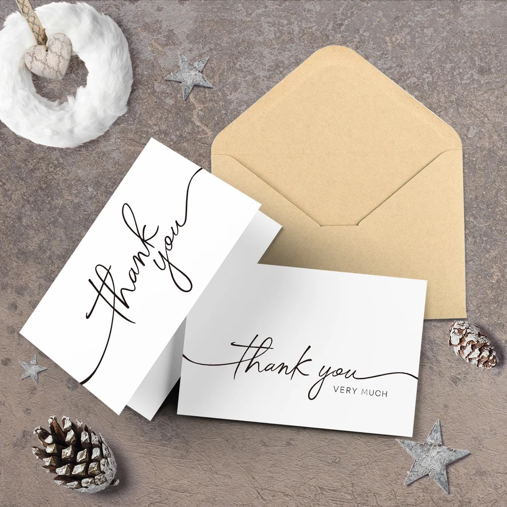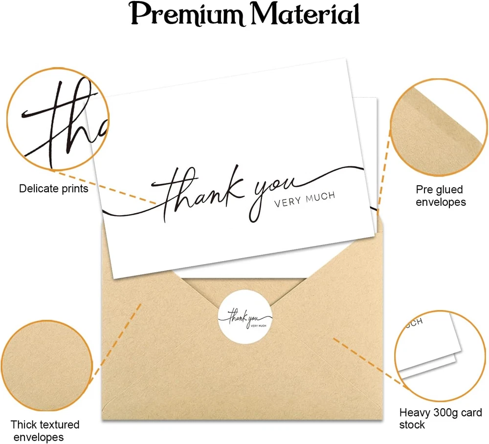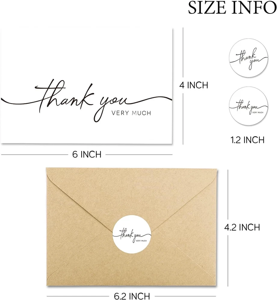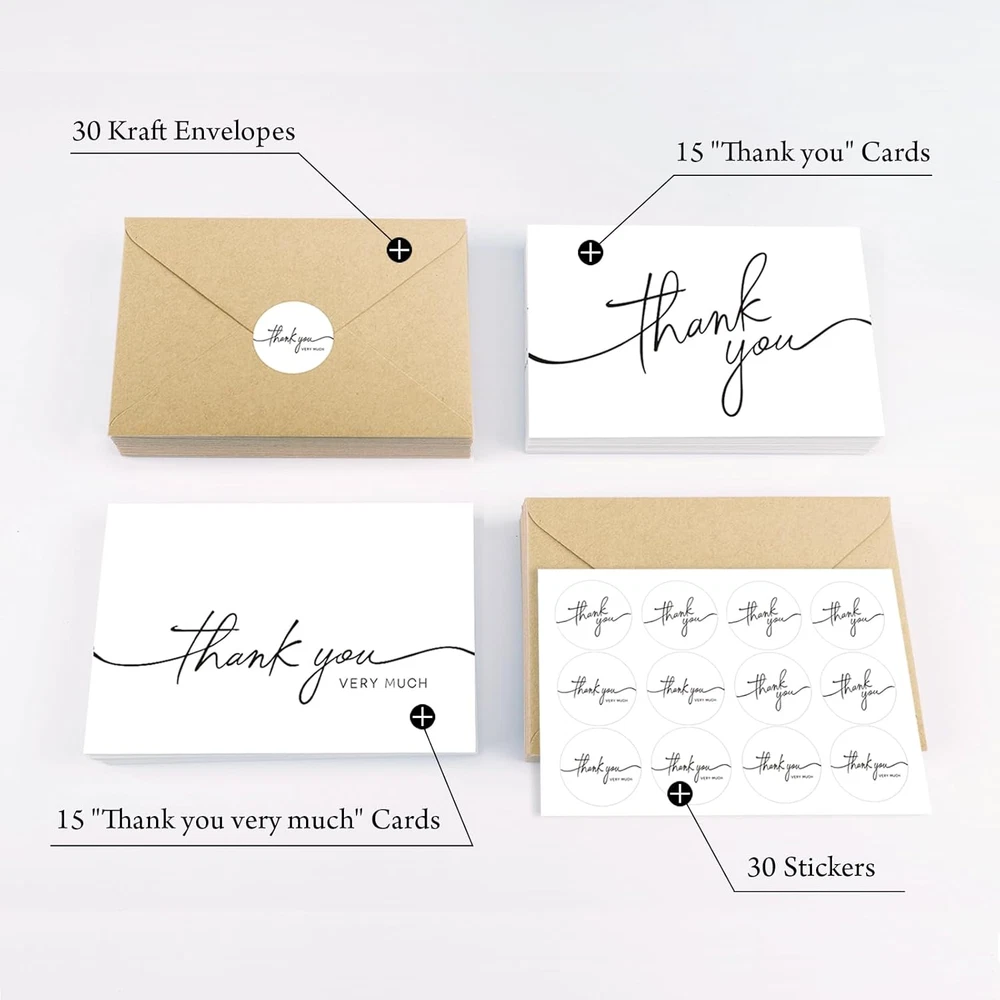 Store New Arrivals Add to Favorite View Feedback Contact 30 Pack Thank You Cards with Envelopes, 4" X 6" Professional Looking | Suitable for Business, Baby Shower, Wedding, Small Business, Graduation, Bridal Shower, Funeral Description Item model number 40W Number of Items 40 Color White Manufacturer Part Number 40W Item Weight 14 ounces Pre-printed birthday party,thank you Product Dimensions 6 x 4 x 0.01 inches Size 30PCS 【Thank You Cards】Each set contains two assorted designs thank you cards together with envelopes and stickers. All greeting cards come in a solid and reusable box for easy storage. 【Premium Quality】Our white thank you cards are with solid and great quality. Each thank you card is printed on 300 gsm thick card stock. There is no smudging or fingerprints with any type of pen on this non-glossy paper. 【Envelopes & Stickers Included】All kraft envelopes are with a water-activated adhesive seal. Peel and seal stickers with matching design are provided for additional adhesion. 【Perfect Size】Our thank you cards are 4" x 6" when folded. And they are blank inside for your own handwritten message leaving plenty of space to show your sincere appreciation and it is big enough to fit standard size photos into the envelope provided. 【Perfect for All Occasions】Be sure to always have a pack of greeting cards on hand. It's a perfect choice for wedding, bridal shower, baby shower, birthday party, anniversaries, funeral, business gathering or any other occasion throughout the year. 40 Thank You Cards ! BGT-Cards's priority is to make our customers are 100% satisfied with the purchase, please do not hesitate to contact us with any suggestions or complains and we would be happy to make things right. Thank You Card's Size: DIMENSIONS: 4 x 6 inches- Blank inside with envelopes & stickers What You Can Get : -40 Bulk Thank You Cards -40 Envelopes -40 Stickers Policy on Product Sourcing and Fulfillment Dear Valued Customers, We would like to clarify an important aspect of our business operations to ensure transparency and trust in our relationship with you. Product Fulfillment: Fulfillment by Amazon (FBA): The products are stored in Amazon Fulfillment Centers. This storage solution ensures that the inventory is kept in a secure and climate-controlled environment, which helps maintain the quality and safety of the products. Efficient Delivery: Utilizing Amazon's fulfillment services allows us to leverage their robust logistics network to provide you with fast and reliable shipping. This means you receive your purchases in a timely manner with the added assurance of Amazon's trusted delivery systems. Customer Assurance: Quality Control: Every product is carefully selected and undergoes rigorous quality checks before being listed for sale. Our commitment is to provide you with high-quality items that meet your expectations. Secure Storage: Amazon's Fulfillment Centers are renowned for their high standards of security and efficiency. Your products are stored safely until they are shipped to you. Customer Support: Should you have any questions or concerns regarding your purchase, our customer support team is readily available to assist you. We are dedicated to ensuring your satisfaction with every transaction. We appreciate your business and are committed to providing you with a seamless and satisfactory shopping experience. Thank you for your trust and understanding. Sincerely, -Manager- Shipping Policy and Expectations Dear Valued Customers, We are committed to ensuring that your package arrives as quickly as possible. However, we kindly ask for your understanding regarding certain factors that may occasionally affect shipping times. Our Commitment: Prompt Processing: We strive to process and dispatch your orders promptly to minimize any delays. Reliable Shipping Partners: We work with reputable shipping companies to ensure your packages are handled with care and delivered efficiently. External Factors: While we do everything within our power to expedite your order, please note that some factors are beyond our control: Weather Conditions: Severe weather can impact shipping routes and cause delays. High Postal Traffic: During peak seasons, such as holidays, the increased volume of packages can lead to longer delivery times. Shipping Company Performance: The performance and schedules of shipping companies may vary, potentially affecting delivery times. We appreciate your patience and understanding in these situations. Rest assured, we are doing everything possible to get your package to you as soon as possible. Customer Support: If you have any questions or concerns about your order, please do not hesitate to contact us. Our customer support team is here to assist you and provide any necessary updates on your shipment. Thank you for your trust and continued business. Shipping Policy and Customer Satisfaction Shipping Information: Service Area: We offer shipping to the lower 47 states. Please confirm with us about the delivery date before completing your purchase. Thank you. Address Requirements: We do not accept P.O. Boxes. Please provide a physical address for delivery. Shipping Restrictions: Unfortunately, we are unable to ship items to the state of Ohio and California due to shipping agreements and restrictions. International Shipping: eBay International Shipping Hub: For shipping outside of the continental USA, we only use eBay's International Shipping Hub. The item is shipped to Illinois and then sent to the rest of the world. Duties and Taxes: International customers are responsible for all duties and taxes. Please continue to check out to calculate the shipping costs for your country. Inquiries: Messages regarding eBay's International Shipping Program must be directed to eBay exclusively. Customer Satisfaction: We try our very best to ensure every customer is completely satisfied. If there's a problem, please message us! We're happy to help. If you are happy with your purcha