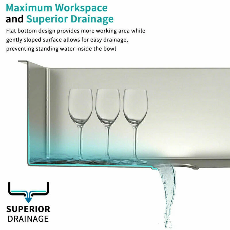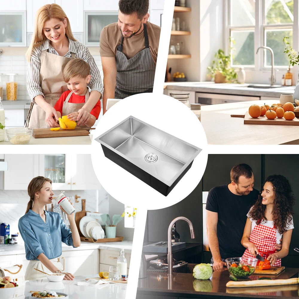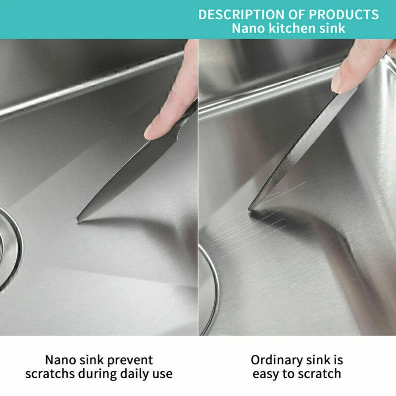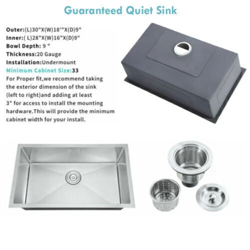 DO NOT SHIP TO PR!!! Product Dimensions 30in Single Bowl Sink: 30" L X 18" W (front-to-back) X 9" Note: That the item does not contain a faucet The Nano Commercial grade brushed finish for easy to clean and long-lasting ,stainless steel with satin finish ensures that it is highly resistant to dirt and grime, easily wipes clean, and matches most kitchen appliances. Heavy duty sound guard undercoating and thick rubber padding to minimize noise and reduce condensation Stainless steel basket strainer drain that traps goods waste and can be easily emptied into the trash. Features: 20 Gauge stainless steel thickness 10mm radius corner for easy cleaning and modern look Nano Commercial grade brushed finish for easy to clean and long-lasting Heavy duty sound guard undercoating and thick rubber padding to minimize noise and reduce condensation Slanted bottom with elegant drain grooves for easy water draining USA standard 3.5'' drain opening will fit any garbage disposal unit Drain placement – Rear drain placement ensures dishes don't settle on the drain Stainless steel basket strainer drain that traps goods waste and can be easily emptied into the trash Accessories Strainer Cut-out template paper Installation mounting brackets hardware Package Package: Foam corner guard+7 layers stronger carton