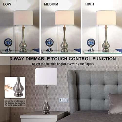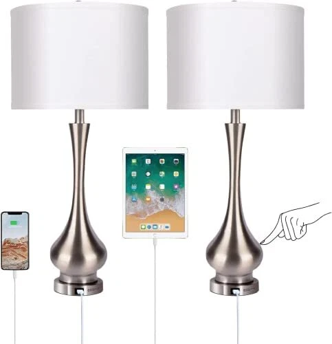 Menu 1. We require immediate payment. 2. We currently accept payment via eBay managed payments only. 3. Once payment is cleared, we will dispatch your shipment within 1-3 business days. Please refer to the "Shipping" tab for more information regarding shipping speed to your destination. 30" Tall Table Lamp Set of 2 with Touch Control, Farmhouse Table Lamp with USB Ports, 3-Way Dimmable Modern Brushed Nickel Finish Bedside Large Table Lamps for Living Room and Bedroom Product description Add Different Charm for Home Decor: The touch table lamp's design is very modern, mix metal base and premium fabric factor, the sensor lamp looks advanced. More than just functional for your modern home, this end table lamp lends artful appeal to your space as it shines. Try adding one to your entryway to add warmth as your guests arrive. Modern Table Lamps: Tall 30inch modern table lamps with USB Port, support 5V/1A quick charging. Charge your electronics devices like mobile phones, iPad, kindle readers, and so on, regardless of whether the lamp is on or off. Please remember to turn on the power switch before charging. 3-Way Dimmable Touch Control Lamps: The touch lamps for bedroom set of 2 can tap any place of the metal base and body to switch 3 modes of lighting (low, medium and high). No matter you are working, reading, gaming or sleeping, just choose it to meet all your needs. With an E26 socket(Min 60W, Max 100W, BULBS NOT INCLUDED). Eye Protection and Premium Lampshade: Enjoy the elegant of the white linen fabric round hardback KD (Knock Down) shade and don’t worry about dust or dirt causing any issues. The bedroom lamps with white lampshade can effectively weaken the strong light from the bulb and protect your eyes. 2 Free LED Bulbs Included - Comes with 2 LED light bulbs in the package, no need to buy bulbs separately. We specifically choose the dimmable LED bulbs, saving up to 90% on your energy bill. The E26 led bulb comes in 2700K with 805lm brightness, which meets strict test criteria. Provide stable enjoyable and cozy light, no flicker, no dazzle. Happiness Guarantee: If you are ever unhappy with the table lamps, just let us know and we will solve it for you immediately. We pride ourselves on high-quality products and happy customers. PLEASE MESSAGE US IF YOU HAVE ANY OTHER QUESTIONS, AND MANY THANKS FOR READING ALL OF THIS. Copyright ©#. All Rights Reserved.