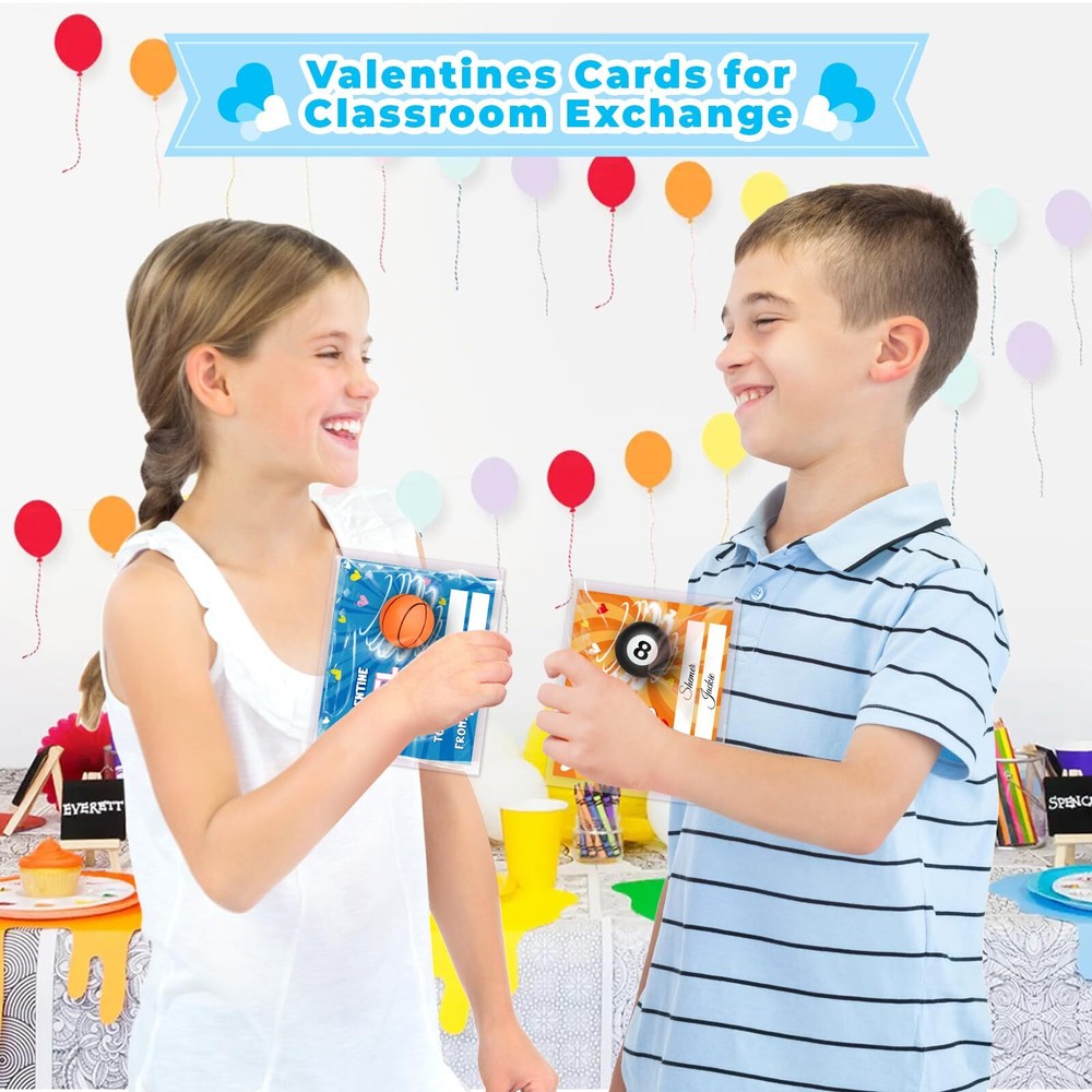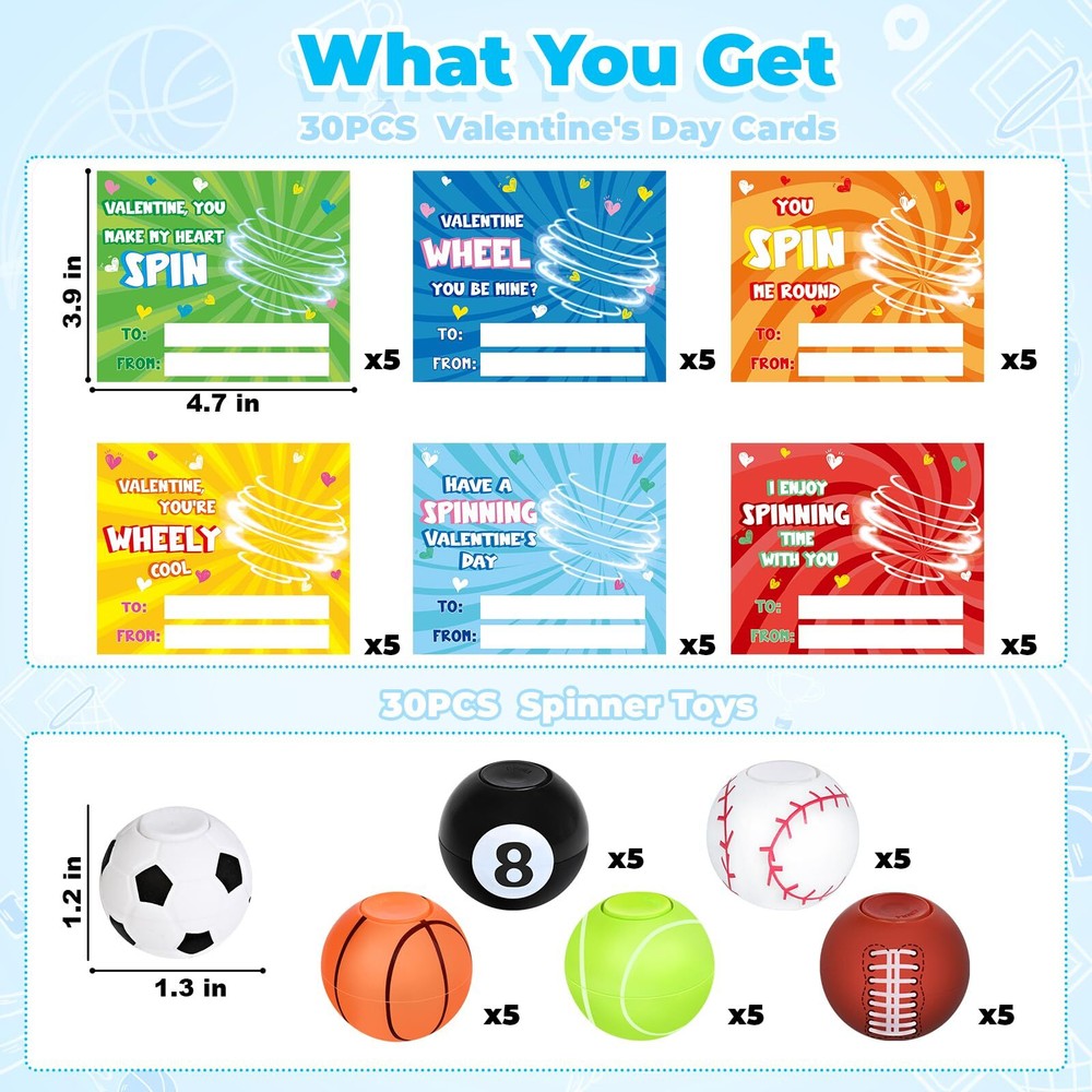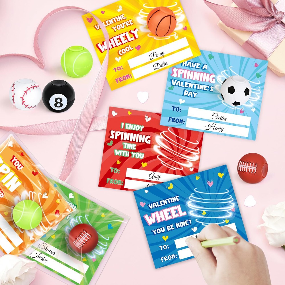 SUPER VALUE PACK! Our Valentine's Day Card Gift Set for kids includes 30 Fidget Spinners Sport Balls and 30 Valentine's day cards in 6 fun designs. Enough quantity and good combinations can meet the needs in Valentine's parties and school classroom exchange gifts. Kids can share with friends or classmates and have fun together. A great valentine idea for classroom valentine parties. UNIQUE VALENTINE'S DAY CARDS. Each valentine's day card has a valentine punchline, making the cards more attractive. The valentine's day cards are thick, double-sided printed with spinner theme. A perfect greeting card to give to your kids who like something special. Putting the mini ball into the card will be a wonderful Valentine's gift for kids. IDEAL VALENTINE'S DAY GIFT. Our Valentine's Cards Party Favors Set provides fun and entertainment for your kids. Valentine's greeting cards with sentory findget toys are perfect for kids classroom exchanges, preschool or elementary school Valentines parties, Valentine's event, or any Valentine's game prize, love notes, party favor supplies and more! Ideal Valentine's day gift for boys and girls. ENDLESS FUN. These fidget spinners toys make kids hand busy, concentrate, get rid of unhappiness, will reduce the chance for biting nails. These mini fidget spinners soccer balls for kids are about about 1.3 inches, suitable size for kids to play with, light weight and easy to carry. EXCHANGE GIFT AND SHARE LOVE. Giving out the valentines cards is a fun way to encourage kids' social skill development and teach kids to share, love and make friends. A great chance to express love to families, friends and classmates. Feel free to message us through "contact sellers" if you have any questions. We will reply to you within 24 hours. Share the love with !