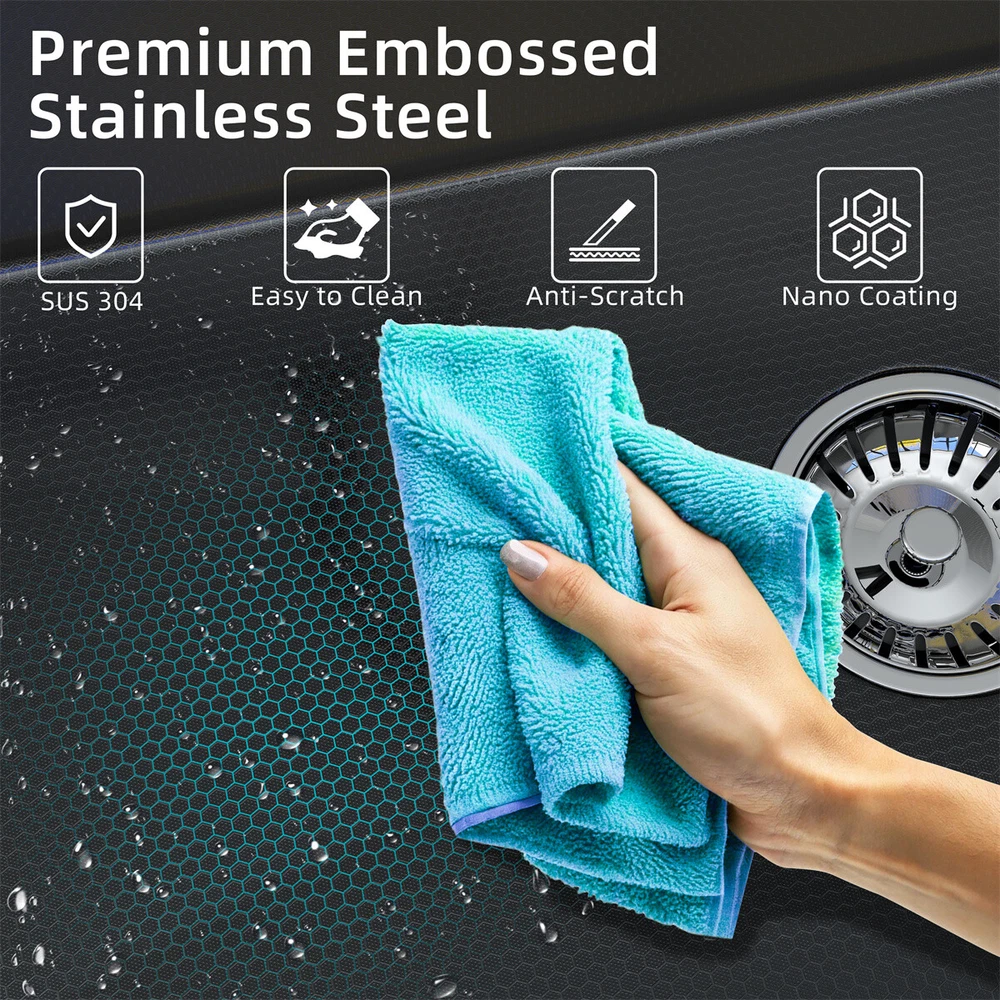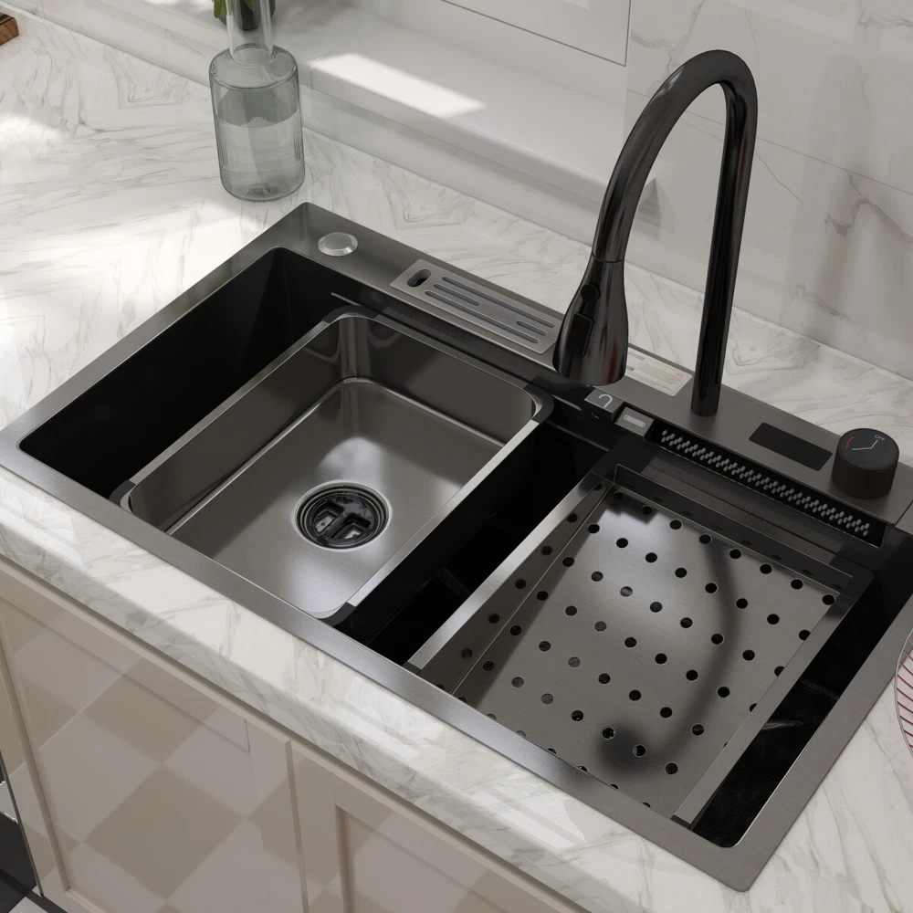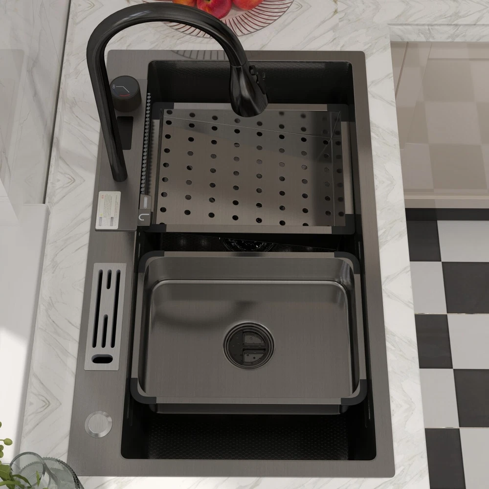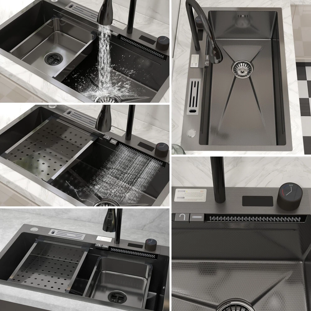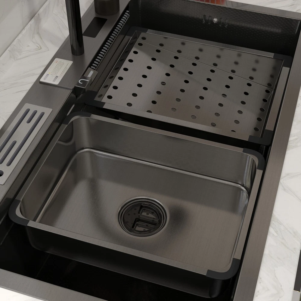 Description This Multifunctional Stainless Steel Sink for Dishwashing is an essential and highly durable kitchen appliance that ofers a blend of functionality, hygiene, and aesthetic appeal. Crafted from premium-grade 304 stainless steel, this sink stands out for its superior qualities that make it a preferred choice for modern households and commercial settings alike. Features **Premium 304 Stainless Steel **: The kitchen sink is made of high quality stainless steel, with super strength and durability. Imitation honeycomb nano-coating is ‘anti-scratch’ and easy to clean, also can withstand high temperature **Multi functional Practical Design**: This nano kitchen sink has a one-of-a-kind design that incorporates a waterfall, which not only makes the sink more beautiful to the eye but also makes it easier for water to flow without splashing and reduces the amount of water that is wasted. The pull-down faucet with three water outlet methods meets different needs. There are double-layered sliding tracks on both sides of the inner wall for sink accessories, allowing for partitioned operations. It not only saves more space but also adds a level of convenience and flexibility to kitchen chores. **Efficient Drainage**: The gently sloping bottom of the built-in kitchen sink prevents water from accumulating in the bowl and draining quickly without clogging. **Noise Reduction Features**: The exterior of the kitchen sink is equipped with thicker, softer rubber shock pads and an anti-condensation coating that provides additional sound insulation and protects the cabinets from moisture and warping. **Package Details**: Kitchen Sink*1, Pull-out Faucet*1, Drain Basket*1, Basin*1, Tool Carrier*1, Water Leakage*1, Angle Valve+Gravity ball*1, Draining Kit*1 (Includes a complete set of accessories). Specification Material: Stainless Steel Colour: Black Shape :Rectangle Exterior Dimensions: 30" x 18" x 8.46" Internal Dimensions: 27.55" x 13.97" x 8.26" Net Weight: 22 lbs Package Content 1 x Kitchen Sink Workstation (Includes complete set of accessories) 【Customer Service】 Please feel free to contact us if you have any problem, we will help you resolve any issues in the shopping process. On Sep 28, 2024 at 04:53:46 PDT, seller added the following information: On Oct 8, 2024 at 03:48:26 PDT, seller added the following information: On Oct 15, 2024 at 23:43:42 PDT, seller added the following information: