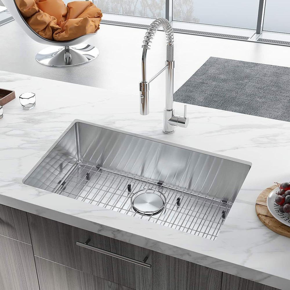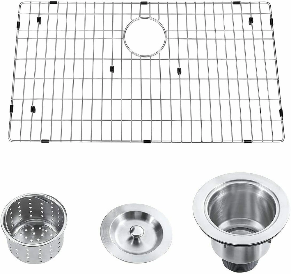 Features: Handmade Kitchen Sink Combo With Faucet package together Premium 304 grade stainless steel with excellent corrosion and rust-resistant 18 Gauge stainless steel thickness 10mm radius corner for easy cleaning and modern look Commercial grade brushed finish for easy to clean and long-lasting Heavy duty sound guard undercoating and thick rubber padding to minimize noise and reduce condensation Slanted bottom with elegant drain grooves for easy water draining USA standard 3.5'' drain opening will fit any garbage disposal unit Drain placement – Rear drain placement ensures dishes don't settle on the drain Stainless steel bottom rinse grid can protect the sink from scratches and acts as a drying rack for pots and pans Stainless steel basket strainer drain that traps goods waste and can be easily emptied into the trash Stainless steel decorative drain cover that adds to the visual beauty .It covers the drain while allowing water and waste to flow through under it . Product Weights & Dimensions 30 x 18 x 9 inch 17 pounds Accessories Stainless Steel Faucet Strainer and decorative drain cover Bottom rinse grid Cut-out template paper Installation mounting brackets hardware Package Package: Foam corner guard+7 layers stronger carton
