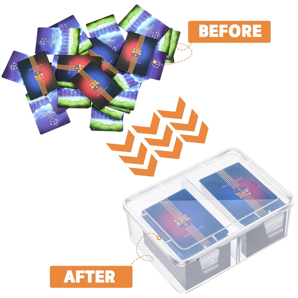 Features: Adopting quality and sturdy material, these playing cards cases can be served as practical gifts for friend, family member, classmate and more, portable and convenient. The card holder box is not only suitable for assorted cards, but also proper for various small items, like thread, coins, crafts, stationery, jewelry, tools and so on, waterproof and reliable. Specifications: Material: plastic Color: clear Size: about 16.5 x 12 x 6 cm/ 6.5 x 4.7 x 2.4 inch Package includes: 2 x Cardboard card storage box Notes: Manual measurement, please allow slight errors on size. The color may exist a slight difference due to different screen displays. The mention of heat press machines' brand names and any related models above is only for purposes of demonstrating compatibility, not for trademark use, our trademark is . Sufficient Quantity: you will get 2 pieces of trading card storage boxes with removable dividers, which can hold more than 300 cards, each measures about 16.5 x 12 x 6 cm/ 6.5 x 4.7 x 2.4 inch; Enough quantity can meet your assorted storage demands Detachable Dividers and Thoughtful Designs: the sports card holder has a detachable divider to help you better sort different cards; For easy access and storage, we have designed a reinforced card buckle so that you do not lose or leave your cards after use Clear Baseball Card Storage Case: these sports card storage boxes adopt clear design, convenient to identify and use, save your time and energy in finding cards; It can be sorted by star player cards, team cards and different game cards Sturdy Material: the deck card boxes is made of quality plastic material, waterproof and sturdy, reliable and durable, not easy to wear or break, protect your cards from getting dirty by dust, water or scratch, will serve you for a long time Versatile Usages: these card storage boxes are widely applicable to any sports card, game card or trading game, helping to organize and store your playing cards, making your precious collection safe, practical and convenient