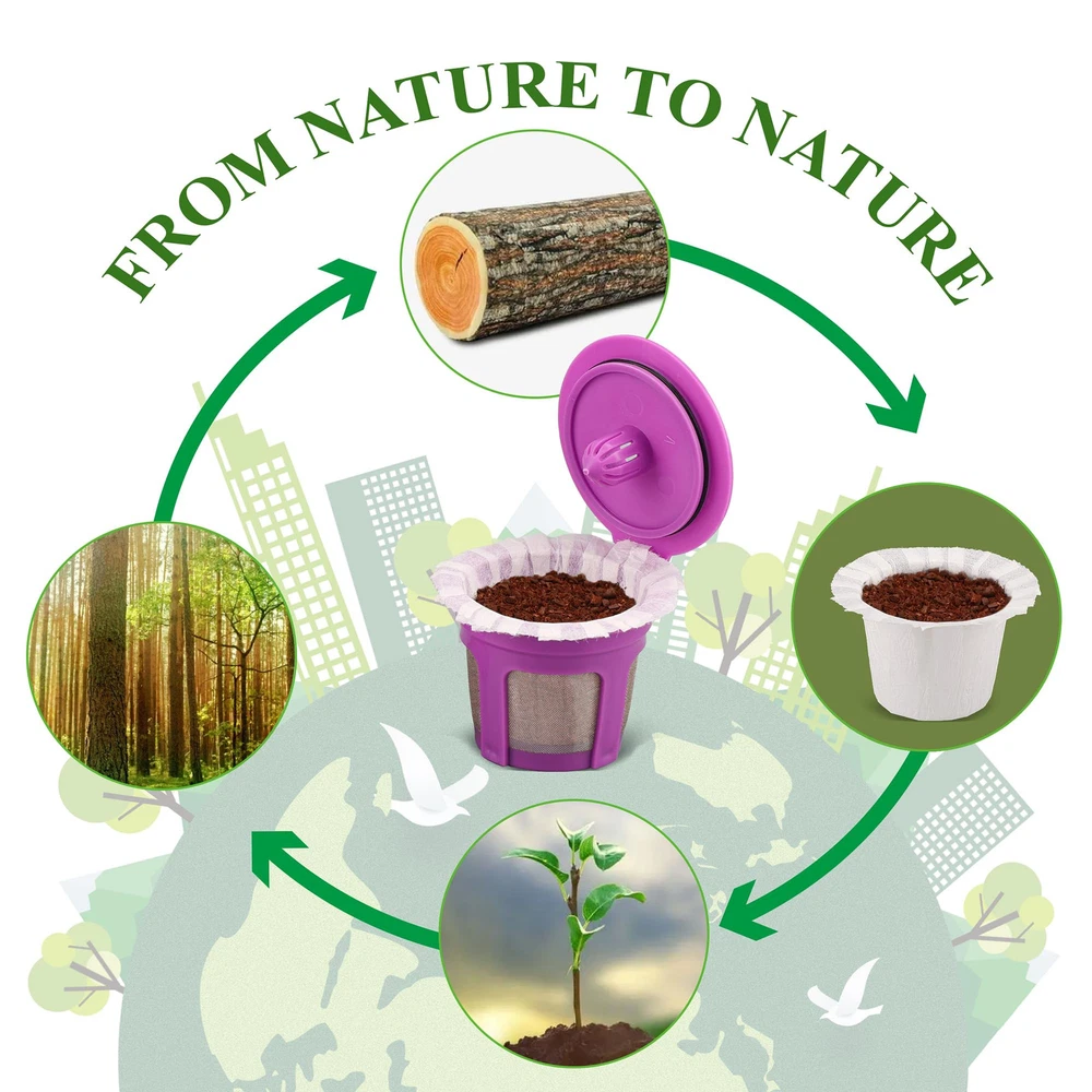 GOOD FIT TO ALL K CUPS: 300 count disposable paper filter comes with two reusable K cups, in addition.they also good fit into PERFECT POD Solofill, Pro Mael, MaxRona, Kicovitifa EZ-Cup, My K-Cup, plastic reusable k cups EFFECTIVE FILTRATION:Coffee filters are strong enough to filter effectively, no blowouts that trap all the grounds and most of the coffee's natural oils, delivering a smoother. Say goodbye to sediment. Enjoy your coffee to the last drop EASY CLEANUP:No mess, no silting filter mesh .All you have to do is simply flip the paper k cup and discard the paper filter when finished SAVE MONEY:Disposable paper filters are suitable for single serve 1.0 and 2.0 coffee machine .Allow use your own fresh coffee. Save money , reduce coffee pod waste.Save money GRAET MATERIAL:Our coffee filters made from natural wood pulp from France that are fully biodegradable. ECO friendly .No chemical residue to coffee and no harm to body U.S. Patent No. 10,865,039