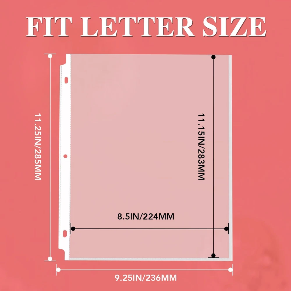 Sheet Protectors: The sheet protectors come in a set of 300 sheets and are ideal for standard Letter size paper, i.e., 8.5 x 11 sheets. The page protectors fit standard 3 ring binder. VISIBILITY: The clear checkered surface reduces glare and makes it easy to read the text and images in your documents. It also provides excellent visibility. Makes viewing the archive very easy. Documents and photos will not fade and can be stored for a long time. Easy to use: Wide loading binder sleeve opening makes it easy to keep documents, copy paper, photo paper, records, recipes, references, business documents and photos inside the protective sleeve. HIGH QUALITY: Made of acid-free, PVC-free polypropylene , our paper protectors are thick enough to provide long-lasting, durable protection for documents. Hole lines are reinforced with white polypropylene reinforcement strips for extra strength and durability. MULTIFUNCTIONAL: Clear sheet protectors are ideal for keeping and organizing recipes, photos, important documents, certificates and sheet music. Your documents can be easily put in and taken out, perfect for daily use, a great addition to your office and school supplies.
