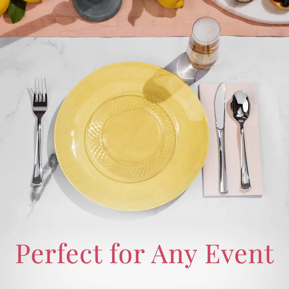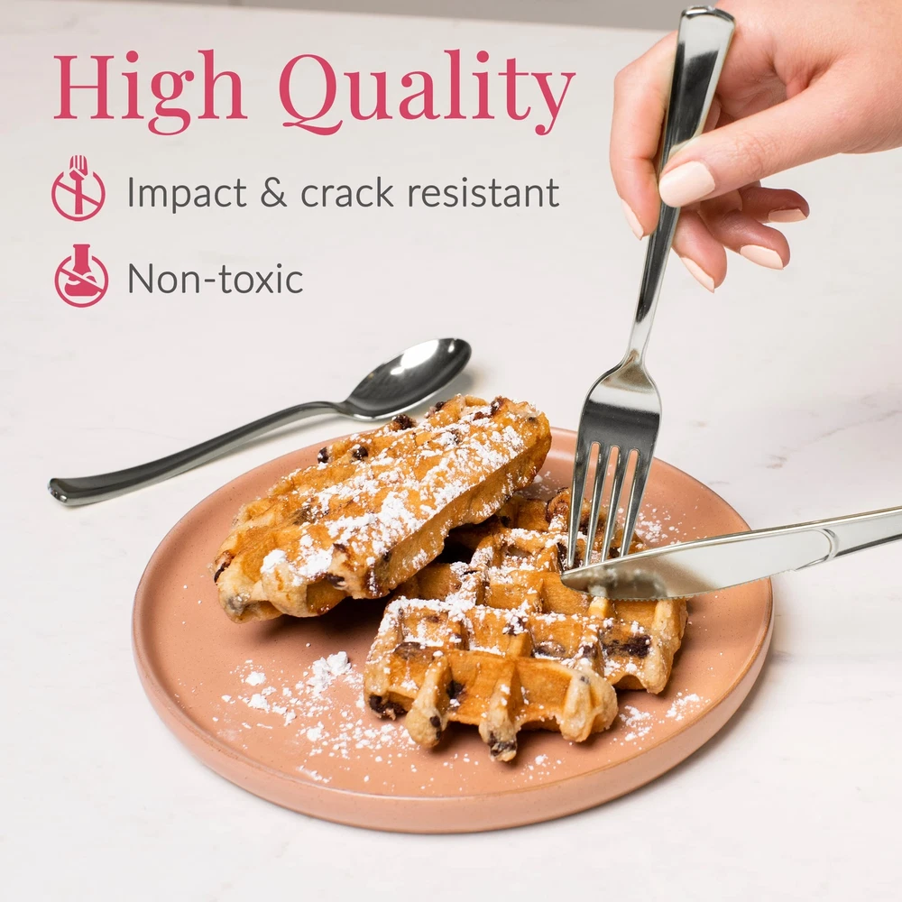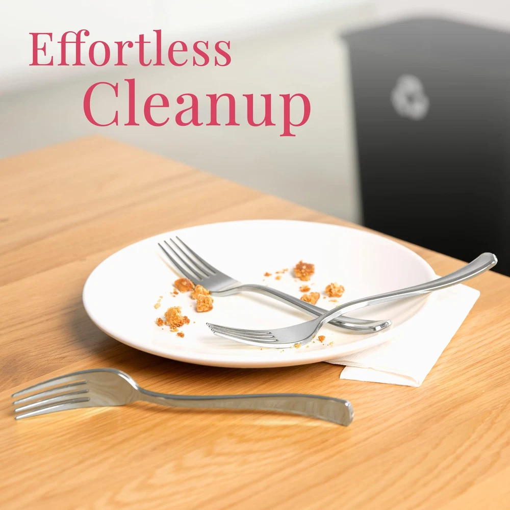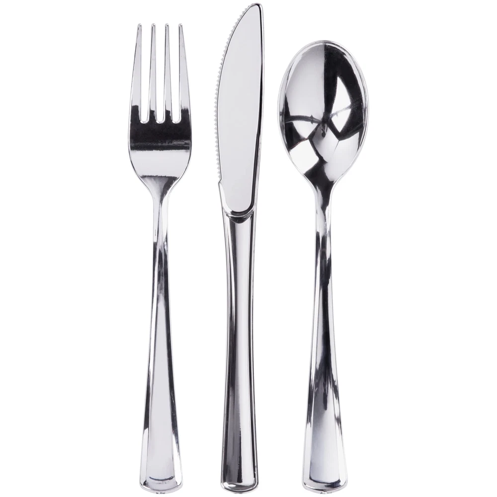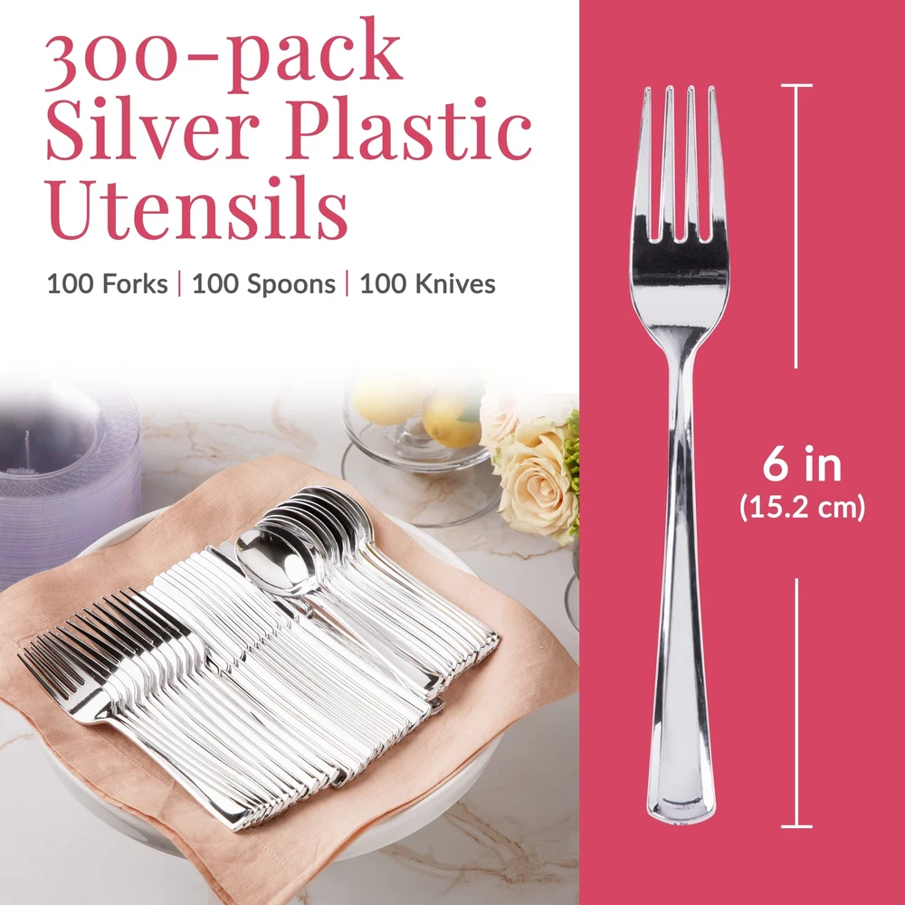 Set the table with flair using Silver Plastic Flatware Set. Its sleek handles with metallic finish will convince your diners it is the real deal. Including forks, knives, and spoons, you'll have enough silverware to serve plenty of guests at your wedding, rehearsal dinner, anniversary celebration or corporate event. And when the party is over, disposable cutlery makes cleanup a cinch and worry free about expensive silverware being accidentally thrown away. 's cutlery, designed for style and comfort. SILVER PLASTIC SILVERWARE SET - This premium-quality plastic silverware heavy duty set includes 100 Plastic Forks, 100 Plastic Spoons, 100 Plastic Knives DURABLE & STURDY PLASTIC CUTLERY - Made of strong and sturdy food-grade plastic, this heavy duty plastic silverware set is durable. CONVENIENT & DISPOSABLE SILVER PLASTIC CUTLERY - This disposable silverware heavy duty set is the perfect choice for events or gatherings where washing dishes is not an option. They are convenient and disposable, making cleanup a breeze! CLASSIC DESIGN - This plastic silverware sets for parties exudes class and elegance and perfectly matches any table decor. Suitable for small and large gatherings and any type of occasion. FOR ALL EVENTS - Dress up your table with 's plastic silverware set, whether for a formal meal or bunch together at the buffet bar!