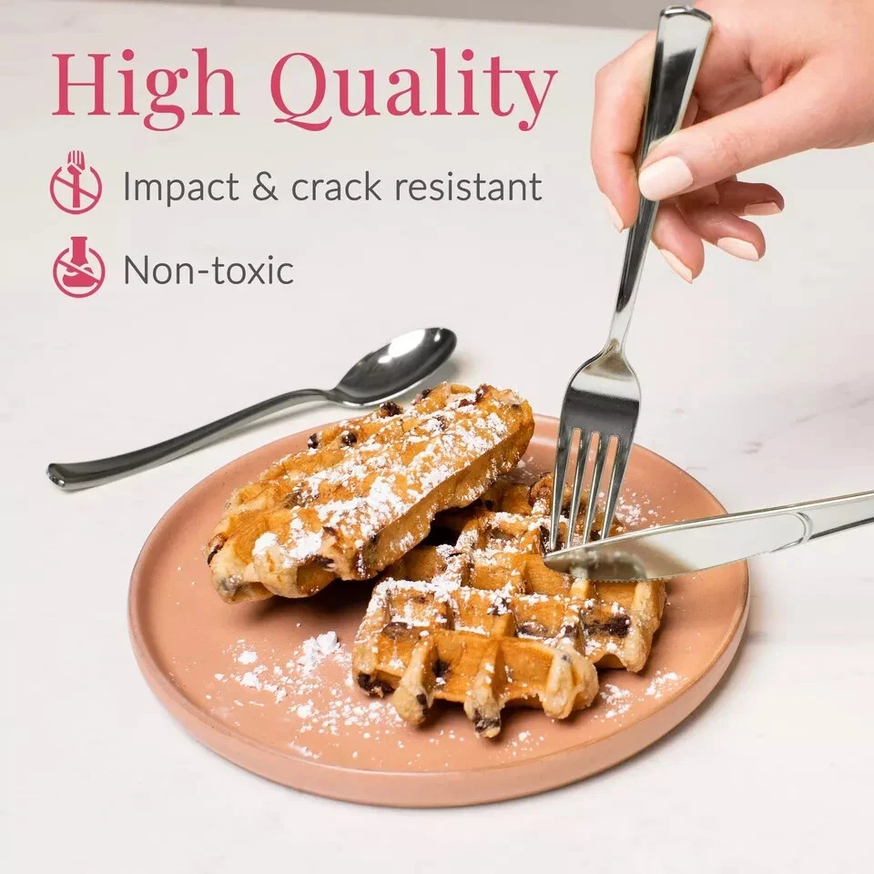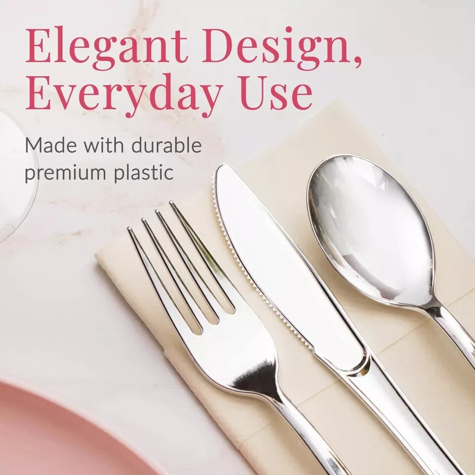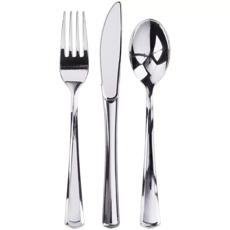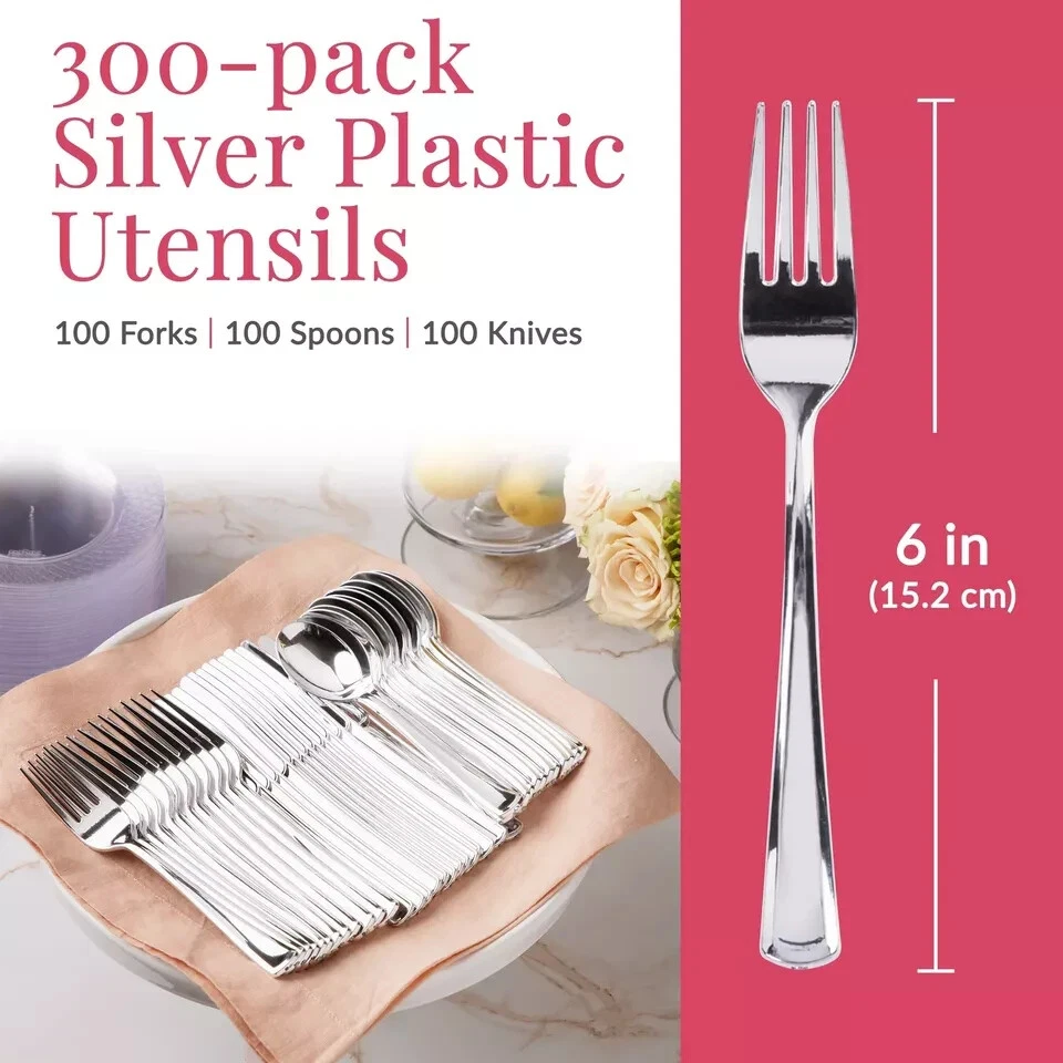 Set the table with flair using Silver Plastic Flatware Set. Its sleek handles with metallic finish will convince your diners it is the real deal. Including forks, knives, and spoons, you'll have enough silverware to serve plenty of guests at your wedding, rehearsal dinner, anniversary celebration or corporate event. And when the party is over, disposable cutlery makes cleanup a cinch and worry free about expensive silverware being accidentally thrown away. 's cutlery, designed for style and comfort. Premium Set: Includes 100 silver plastic forks, 100 plastic spoons, and 100 plastic knives; perfect for any event needing durable and stylish cutlery; ideal for weddings, parties, and large gatherings Heavy Duty Design: This heavy duty plastic silverware set is sturdy and reliable; no bending or breaking during meals; perfect for main courses, desserts, and appetizers at any event Convenient and Disposable: Enjoy the convenience of disposable silverware heavy duty enough for reuse, but easily disposable for hassle-free cleanup; great for avoiding the hassle of washing dishes Classic and Elegant Look: These silver plastic silverware pieces have a classic and elegant design; enhance your table setting and parties without the cost of real silver utensils Versatile Use: This plastic utensils set is ideal for both casual and formal settings; use it for weddings, buffets, corporate events, and family gatherings; versatile cutlery that fits any occasion