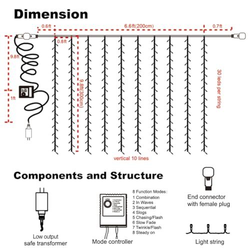 Wireless Communication Technology: Infrared Item Width: 3.86 Special Feature: Waterproof Special Features: Waterproof MPN: Does Not Apply gtin13: Does Not Apply Connectivity Technology: Custom Plug Seasons: autumn, winter, spring Batteries Included: No Included Components: remote control Water Resistance Level: Waterproof Number of Items: 1 Light Source Type: LED Light Color: Warm White EAN: Does Not Apply Batteries Required: No Voltage: 110 Volts Controller Type: Remote Control UPC: Does Not Apply Number of Light Sources: 300 Package Dimensions: 6.85 x 3.86 x 3.82 inches Color: Warm White Brand: Does Not Apply Control Method: Remote Style: Modern Occasion: Wedding, Christmas Indoor Outdoor Usage: Outdoor, Indoor Theme: Holiday,Wedding Material: Polyvinyl Chloride Manufacturer: Linhai Huanbo Lighting Co., Ltd Date First Available: July 13, 2023 Item Length: 6.85 Power Source: Corded Electric Type: Does Not Apply Item model number: HB-300CCOI Item Height: 3.82 Item Weight: 1.12 pounds