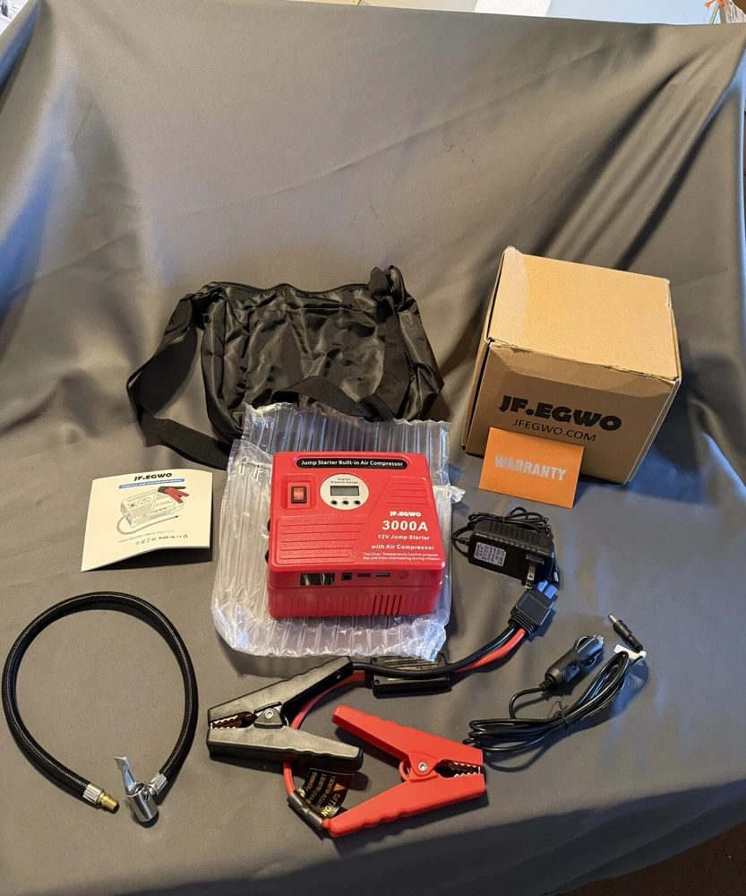 3000Amp Car Jump Starter with Air Compressor, 150PSI Tire Inflator with Digital Screen Pressure Gauge, 24000mAh 12V Auto Battery Booster (9.0L Gas/ 8.5LDiesel Engine), 2 USB Port 2 Light ✸【Super Capacity And Peak】The 3000Amp car jump starter uses a high-speed polymer battery instead of a normal starter. With the super 3000Amp peak and 24000mah capacity, it is easy to start a 12V vehicle (up to 9.0L gas engine or up to 8.5L diesel engine) , RV, tractor, lawn mower or speedboat up to 55 times. ·✸【Built-in 150psi Air Compressor】 Build-in Smart BATTERY Air Compressor, With LCD to read tire pressure when connected to your tire. And the 150psi air compressor comes with an extension air hose, 4 air inflation needles, for you to inflate car tires, bike, air bed, kayak, sports balls, air swimming pool, and more pumping products, you must have it in the summer! pumping up a standard tire in 4 minutes only. Can last 45 minutes, but please stop in every 10 minutes to cool down the air pump. ·✸【Automatic Stop and LCD screen】 Preset the value you want and the air compressor will automatically shut off when the pressure is reached, so you don’t have to worry about over inflating or low tire pressure anymore. Bulit-in digital gauge with LCD screen and ± 0.5PSI accuracy support to follow the inflating process clearly in 4 optional UNITs (PSI, Bar, Kpa, Kg/cm²). ·✸【USB Port and Emergency light】 Super power 24000 mAh li-ion recharger battery, 2 USB ports can charge Pad, iPhone and all kinds of smartphones, and Build-in two LED emergency lights with 3 models: lighting/flash/SOS, can be light up for more than 120 hours after a full charge. ✸【What You Get】 The 3000Amp car jump starter with 150PSI air compressor, Safety jumper cable, Storage bag, Ball Needles, Tapered nozzle. Short nozzle, Metal adaptor, 12V DC car Charger,110V Home Charger, user manual. We are US company, The Jump starter was design in US. We promise you 24/7 online service, 12 months warranty.100% risk-free satisfaction. I wish you enjoy with this jump starter and compressor, feel free on the way always! 3000Amp JUMP STARTER: Up to 9.0L Gas and 8.5L Diesel Engines).150 PSI AIR COMPRESSOR: Built-in digital screen pressure gauge. The 150 PSI car air pump provides you with rest-assured using experience based on the auto-shut off function. Preset the desired pressure level and start inflating job. The car air compressor will shut off automatically at the desired level. There is no need to worry about over inflating, The smart inflator for tires got your back. Note: To ensure transparency, all photos in this listing are of the actual item and its contents. Please review the images carefully, as they represent exactly what is included in your purchase. Feel free to send a message if you have any questions or need clarification. This note is applied to all our products.