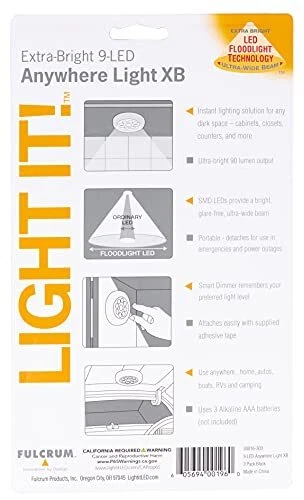 Menu 1. We require immediate payment. 2. We currently accept payment via eBay managed payments only. 3. Once payment is cleared, we will dispatch your shipment within 1-3 business days. Please refer to the "Shipping" tab for more information regarding shipping speed to your destination. , 30016-303 9-LED Anywhere Light XB, Black, 3 Pack Product description One Touch Operation -- Push the center of the light to turn it on and off LED Floodlight Technology – Provides an ultra-bright, glare free, wide beam of light w you need it most Install Anyw -- Sticks to a variety of surfaces, adhesive strips for easy installation included LED Bulb – 9 energy efficient LED bulbs provide ultra-bright light that never needs replacing Battery Operated – Operates for up to 100 hours on 3 AAA batteries (Not included) Uses LED floodlight technology which is ultra-bright, glare free and wide beam Uses 3 AAA batteries (not included) so no hardwiring is required PLEASE MESSAGE US IF YOU HAVE ANY OTHER QUESTIONS, AND MANY THANKS FOR READING ALL OF THIS. Copyright ©#. All Rights Reserved.