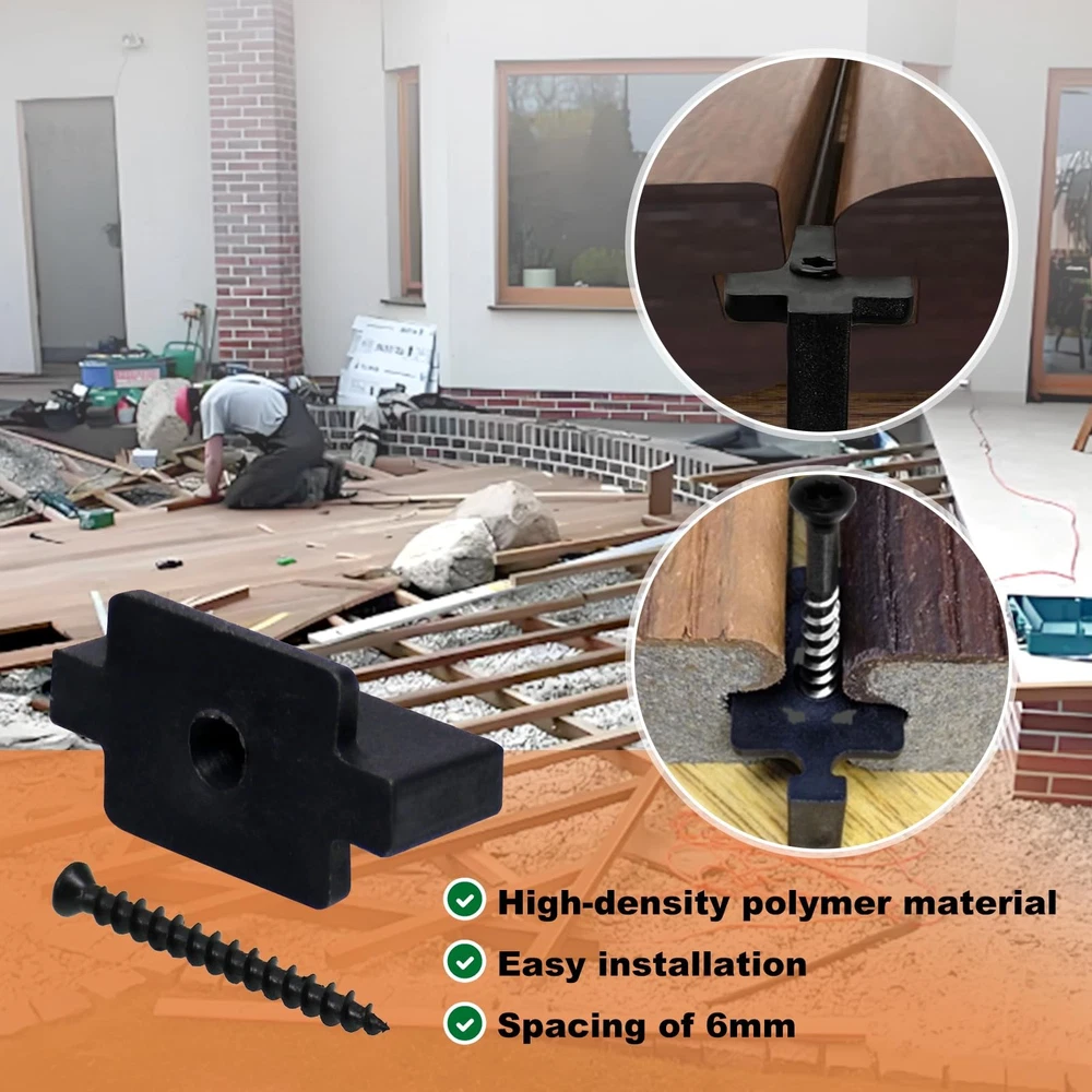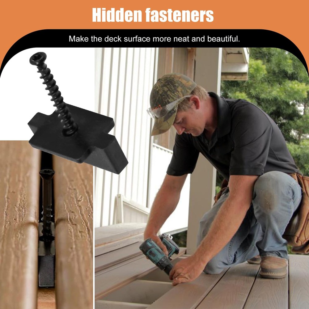 Description: 【Features】 Suitable for installing grooved composite panels for easy installation. Provides the correct spacing between deck boards and secures the deck. 【Material】 Hidden fasteners made of high-density polymer materials, durable and corrosion-resistant. 【Contents】High-quality hidden fasteners with 300 pre-installed screws, 1 driver drill bit, stainless steel deck screws are provided in the hidden fasteners to improve durability and installation efficiency. 【Installation】Align and install the first row of hidden fasteners in the center of each joist, it is recommended not to fully tighten the fasteners. Next, insert the second layer of boards and install the second row of fasteners the same way, then tighten the first row of hidden fasteners. 【Spacing】 The thickness of the middle convex buckle part is 6mm, which provides sufficient spacing for installing grooved composite panels. Note: Please allow 1-3CM differs due to manual measurement. Please tell us first when you have any problem, we will give you the best service and solve the problem ASAP. Thank you so much. Efficient & Easy Installation: The fasteners simplify the deck installation process. With 250 pieces of hidden fasteners, you can cover large areas efficiently—approximately 240 square feet for joist spacing of 12 inches or 288 square feet for 16 inches. The user-friendly design makes it easy for DIYers and professionals alike to create a beautiful, high-quality deck without the hassle of visible screws Durable & Long-Lasting: Made from high-density nylon material, these fasteners are strong, corrosion-resistant, and built to last. The included stainless steel screws ensure secure installation and long-term stability for your deck. The black-baked paint finish on the stainless steel screws adds extra durability, ensuring your composite deck remains stable and secure for years to come Wide Compatibility & Versatility: Our hidden fasteners are compatible with various decking materials, making them a versatile solution for all your decking needs. Whether you’re installing a composite deck or a traditional wooden deck, these fasteners are designed to work perfectly, ensuring a tight, firm fit for a stable, long-lasting deck Seamless & Aesthetic Design: Enhance the beauty of your composite deck with our hidden deck fasteners. These fasteners are specifically designed to eliminate visible screws, creating a sleek, clean surface. They provide a seamless, fastener-free appearance that improves the overall aesthetic of your outdoor space, giving it a polished, professional look Installation Tips for Best Results: These decking fasteners are suitable for both wood deck frames and grooved composite decks. For the best results, install the first row of hidden fasteners in the center of each joist, but do not fully tighten them. After installing the first row, insert the second row of fasteners, and then tighten the first row. This ensures proper alignment and a secure, stable deck structure