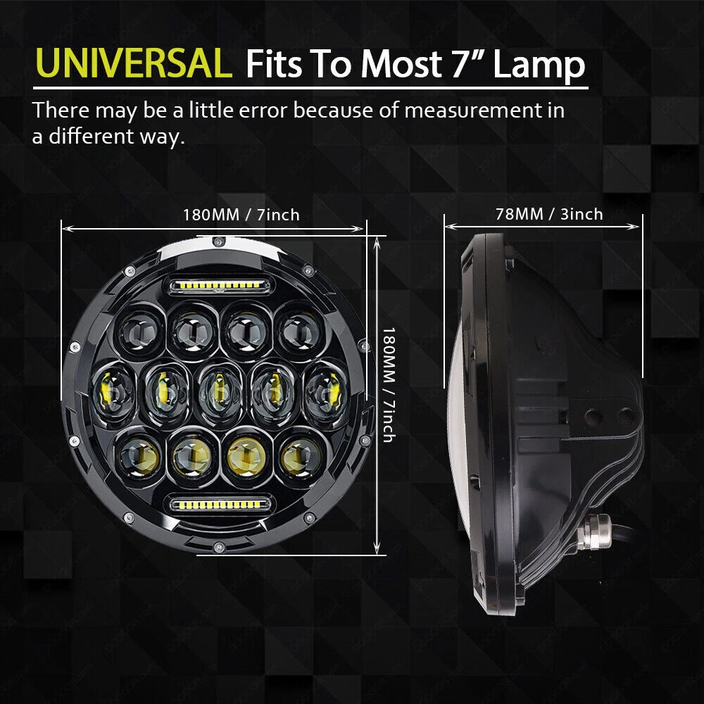 Domestic order will delivery from US stock.For International Orders, items may be shipped from our warehouse in South China. Both are the same products and same warranty. Package included: 2PCS 7 inch Round LED Headlight 2PCS H4-H13 Adapter (Installation instruction is NOT included) 300W Pair 7 inch Round LED Headlight Hi/Lo DRL for Jeep Wrangler JK LJ TJ CJ DOT Domestic order will delivery from US stock.For International Orders, items may be shipped from our warehouse in South China. Both are the same products and same warranty. Package included: 2PCS 7 inch Round LED Headlight 2PCS H4-H13 Adapter (Installation instruction is NOT included) Specifications: Housing Color: Black Voltage: DC12V-30V Color Temperature: 6000K LED Power: 300W 300W Per Piece High Beam w/ Projector 200W Per Piece Low Beam w/ Projector Luminous:30000LM (High Beam) 20000LM (Low Beam) Beam:High Low beam + DRL Life Span: 80000+ hours Newest : Halo Angel Eye Headlights Energy Saver 60% Lower Consumption (Low Energy Consumption means Low Fuel Consumption) Replaces 7" Inch Round: H6024 OEM Sealed Beam Housings Material: Die-cast aluminum housing, clear hardcoated PC lens Size: 180mm x 180mm x 82mm / 7.09" x 7.09" x 3.23" IP68 Waterproof Features: 300W LED light has low beam, high beam and DRL Turn Signal function. Perfect sealed to prevent moisture and water build-up. Fit most of headlights bucket without modification. Quick and convenient installation, just plug and play. Can be applied to SUVs, Project Vehicles, Watercraft, Off Road 4x4, Mining Vehicles, Heavy Equipment, Trucks lights, Jeeps, Motorcycles, Snowmobile, etc. About the Adapter: They might be slight flickering cuz the voltage instability characteristics of JEEP WRANGLER rather than headlights themselves. You couldn\\\\'t notice the original halogen headlight flickers because of luminance not strong enough. Be aware of that,Plug the headlight first,if the headlights are not flickering,just keep the adapter away. Application: (Including but not limit the following applications) Fit For Any Vehicle models with 7 inch Round headlight,such as: Fit For Harley Davidson FLD 2012-2013 Fit For Harley Davidson Touring Models 1994-2013 Fit For Harley Davidson Softail Models 1991-2013(with head lamp nacelle kit) Fit For 1997~2006 Jeep Wrangler TJ 2 Door Fit For 2004~2006 Jeep Wrangler LJ unlimited (4 Door) Fit For 2007~2018 Jeep Wrangler JK 2 Door Fit For 2007~2018 Jeep Wrangler Unlimited JK 4 Door Fit For 1981-1985 Jeep CJ-8 Scrambler Fit For 1976-1986 Jeep CJ-7 Fit For 1963-1978 Jeep Wagoneer Fit For 1969-1981 Chevy Camaro Fit For 1990-1997 Mazda Miata MX5 MX-5 Fit For 1976-1981 Honda Civic Fit For 1971/1976 Ford Custom 500 Fit For 1969-1974 Ford F-100 Pikcup Fit For 1975-1979 Ford F-150 Fit For 1969-1980 Toyota Corolla Fit For 1979-1987 Toyota LandCruiser Fit For 1979-1981 Toyota Pickup Fit For 1974-1979 Oldsmobile Omega Fit For 1964-1974 Plymouth Barracuda Fit For 1963-1976 Plymouth Valiant Fit For 1997 Land Rover Defender 90 Fit For 1995 Land Rover Defender 90 Fit For 1995 Land RoverRange Rover County Classic Sport Utility 4-Door Fit For 1987-1995 Land Rover Range Rover Fit For 1997-2015 Jeep Wrangler Fit For Land Rover 90/110 1983 to 1991 (including 2.5N/A, 2.5 Turbo, V8) Fit For Land Rover 90/110 Defender 200 Tdi Fit For Land Rover 90/110 Defender 300 Tdi Fit For Land Rover 90/110 Defender Td5 Fit For Land Rover 90/110 Tdci Fit For Hummer H1 H2 (2003~2009) (H2 needs 9007 male to H4 female adapter, package not included) Fit For Lada 4x4 urban Niva Fit For UAZ Hunter Fit For Suzuki Samurai Fit For nissan Fit For Kenworth T-2000 1998-2010(Buyer Note, Our Headlight plug is H4,H4-h13) Fit For Puch G and Mercedes G models Item Specifics Superseded Part Number 7 inch LED Headlights Halo For JEEP JK JL TJ LJ Fitment 10 For Ford F-100 F-150 F-250 F-350 Pickup Fitment 11 For Ford Falcon Fiesta Granada Mustang Sprint Pinto Housing Color Black Interchange Part Number H4 H5024 5024 6012 6014 6015 H6017 H6024 Assembly Type Sealed Certifications CE Bulb Size H4 (9003) Lens Color Clear Other Part Number Motorcycle For Yamaha Harley Davidson Honda kawasaki Brand Unbrand Bulb Type HID Warranty 5 Year Country/Region of Manufacture United States Ballast Included Yes Manufacturer Part Number RA-CWA14CEWA Headlight Style Halo Projector Fitment 12 Truck, 4x4 off-road vehicle Fitment 13 Kenworth T-2000 1998-2010 Color Temperature 6000K - 6500K Angel Eyes Light Color white (DRL) OEM Replace H4 9003 HB2 H13 9008, 6012/6014 6015 H6017 H6024 Working temperature -40~ 85℃ Material Aluminium heat sink body Waterproof rate IP68 Payment 1.We accept PayPal only via eBay Secure Check-Out. 2.Payment is expected within 7 days of auction close. Unpaid Items will be forfeited per eBay . 3.Immediate payment needs to be processed for items with Add to Cart option so that a Shipping 1.We do everything we can to ship your orders out as soon as possible. 2.Shipping and Handling: -->NOTE:Additional shipping fee will be charged for buyers from Puerto Rico, Hawaii, Alaska, Guam, the U.S. military address of the United States and The nonnative American address Please contact our customer service for the details of extra shipping fee,thanks. -->For domestic economic shipping,It normally takes 2-8 days for delivery.we mayship your order(s) from different warehouses for expedited delivery as weutilize altemative warehouse across the Continental United States.You may upgrade to UPS 3-day Selected which delivery time is typically 1-3 business day. -->For International Orders,items may be shipped from our warehouse in south China. Both are the same products and same warranty. Duties and taxes may apply. Pleasa check with your country’s Custom and eBay policy for more information. Returns Out 60-day Satisfaction Guarantee assures our customers that they will receive all orders promptly and exactly as described. In addition , it allows customers to return new and unused products in their original factory conditio