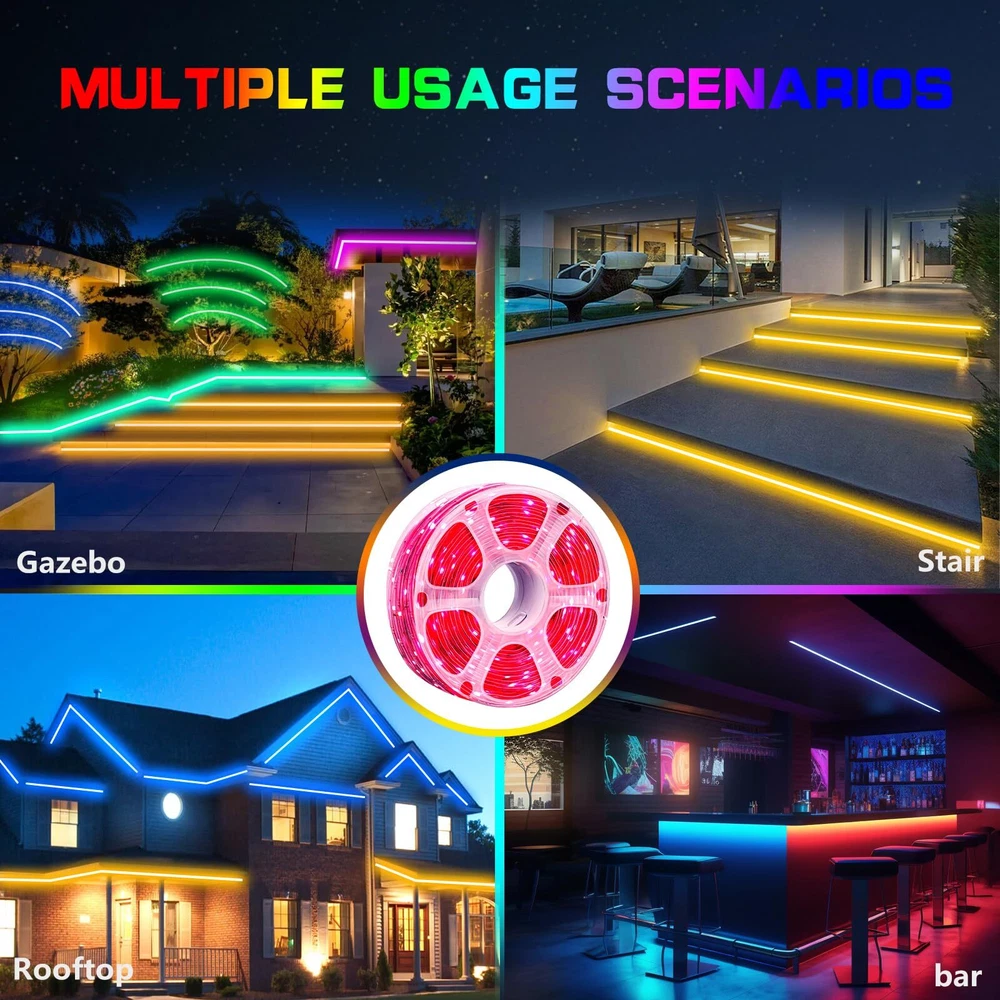 Our 300f LED strip lights come in 2 rolls, It offer a long option for adding decorative lighting to your outdoor spaces, No extra wiring, cleaner, simpler and more convenient These lights have a color changing feature that can be synced to music, The APP plays your favorite music and Outside Led Strip lights waterproof colors sync with the music. as well as a timer for convenient on/off control The DuoCo Strip App allows for easy control of the lights using your smartphone, and the included 2.4G RF remote has a control distance of up to 100ft Both the LED strip and control box are IP68 waterproof and come with strong double sided adhesive tape for easy installation This product includes 2 roll 150 Feet Waterproof Led Strip ,a UL listed 24V power adapter, a Control Box, a 2.4G RF Remote, User Manual