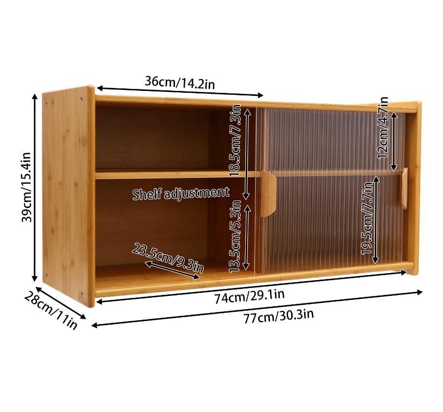 30.3" Kitchen Pantry Cabinet with Doors Wall Mounted, Countertop Cupboard 2-Tier Wall Mount Sideboard Storage Cabinet , Food Pantry Wall Cabinet, Log Color Cupboard Specification Material: Bamboo Wood, Tempered Glass Color: Log Color Style: Modern Shape: Rectangular Assembly Required: Yes Surface Treatment: Painting, Polishing Mounting Type: Wall Mount, Countertop Number of Tiers: 2 Total Load-Bearing Capacity: 50kg/110.23 lbs Adjustable Height Range: 6.5cm/2.56in Cabinet Depth: 23.5cm/9.3in Inner Height: 18.5cm/7.3in, 13.5cm/5.3in, 12cm/4.7in, 19.5cm/7.7in Inner Length: 74cm/29.13in Single Compartment Length: 36cm/14.2in Product Size: 77*28*39cm/30.3*11*15.4in Package Size: 88*44*13cm/34.65*17.32*5.12in Gross Weight: 12.5kg/27.56 lbs Net Weight: 12kg/26.46 lbs Package Included 1* Kitchen Pantry Cabinet All Accessories for Installation Details High-quality Bamboo Wood and Tempered Glass Make It Sturdy and Durable, Wear-resistant, Anti-corrosion, and Rust-resistant, Ensuring a Long Service Life The Four Compartments with Adjustable Shelving Create Ample Space for Bowls, Plates, and Spice Jars, While Removable Interior Panels Let You Reconfigure the Layout Based on Changing Needs Its Thickened Material and Strong Fixation Guarantee a Solid Structure Giving It a Maximum Load-bearing Capacity of About 110.23 Lbs to Bear Kitchen Utensils with Ease Application This kitchen pantry cabinet is suitable for kitchen, dining room, or living room, etc. for storing kitchen utensils such as dinner plates, bowls, spices, bakery items, plates, cups, and other daily items. Featuring a clear door for at-a-glance inventory and convenient access, along with two spacious tiers, it provides the storage space you need. Key Features Convenient Life: The transparent glass cabinet door design not only effectively prevents dust but also makes the items inside the cabinet clear at a glance, saving time searching for items. The smooth handle makes you open the door more quickly and conveniently. Versatile Mounting Design: Designed for both countertop placement and wall mounting, this product adapts to your space requirements. The necessary hardware is included, and the pre-drilled mounting holes combined with the straightforward screw-fastening design enable quick installation without the need for tools. Meticulously Designed: The smoothly rounded edges are meticulously crafted to prevent skin irritation and ensure comfortable handling. The cabinet door groove can improve with repeated use, providing progressively smoother opening and closing over time. Payment Delivery details Terms of sales About us Contact us Payment We accept ebay payment 。 Fees such as import duties, taxes are not included in the item price or shipping costs. These charges are the buyer's responsibility. Delivery details Shipping: 2-9 working days to: USA Terms of sales We maintain high standards of excellence and strive for hundred percent customer satisfaction. Feedback is very important to us. We hope that you contact us immediately before you give neutral or negative feedback, so that we can address your concerns. It is impossible to address issues if we do not know about them! About us Your satis faction is our ultimate goal. We work hard to earn your trust and future business. Our certified technicians have tested each item before shipping. The unit comes with 1 year limited warranty on all manufacturing defects. a) If you receive a defective item, you may return it or ask for a discount. Please contact us within 14 days after you receive the package. b) What you returned must be intact and in its original packaging as re? u. Customer is responsible for shipping costs of the returned item. c) We will cover the cost of shipping back t with the shipping rate indicated in the registration page. We will send you a new unit or refund the full payment you paid. Thank you. Contact us Business Hour Business Hour: Monday To Friday: 8:30 AM to 5:00 PM (Beijing China time) Due to time zones, our reply to your questions may not be immediately. But within above working time, we will reply your email within 24 hours. If it's non-workdays, please kindly be patient and wait till Monday. Please contact us with ebay message. Please feel free to contact us if you have any questions. Monday To Friday: 8:30 AM to 5:00 PM (Beijing China time) Due to time zones, our reply to your questions may not be immediately. But within above working time, we will reply your email within 24 hours. If it's non-workdays, please kindly be patient and wait till Monday. Please contact us with ebay message. Please feel free to contact us if you have any questions. Brand Unbranded Type Kitchen Pantry Cabinet Item Height 39cm Item Length 77cm Item Width 28cm Material Bamboo Wood, Tempered Glass Color Log Color Style Modern Shape Rectangular Assembly Required Yes Surface Treatment Painting, Polishing Mounting Wall Mount, Countertop Number of Tiers 2 Total Load-Bearing Capacity 50kg/110.23 lbs Adjustable Height Range 6.5cm/2.56in Item Depth 23.5cm/9.3in Item Width (Interior) 23.5cm/9.3in Item Height (Interior) 18.5cm/7.3in, 13.5cm/5.3in, 12cm/4.7in, 19.5cm/7.7in Item Length (Interior) 74cm/29.13in Single Compartment Length 36cm/14.2in Product Size 77*28*39cm/30.3*11*15.4in Package Size 88*44*13cm/34.65*17.32*5.12in Gross Weight 12.5kg/27.56 lbs Item Weight 12kg/26.46 lbs UPC Does not apply EAN Does not apply