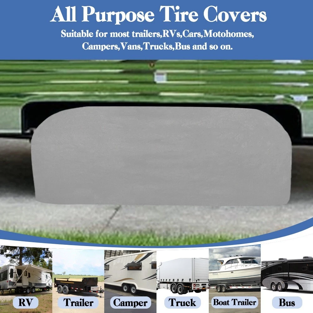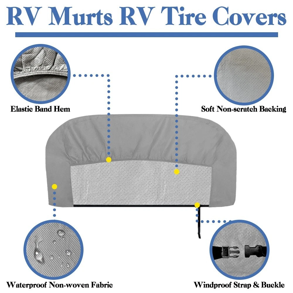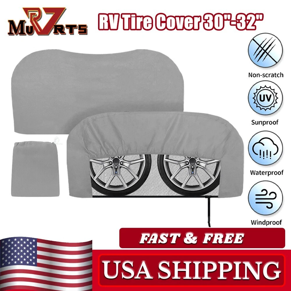 RV Murts RV Tire Covers 2 Pack, Dual Axle Wheel Cover Non-Woven Fiber Tire Wheel Protector for RV, Truck, Trailer, Camper, Boat, Universal Fit Motorhome Wheel Cover for 30"-32" Tire Diameter, Gray. Waterproof Surface Durable water resistant coating with UV stabilized treatment, long-lasting and tough to protect your tire. Soft Non-scratch Backing The inner layer is a soft, non-scratch backing that better protects the tire surface from abrasion. Adjustable Cam Buckle Adjustable cam buckle with windproof straps hold the camper tire covers securely in place, it won't be easily blown away by the wind. Windproof Elastic Cord Hem The elastic cord allows the RV tire cover to tighten and fit the tire better to prevent it from blowing away on windy days. Easy to install in seconds. About this item Wide Compatibility: RV Murts trailer tire covers includes 2 sets Dual Axle wheel covers, fits 30"-32" tandem tires in diameter. Universal used for RV, truck, tavel trailer, tandem axle trailer, camper, boat, motorhome. Suitable for all seasons. All-round protection RV Wheel Covers: Double Axle camper tire cover is made of 3 layers of waterproof non-woven material with UV-resistant, water-resistant surface to protect tires from sun damage, snow, rust, dust, corrosion and all types of weather, better protect your tires. 3-Layers Premium Material: The camper tire cover has 3-layer structures, which is more tear-resistant. Surface is durable non-woven fabric with excellent Anti-UV and waterproof performance. Middle is micropore breathable PE film, which is more breathable than vinyl. The inner layer is soft non-scratch backing, which protects the surface of the tire better. Unique Windproof Design: Equipped with elastic cord hem, windproof strap and adjustable buckle, can be adjusted to the right size at any time. The unique design has remarkably raised the wind resistance capacity, not easy to be blown away by the wind ensures more secure fit. Easy to Use: The RV wheel covers are very easy to use, can be installed in a minute. With our complimentary storage bag, is lightweight and portable. And the trailer tire cover is easy to clean, wipe only with clean water.