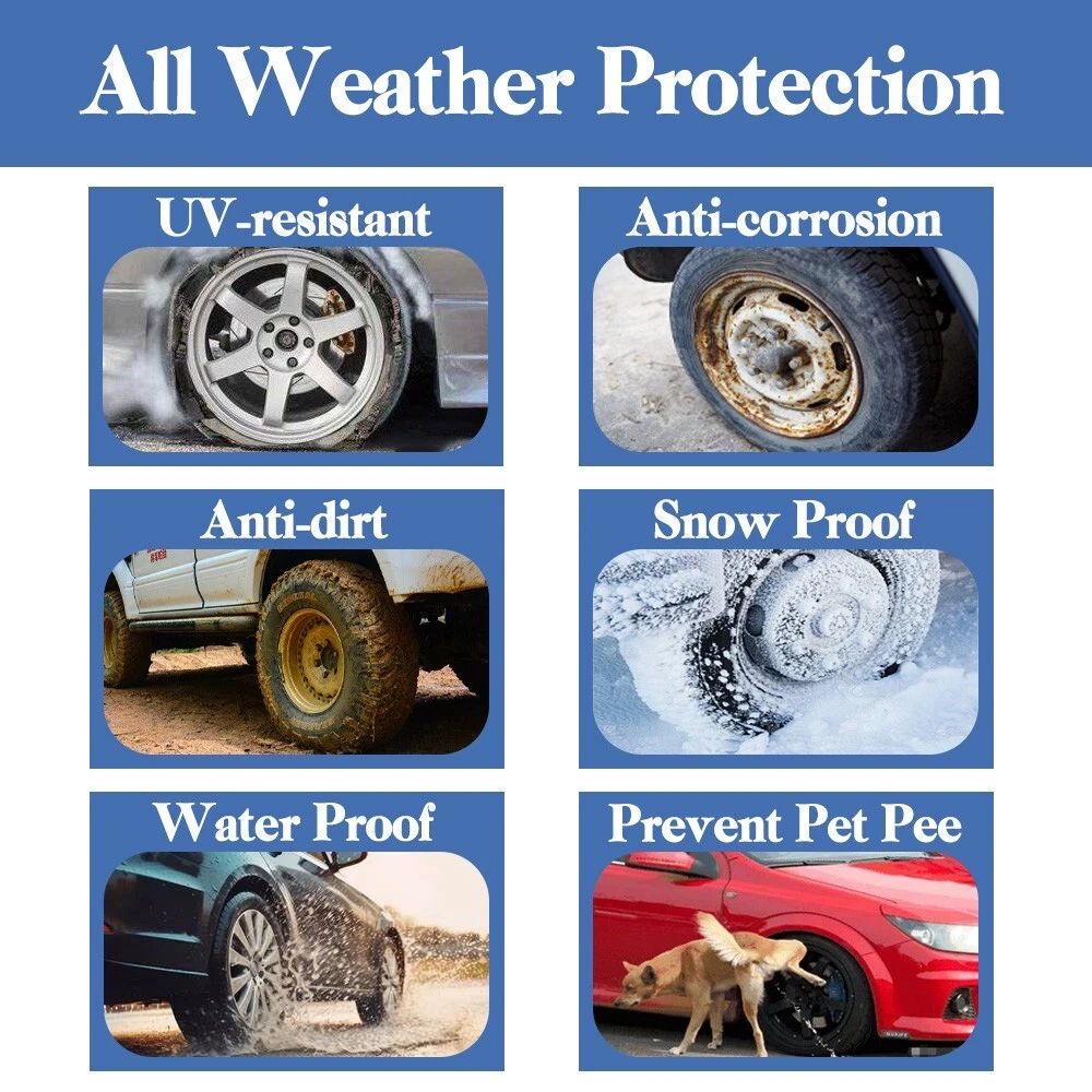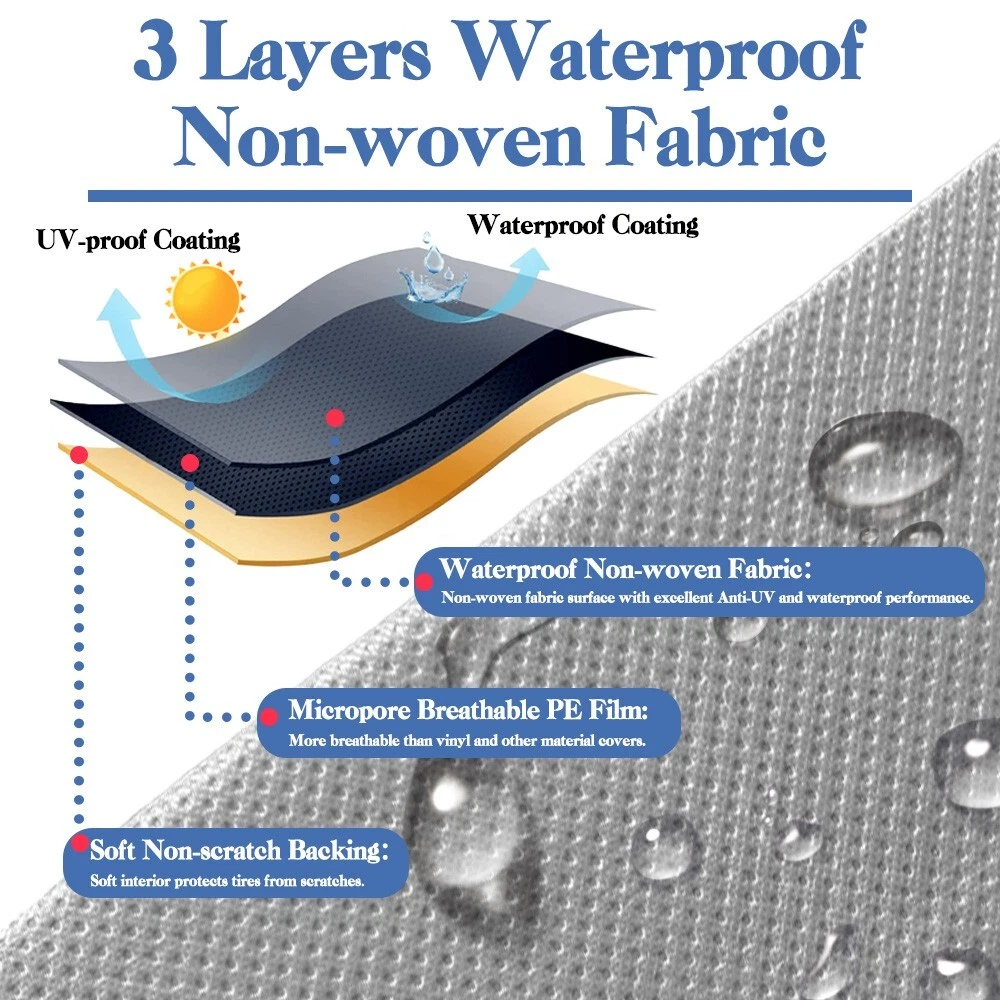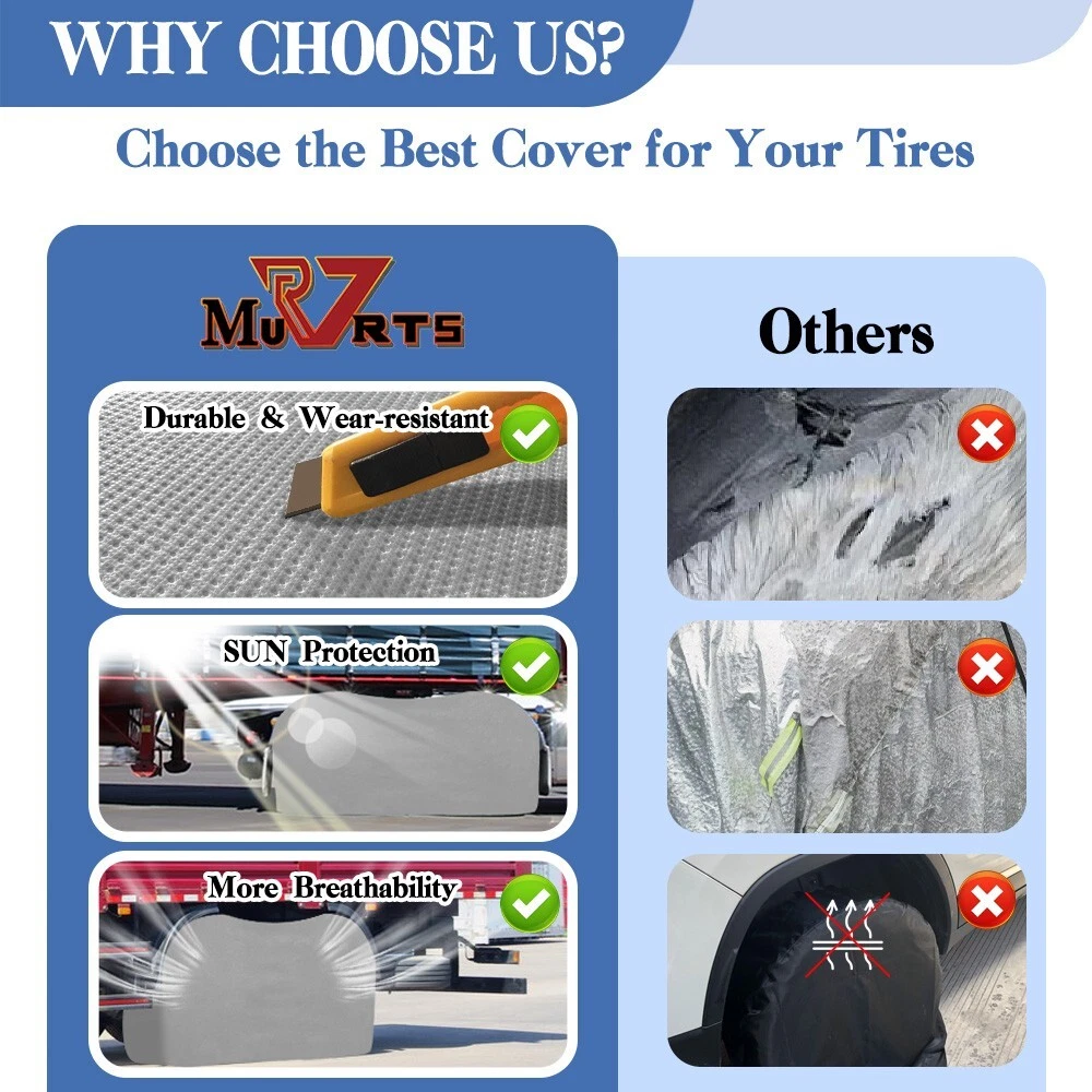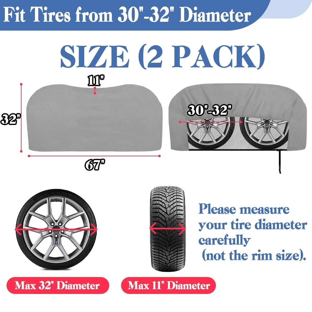 RV Murts RV Tire Covers 2 Pack, Dual Axle Wheel Cover Non-Woven Fiber Tire Wheel Protector for RV, Truck, Trailer, Camper, Boat, Universal Fit Motorhome Wheel Cover for 30"-32" Tire Diameter, Gray. Waterproof Surface Durable water resistant coating with UV stabilized treatment, long-lasting and tough to protect your tire. Soft Non-scratch Backing The inner layer is a soft, non-scratch backing that better protects the tire surface from abrasion. Adjustable Cam Buckle Adjustable cam buckle with windproof straps hold the camper tire covers securely in place, it won't be easily blown away by the wind. Windproof Elastic Cord Hem The elastic cord allows the RV tire cover to tighten and fit the tire better to prevent it from blowing away on windy days. Easy to install in seconds. About this item Wide Compatibility: RV Murts trailer tire covers includes 2 sets Dual Axle wheel covers, fits 30"-32" tandem tires in diameter. Universal used for RV, truck, tavel trailer, tandem axle trailer, camper, boat, motorhome. Suitable for all seasons. All-round protection RV Wheel Covers: Double Axle camper tire cover is made of 3 layers of waterproof non-woven material with UV-resistant, water-resistant surface to protect tires from sun damage, snow, rust, dust, corrosion and all types of weather, better protect your tires. 3-Layers Premium Material: The camper tire cover has 3-layer structures, which is more tear-resistant. Surface is durable non-woven fabric with excellent Anti-UV and waterproof performance. Middle is micropore breathable PE film, which is more breathable than vinyl. The inner layer is soft non-scratch backing, which protects the surface of the tire better. Unique Windproof Design: Equipped with elastic cord hem, windproof strap and adjustable buckle, can be adjusted to the right size at any time. The unique design has remarkably raised the wind resistance capacity, not easy to be blown away by the wind ensures more secure fit. Easy to Use: The RV wheel covers are very easy to use, can be installed in a minute. With our complimentary storage bag, is lightweight and portable. And the trailer tire cover is easy to clean, wipe only with clean water.