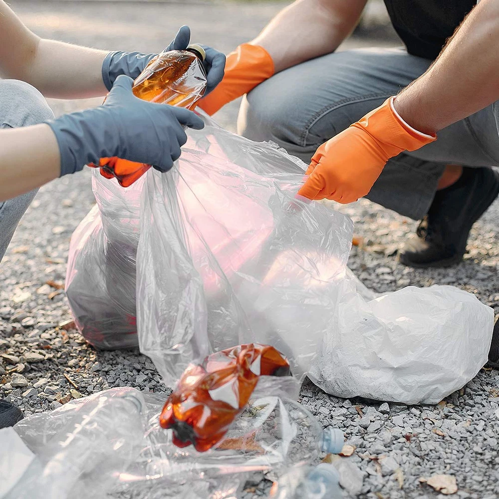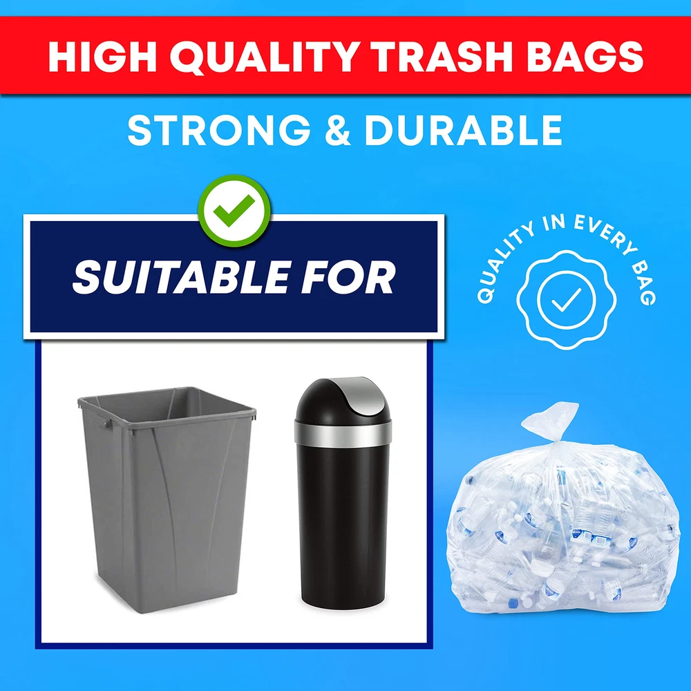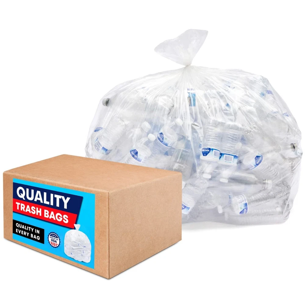 Clear plastic bags - 32-33 gallons, 33"W x 39"H. No job is too big, too bulky, or too smelly for these quality garbage bags. Clear trash bags, wider bags mean fewer bags needed for your clean-up. These large plastic bags are great for indoor and outdoor use, such as leaf bags, lawn bags, and yard waste bags. Puncture resistant, flexible, and strong enough for outdoor use. Thickness: 1.2 Mil low-density material (thicker material). Large 32-33 gallon capacity means they’ve got enough room to handle large clean ups. Heavy duty capacity - These heavy duty trash bags are designed to hold more garbage and accommodate large volumes of waste, which means less bags used and fewer trips to the dumpster. Contractor bags perfect for job sites, construction, and yard waste bags. These heavy duty trash bags are designed to hold more garbage and accommodate large volumes of waste, which means less bags used and fewer trips to the dumpster. Contractor bags perfect for job sites, construction, and yard waste bags.