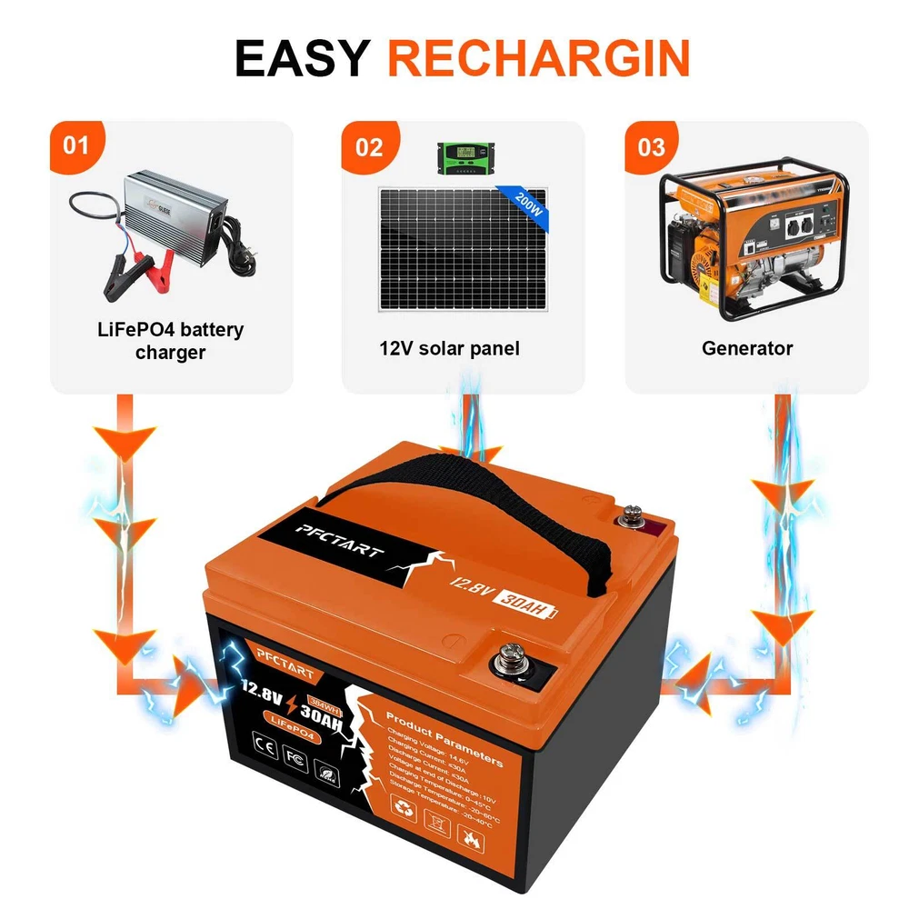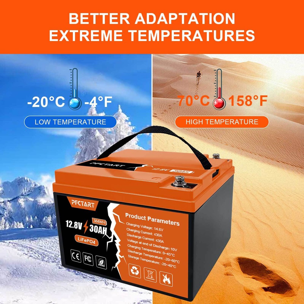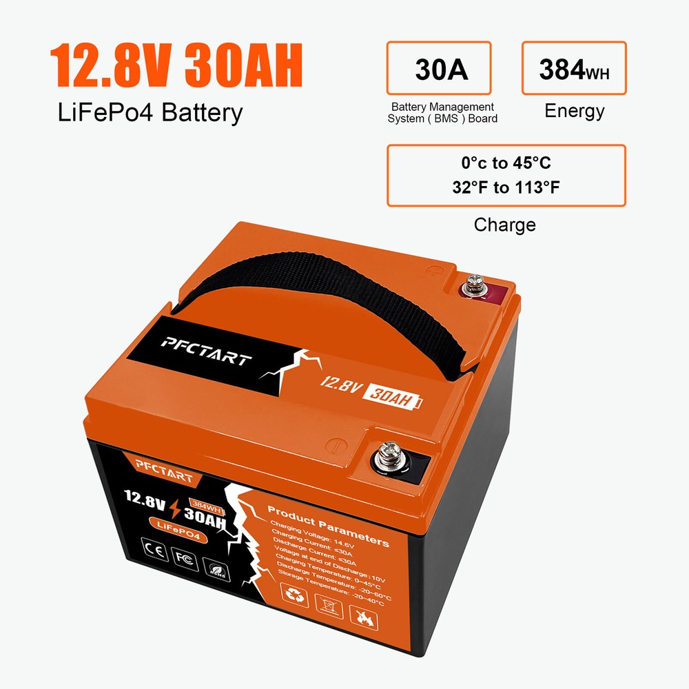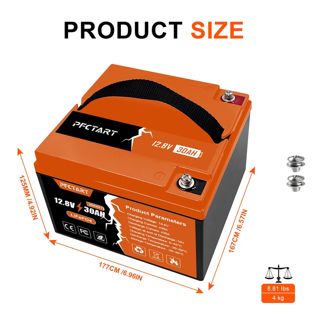 Application: Campers, Off-grid applications., RV, Camping/Hiking, Home/Garden, Marine, Solar Life Time: 10 Years UPC: Does not apply Type: Rechargeable battery gtin13: Does not apply Size: 6.96*6.57*4.92 inch Life Cycles: More than 4500 With 80% DOD Operating Temperature (Discharge): -4°F~140°F Brand: PFCTART Amp Hours: 30 AH Voltage: 12 V Operating Temperature (Charge): 32°F~122°F System Configuration: Off-Grid Battery Size: 12V Weight: 4 KG Country/Region of Manufacture: China Chemical Composition: Lithium Iron Phosphate (LiFePO4)