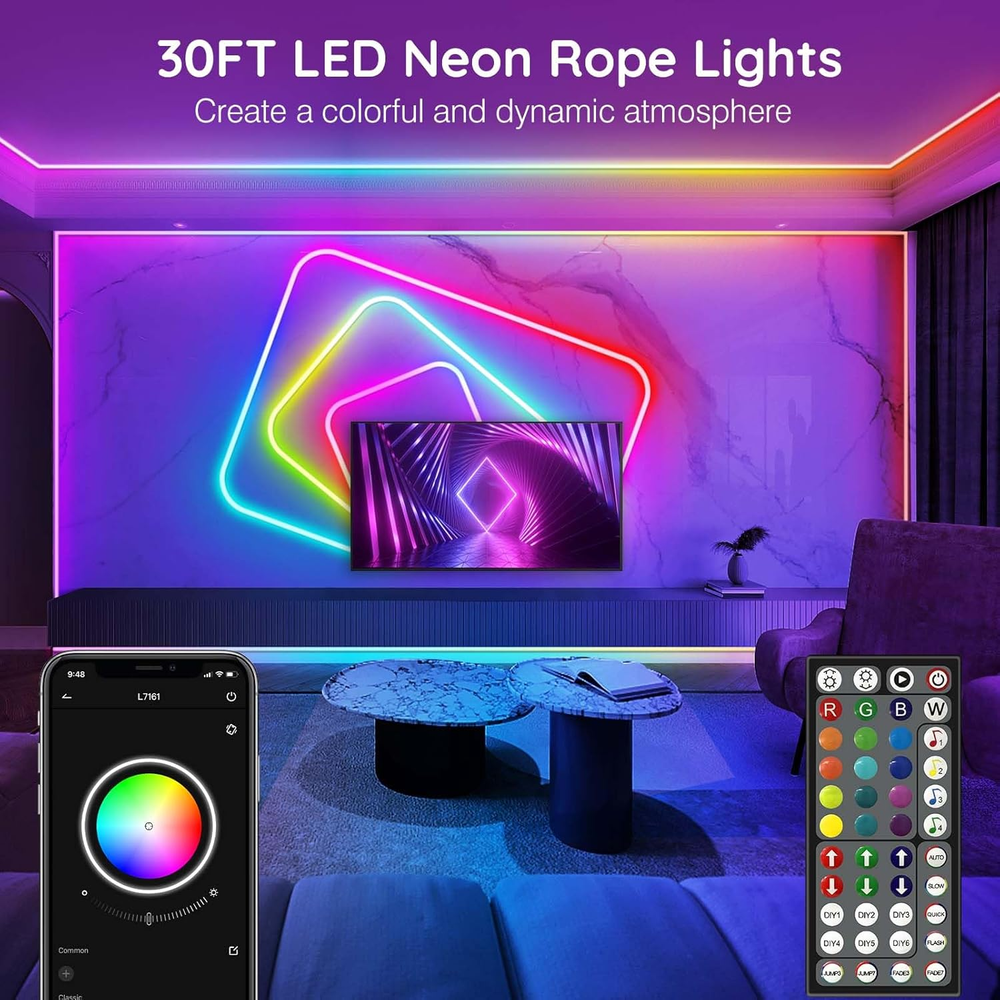 Store New Arrivals Add to Favorite View Feedback Contact Led Neon Rope Lights 30Ft,Control with App/Remote,Flexible Led Rope Lights,Multiple Modes,Ip65 Outdoor RGB Neon Lights Waterproof,Music Sync Gaming Led Neon Strip Lights Description Item model number 50FT Led Neon Rope Lights Light Source Type LED Style RGB Number of Items 1 Power Source DC Number of Light Sources 150 Country of Origin China Theme Everyday Decorations,Parties,Raves,Birthdays,Gatherings Style Number 50FT Led Neon Rope Lights Controller Type Remote Control Connectivity Protocol Bluetooth Wireless Communication Technology Bluetooth Occasion Type Kitchen, Living, Backyard, Bedroom,Rooftop, Patio Additional Features Lighting Decoration Package Dimensions 9.45 x 8.19 x 2.01 inches; 2.34 Pounds Indoor/Outdoor Usage Indoor Material Type Plastic Light Color RGB Water Resistance Level Waterproof Connectivity Technology Bluetooth Occasion Kitchen, Living, Backyard, Bedroom,Rooftop, Patio Special Feature Lighting Decoration Color RGB (Red, Green, Blue) Wattage 5 watts Indoor Outdoor Usage Indoor Voltage 12 Volts (DC) Control Method Remote Included Components Neon Rope Light/Power Adapter/Remote Control/ Style Name RGB Size 30ft-Neon Ambience Redefined: Enhance your gaming setup, living room, or bedroom with these stylish neon RGB LED strip lights; With various color combinations, you can create the perfect mood and atmosphere for any occasion Versatility and Flexibility: With its unparalleled flexibility, this neon strip can be easily bent into any shape or design, and cut to fit your desired length; Perfect for DIY neon signs or adding a pop of color to any space, these neon lights are ideal for parties, bars and decorating rooms Elevate your gaming room decor with our Neon Gaming Lights! Our flexible neon LED strip lights come equipped with music sync, let the light and frequency change according to the surrounding sound; Perfect for gamers and streamers alike, these flexible neon lights offer complete customization to suit your style Smart Design: Our neon smart LED strip lights come with a wide range of features that make them easy to use and control; With the use of app "Lotus Lantern", you can change the lighting settings and colors to match your mood and environment, and you can also use the timer switch function to turn on all the neon LED lights in your room along with the morning alarm clock Product Description AILBTON 30FT Neon LED Rope Lights Waterproof--IP65 AILBTON is a LED Strip Lights brand,Our mission is to provide customers with creative products and high quality Service, welcome to the colorful world Our mission is to provide customers with creative products and high quality service, welcome to the colorful world of AILBTON. Smart Bluetooth Rgb Led Neon strip lights Waterproof :Bluetooth App + RF Remote Control + MIC + MUSIC+Timing. There are 16 million colors to choose from, as well as a variety of automatic modes, music functions, microphone functions, alarm clock functions, etc. Widely Application &Easy Installation:30ft Led Neon Strip Lights can be used in many places, such as living room, bedroom, game room, kitchen, bar, deck, garden, or embedded in various furniture and floors, weddings and parties, etc. Note: We do not use back self-adhesive, we have a firm buckle, buckle installation only takes a few minutes to complete, you can reasonably allocate the number of buckles and installation to the path according to the pattern you need to decorate Smart APP Control by Phone 1.Download APP "Lotus Lantern" ( Google Play and iOS App Store) . 2.Make sure your is Bluetooth enabled. 3.Then Led neon strip lights automatically connect to the APP. If the neon led light strip is not displayed on the APP, it means that it is not connected, you can close the APP and re-open it to see if it is displayed; or re-open the power of the neon rope light. turn off the phone and re-connect it and perform the above 2-3 steps again. (turn on Blutooth-open the app-see if it shows). APP Group Management: When you want to control several neon light bars at the same time through the APP, you need to create several groups to control them separately, such as ( bedroom / living room / kitchen, etc.), They work at the same time or seperate , It's simple and funny. Transform your gaming room with our LED Neon gaming Lights! Perfect for decorating your gaming setup, these neon strips offer a variety of features that will take your gaming experience to the next level. With music and microphone modes, you can change the color and frequency of the neon lights in response to sound and music, creating a dynamic and immersive environment. With endless color options and customizable settings, our LED Neon Flex Lights are the ultimate gaming room decor. These neon strips are easily bendable and can be molded to fit any design or space, and can be cut to your desired length. The easy installation process makes it hassle-free to set up the lights and get gaming right away! But it's not just about the aesthetics Our Neon LED Flex Lights also offer incredible functionality. The music mode allows you to sync your lights with your favorite tunes, and the microphone mode enables you to adjust the lights based on your voice. These features are perfect for streamers looking to create a more interactive and immersive experience for their viewers. Made with high-quality materials, our neon led strip lights are designed to last. The non-heating surface ensures safety during extended use, and the waterproof design makes it easy to clean and maintain. Whether you're an avid gamer or a casual player, our LED Neon Rope Lights are a must-have accessory for your gaming room. Outdoor Neon Rope Lights waterproof The perfect addition to your outdoor decor! With an impressive IP65 waterproof rating, you'll never have to worry about weather damage, making these lights perfect for year-round outdoor use. Our neon rope led lights emit a stunning and vibrant glow that 