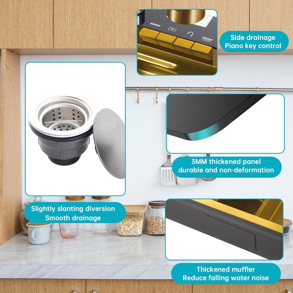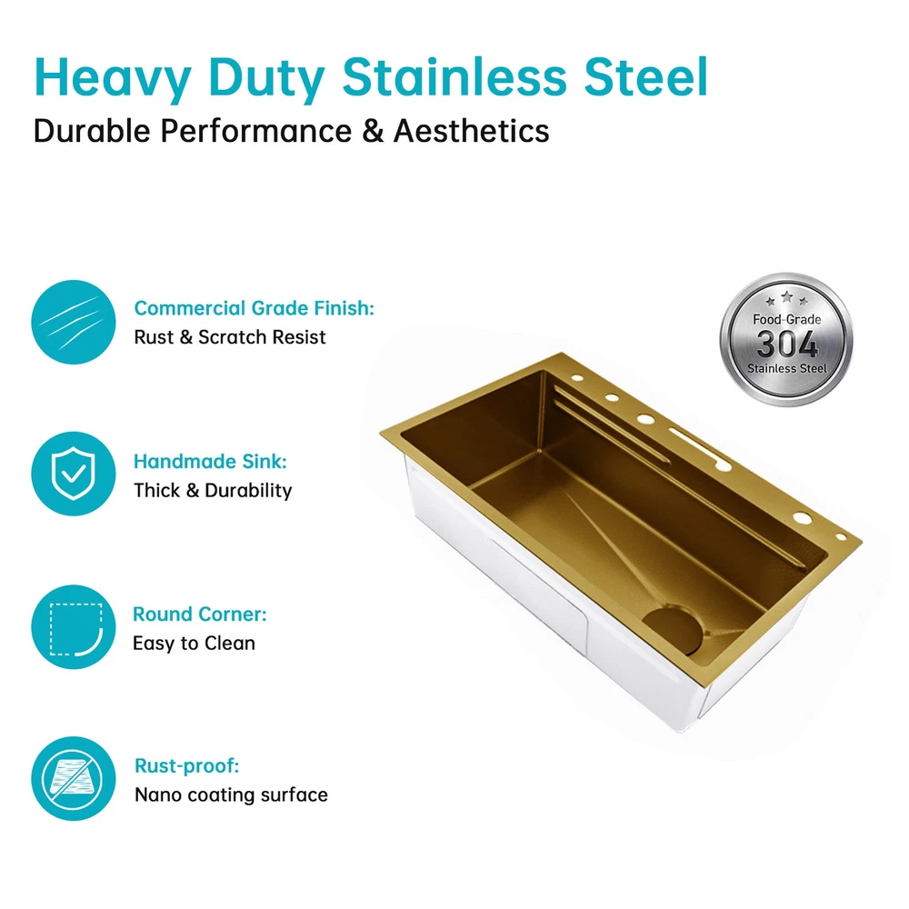 FREE SHIPPING 30 DAYS GUARANTEE PREMIUM QUALITY GOOD SERVICE Description Bullet Points: Easy Integration: Recessed design of our top mount sink makes it simple to insert directly into the pre-cut hole on the countertop, delivering a mid-counter basin installation design that blends seamlessly with the surroundings for a polished look Innovative Design: Make dishwashing and vegetable preparation effortless with this top-mount kitchen sink's multi-function faucet. With a 360 pull-out faucet, three water spray modes, and an innovative waterfall design, this sink is ideal for any kitchen Excellent Durability: This kitchen sink top mount is built to last with its high-quality 304 stainless steel composition. Its nano-coating surfaces features long-lasting rust-proof performance while maintaining a bright appearance Modernized Maintenance: Utilizing a powerful high-pressure waterflow, our top mount kitchen sink is easy maintenance. An efficient cup washer simplifies cup cleaning, while a one-touch control drain button allows for effortless drainage Flexible Use: Designed for versatility, this top-mount kitchen sink is ideal for bar counters, kitchens, laundry rooms, outdoors, and public areas, including basic accessories for all settings This kitchen sink drop in is easy to install directly into pre-cut countertop holes and features easy dish and veggie washing. With rust-proof construction and easy maintenance, it's perfect for a variety of settings. Specifications: Product name: kitchen sink top mount Product color: Gold Product size: Sink size: 750x450x220mm/29.5x17.7x8.66in Inner diameter: 700x350x220mm/27.5x13.7x8.66in Outer diameter of drain hole: 110mm/4.33in Inner diameter of drain: 90mm/3.54in Drain pipe diameter: 45mm/1.77in Sink material: 304 SUS stainless steel Sink thickness: panel 3mm/0.11in Pipe: 0.8mm/0.03in Packing list: Basin x1 Drainer x1 Drain pipe x1 Bin in basin x1 Chopping board x1 Stainless steel whale faucet x1 Angle valve x2 Hot and cold hose x2 Table control drain x1 Triangular drain basket x1 Notes: 1. Due to different lighting and screen settings, the item color may be slightly different from the picture. 2. Due to different manual measurements, please allow a 1-2cm difference in size. SHIPPING 1. The shipping rates listed are only for residential or commercial destinations in the continental 48 United States. All international sales will go through eBay Global Shipping Program.please ask us if there are any questions. 2. We only ship the item to the address that is sent to us at the time of checkout. Please verify the correct shipping address in your PayPal account before making your payment. If we ship your item to an old or invalid address and you are not able to locate the item, we are not responsible for shipping a replacement. 3. Currently, we do not ship to Hawaii, Alaska, Puerto Rico,APO/FPO/PO Boxes. 4. We use USPS & FedEx as shipping method. PAYMENT 1. We accept PayPal and all forms of credit card. 2. We will only ship to the confirmed Paypal shipping address given with the payment.responsible for shipping a replacement. 3. We do not offer local pick up service. RETURN 1. 30 days Money Back Guarantee. All of our products come with a return period of 30 days from the date of original delivery. 2. If any package that needs to be returned, please contact our customer service first to receive a RMA form. 3. All return items MUST be in brand new condition. 4. If you are not completely satisfied with your purchase or no longer need the item (if unopened) within the 30 days, we will assist you with a return for full refund minus a 20% processing fee. 5. If there is an issue of damage, please send us pictures through mail. Depending on the damage, we will take further action to solve the problem as soon as possible. 6. Please do not ship any goods to any address without our authorisation as it might lead to you not receiving your refund. [Please do not initiate a return without our authorisation as this could result in a delay in issuing your refund.