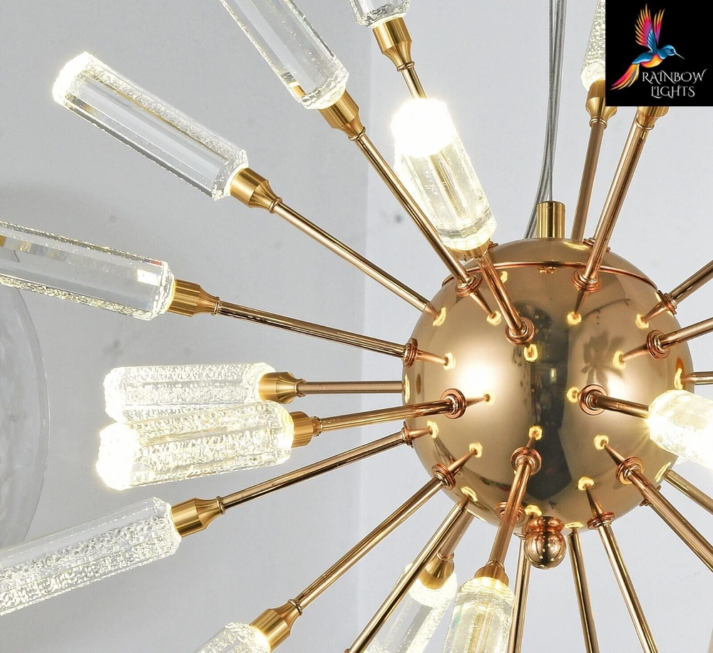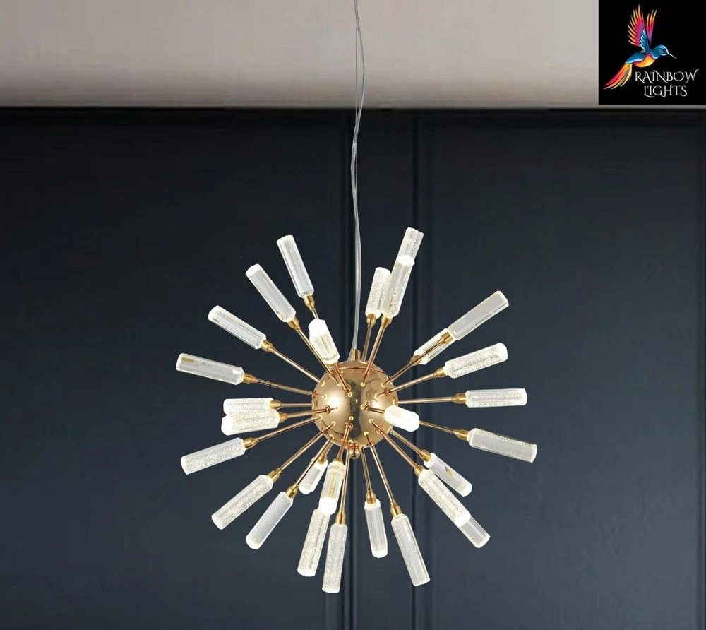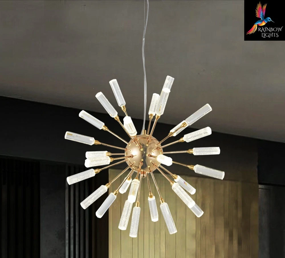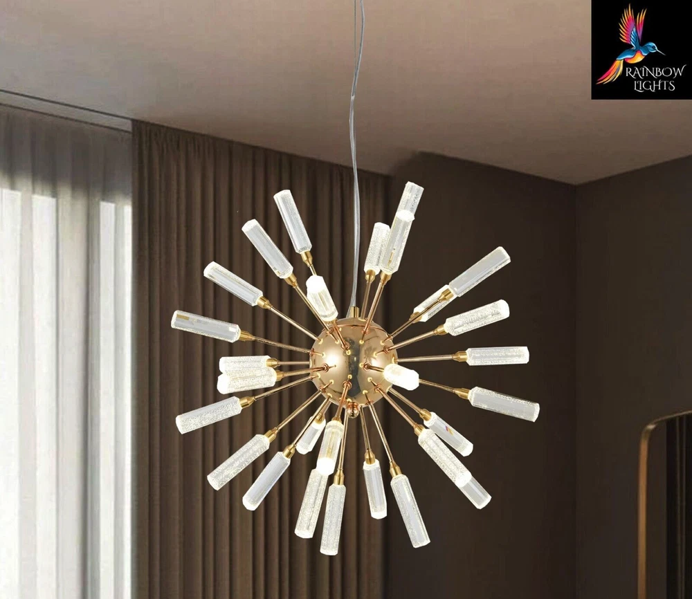 Introducing the Starburst Style Seeded Crystal Stick Sputnik Chandelier, an exquisite addition to your home decor from Rainbow Lights. The Starburst Sputnik chandelier is a unique and timeless lighting fixture, characterized by its striking design featuring multiple arms radiating from a central sphere, reminiscent of a starburst or satellite. Available in a variety of designs, sizes, and finishes such as chrome, brass, and bronze, these chandeliers complement a diverse array of interior styles. Their bold and dynamic appearance serves as a focal point in any space, including living rooms, dining areas, and entryways. Product Specifications: Condition: NEW Material: Crystal and metal Width/Diameter: 50 cm Height: Adjustable Product Type: Sputnik Light Style: Contemporary Number of Bulbs: 30 Bulb Type: LED Voltage: AC110-240V - 50/60Hz Lumens: 80-100 CCT (Color Temperature): Clear Light Source: LED Shade: 3000K (Warm White) Specific Uses: Indoor Weight: 6.6 kg Please note that the bulb is not included in the package. Crystal Chandelier Lighting - Crystal Pendant Lighting - Kitchen island Hanging Light - Dining room Pendant Light - Foyer Chandelier lighting - Bedroom Pendant light Listing and template services provided by inkFrog