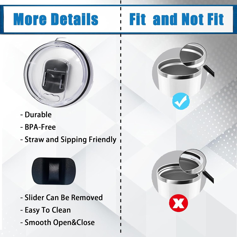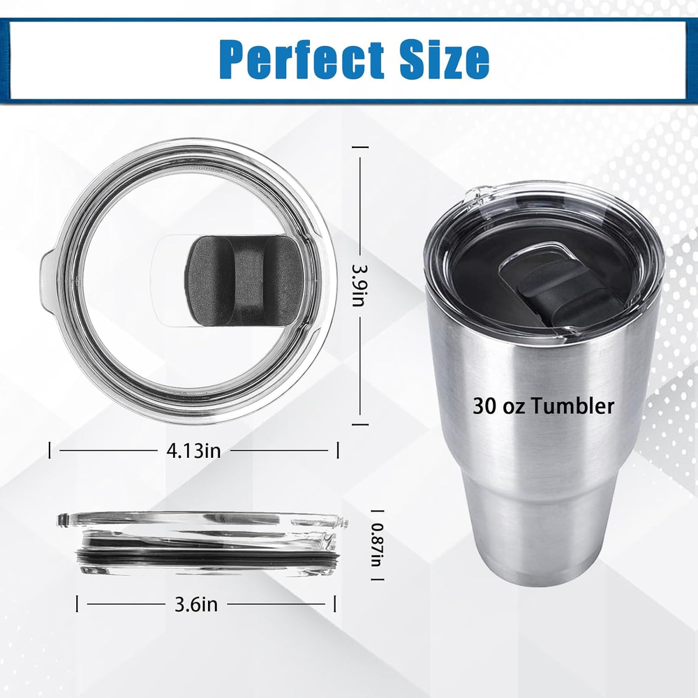 Store New Arrivals Add to Favorite View Feedback 30Oz Tumbler Lid, Replacement Lids Compatible for YETI 30 Oz Tumbler, 14 Oz Mug and 35 Oz Straw Mug- Replacement Slide/Cover,2Pcs Black Description Closure Type Snap Style Fine Number of Pieces 2 Color black Product Dimensions 0.33"L x 0.33"W Material Plastic Country of Origin China Is Dishwasher Safe No Item Weight 3.84 ounces Shape Round Is Microwaveable Yes Brand Tatibana Size 30OZ Are you tired of water splashing from your tumbler/Rambler while driving? Our tumbler lid eliminates this issue and is easy to use. No more messy accidents, no more hassle Fit most brands of 30oz tumblers with a mouth diameter of 3.6 inch (92 mm), like YETI rambler, Ozark Trail tumbler, RTIC coffee tumbler or other mugs Slide vane makes you open and close the slid tag easily; Designed with an air hole on top of slider according to airflow ergonomics Made of high-quality, shatter-resistant, and BPA-free material, It’s made from AS crystal clear plastic, BPA FREE; Sturdy and durable, You can use it for a long time.The tumbler replacement lid features a sturdy double-sealed design for smooth and secure opening and closing. It offers a tight fit to keep your drinks hot or cold for your enjoyment Please note that plastic products should avoid contact with boiling water as much as possible, as excessive temperature differences may cause cracking.If you have any questions, please feel free to contact us and we will solve them for you Product Description ABOUT US We offer the best prices around on high quality products. Our E-store includes media such as books, movies, music and games while offering electronics, toys, sporting apparel, clothing, tools, general home, garden items and more. SHIPPING We are always working hard to ensure your package arrives as soon as possible. Please understand that some factors like weather, high postal traffic, and the performance of shipping companies are outside of our control. We offer free shipping to the lower 48 states and ship within 2 business days of payment, usually sooner. We do not accept P.O. Boxes. Please provide a physical address. RETURNS We offer a 30-Day Return Policy on items which you are not completely satisfied with. You have the option for a full-refund or an exchange of the item. No returns are available on items shipped outside of the USA. PAYMENT We accept PayPal. CONTACT US This page content is yet to come Please ad us to your favorite seller and visit again later Thank You