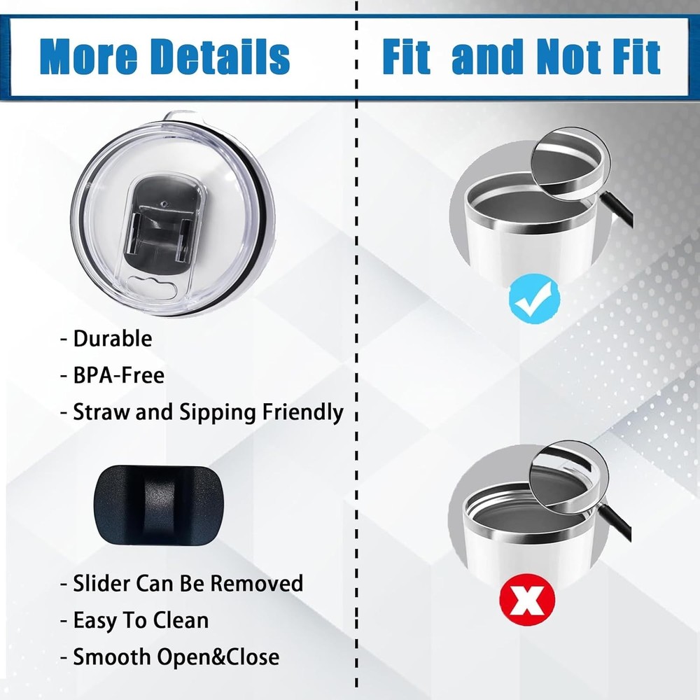 30Oz Tumbler Lid, Replacement Lids Compatible for YETI 30 Oz Tumbler, 14 Oz Are you tired of water splashing from your tumbler/Rambler while driving? Our magnetic tumbler lid eliminates this issue and is easy to use. No more messy accidents, no more hassle Fit most brands of 30oz tumblers with a mouth diameter of 3.6 inch (92 mm), like YETI rambler, Ozark Trail tumbler, RTIC coffee tumbler or other mugs Slide vane makes you open and close the slid tag easily; Designed with an air hole on top of slider according to airflow ergonomics Made of high-quality, shatter-resistant, and BPA-free material, It’s made from AS crystal clear plastic, BPA FREE; Sturdy and durable, You can use it for a long time.The magnetic tumbler replacement lid features a sturdy double-sealed design for smooth and secure opening and closing. It offers a tight fit to keep your drinks hot or cold for your enjoyment Our replacement mug lid are cost-effective and function just as the original did. Plus, you're covered by our 100% full money-back guarantee. If you have any questions about your order, feel free to contact us, and we'll respond within 24 hours