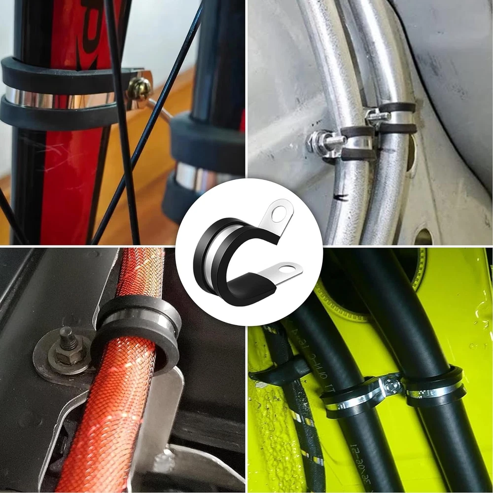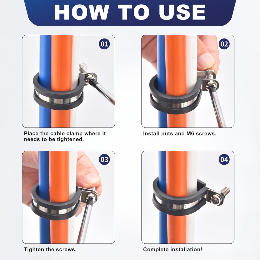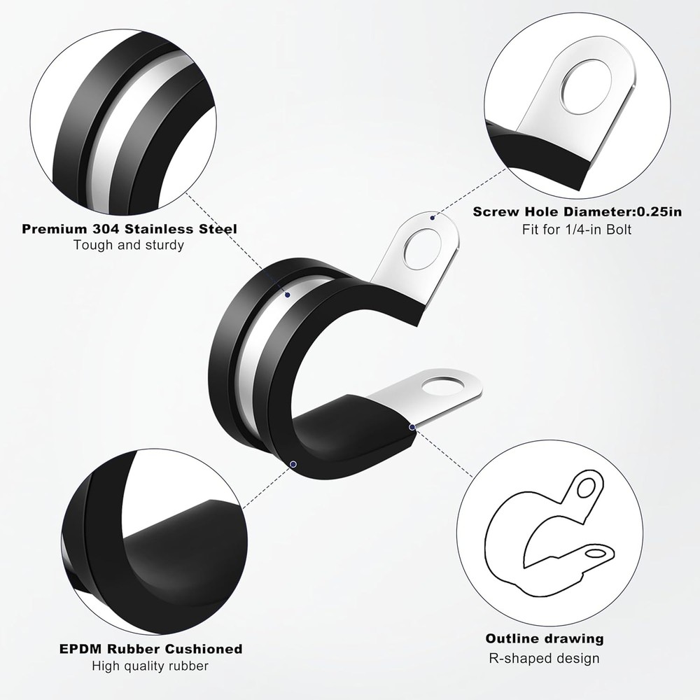 30PCS 5/8 Inch Cable Clamps, 304 Stainless Steel Inch, Black, Silver Product Details Manufacturer: TAVONUXT Item Weight: 10.9 ounces Package Dimensions: 6.3 x 6.3 x 1.57 inches Size: 5/8 Inch Color: Black, Silver Style: 30 Material: 30 Item Package Quantity: 30 Batteries Included?: No Batteries Required?: No Material: 30 Brand: TAVONUXT Color: Black, Silver Style: 30 Manufacturer: TAVONUXT Durable and High-Quality: The stainless steel cable clamps are made of 304 stainless steel and feature a EPDM-rubber-coated cushion, which provides excellent resistance to abrasion, rust, moisture, cold, and heat. These clamps are strong, sturdy, and will not rust or break. Easy Installation: The cable clamps, which can be easily installed using a screwdriver and screws. The R-shaped design allows for flexible twisting and easy control during installation and simple disassembly. Versatile Application: The clamps can be used in automotive, industrial, boat, outdoor, home decoration, DIY, RVs, and any place where vibration may occur. They are ideal for fixing and supporting pipes, wires, cables, and line management and repair. Package Includes: The package includes 30 pieces 5/8 Inch stainless steel rubber-coated cable clamps in a storage bag for easy carrying and storing.