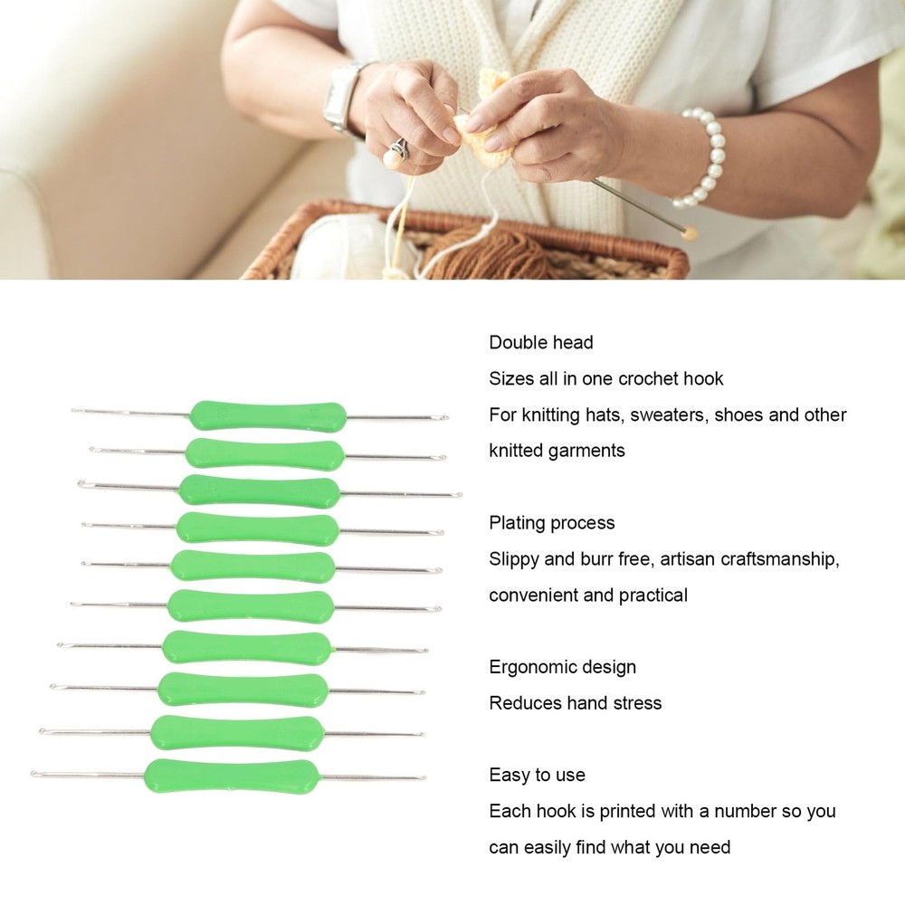 1. DOUBLE SIDED DESIGN: Crochet needles feature a double head with sizes all in one crochet hook for knitting hats, sweaters, shoes and other knitted garments. 2. ELECTROPLATING PROCESS: Double sided crochet hook is plated for a slippy, burr finish, craftsmanship and convenience. 3. ERGONOMIC DESIGN: Double end crochet needles are ergonomically designed to minimize hand stress, making them a versatile tool for crochet enthusiasts. 4. EASY TO USE: Each hook is printed with a number so you can easily find what you need, allowing you to complete complex projects with ease. 5. GREAT GIFT: Double sided crochet needles can be used in most scenarios and make a great present for a mom, wife or girlfriend who loves to knit. Specification: Item Type: Double Ended Crochet Hooks Material: Plastic, Galvanized Iron Specifications: 30 Pieces Usage: Home Use Applicable Range: Most Scenes Size: Approx. 15.8 x 1.7cm / 6.2 x 0.7in packing list: 30 x Double Ended Crochet Hooks Note: Please allow some error due to manual measurement. [DOUBLE SIDED DESIGN]: Features a dual head design with multiple sizes in one crochet hook, ideal for various knitting projects like hats, sweaters, and shoes. [ELECTROPLATING PROCESS]: Plated for a , of burrs, showcasing craftsmanship and providing convenience during use. [ERGONOMIC DESIGN]: Designed to reduce hand stress, these crochet needles are for crochet enthusiasts looking for comfort and versatility. [EASY TO USE]: Each hook is labeled with a number for easy identification, allowing for effortless completion of intricate projects with precision. [GREAT GIFT]: Suitable for various knitting scenarios, making it a thoughtful and practical present for mothers, wives, or girlfriends who enjoy knitting.