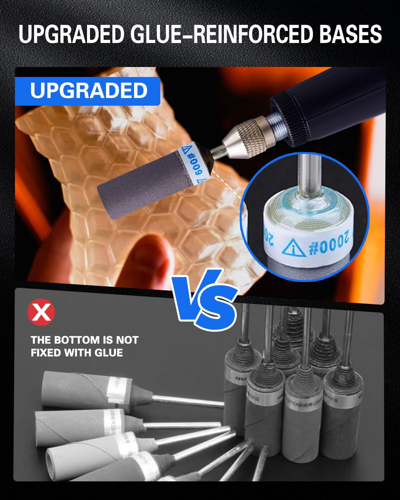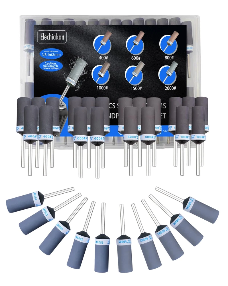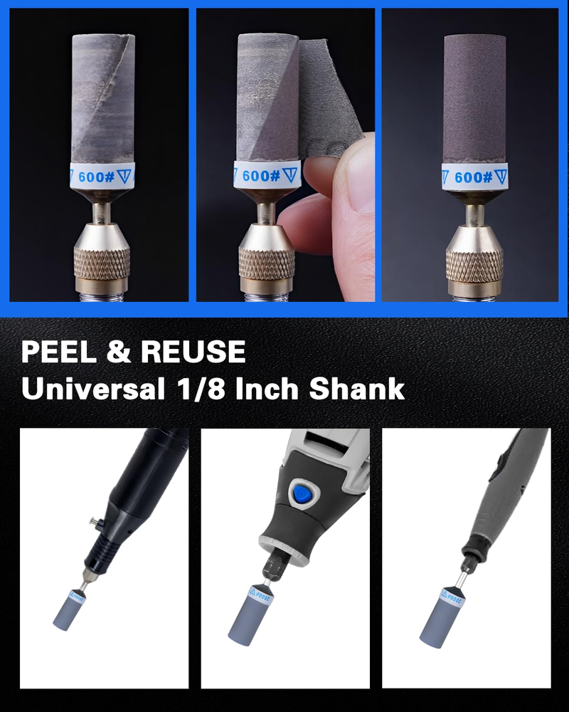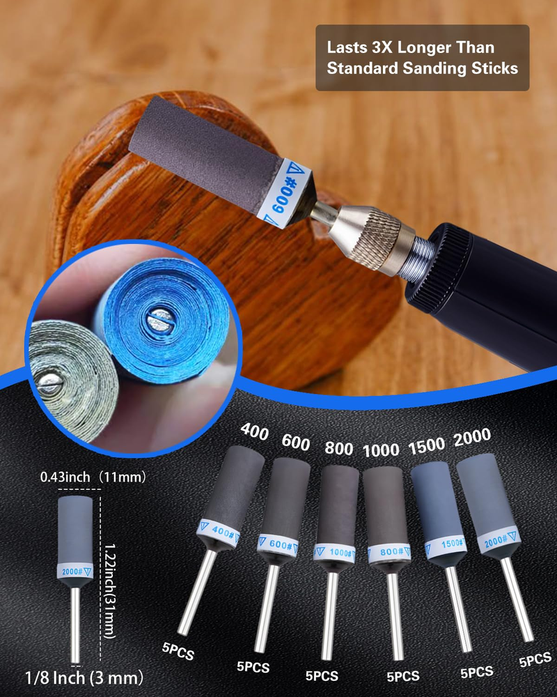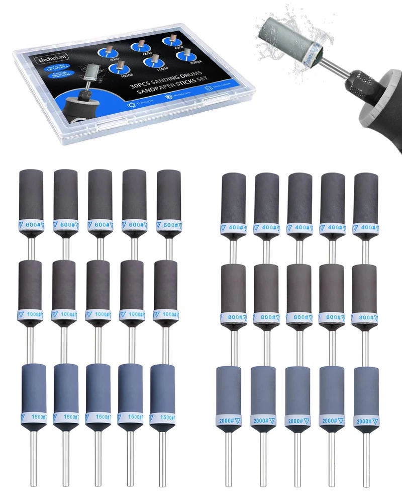 Scientifically-Optimized Grit Progression:30PCS sanding drums for dremel with 400/600/800/1000/1500/2000 grit (5PCS each), scientifically graded for 6-stage grit system. This research-backed grit progression handles every stage, from rough shaping to final finishing - delivering superior results Upgraded Adhesive Base: Tightly wound sanding bands with reinforced glue ensure longer lifespan. Simply peel off worn layers of sanding discs to reveal a fresh polishing surface, reducing the expense and waiting time of frequently replacing sanding heads Electric Sanding at Warp Speed: For dremel tool accessories fits all 1/8 inch shank rotary tools, like for Dremel 3000/4000, etc. Electric sanding is 10X faster than manual work! Just insert, tighten, and start sanding sticks for grinding plastic models plastic, stone, or metal effortlessly Wet and Dry Use – Safely polish wet surfaces like ceramics or dry sand wooden models, 400-2000 Grit From Rough to Mirror Finish! Perfect for DIY crafts, automotive repairs, and jewelry making Complete Grit Kit Goes Anywhere: Includes storage box and labels, easily sort and access for Dremel sanding drums, organized by grit. Compact design fits in toolboxes, take your sanding kit anywhere—workshop, job site, or on the go Product Description The video showcases the product in use. The video guides you through product setup. The video compares multiple products. The video shows the product being unpacked. What is the Kit Include? Merchant Video MAYBE THE ONE YOU’RE LOOKING FOR Add to Cart Add to Cart Add to Cart Add to Cart Add to Cart Add to Cart Add to Cart Customer Reviews 4.4 out of 5 stars 10 4.4 out of 5 stars 21 4.2 out of 5 stars 17 5.0 out of 5 stars 9 4.0 out of 5 stars 13 4.4 out of 5 stars 143 4.4 out of 5 stars 134 Price $20.99 $ 20 . 99 $17.99 $ 17 . 99 $11.67 $ 11 . 67 $29.99 $ 29 . 99 $16.99 $ 16 . 99 $17.99 $ 17 . 99 $15.97 $ 15 . 97 Package 30 PCS 10 PCS 60 PCS 136 PCS 294 PCS 268 PCS 140 PCS Shank Diameter 1/8 Inch 1/8 Inch 1/8 Inch 1/4 Inch 1/8 Inch 1/8 Inch 1/8 Inch Disc Diameter — — — 2 Inch 1 Inch 1 Inch — Component Silicon Carbide High-speed Steel Aluminum Oxide/Silicon Carbide Aluminum Oxide/Silicon Carbide Aluminum Oxide Silicon Carbide Wool Buffing Wheels Applications DIY crafts, jewelry making Wood, stone, ceramics, jade Deburring cut metal edges Remove rust, paint, and burrs Wood, rubber, leather, plastic Metal, resin wood, glass opals Hinges, edges, and corners