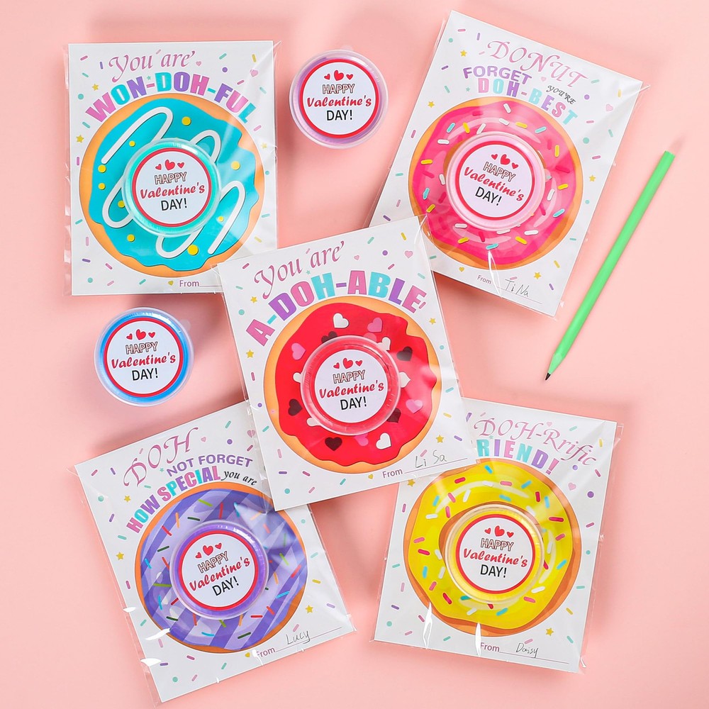 This Valentines Day set is a total hit! The donut-themed cards are adorable and creative—kids love sticking the playdough tubs into the center like a real donut hole. The playdough itself is high-quality, smooth, and stays fresh. The sweet puns on the cards make them extra fun, and the stickers and bags complete the perfect classroom gift. Safe, vibrant, and sure to make little ones smile! A fantastic deal for 30 unique gifts. Would absolutely recommend!