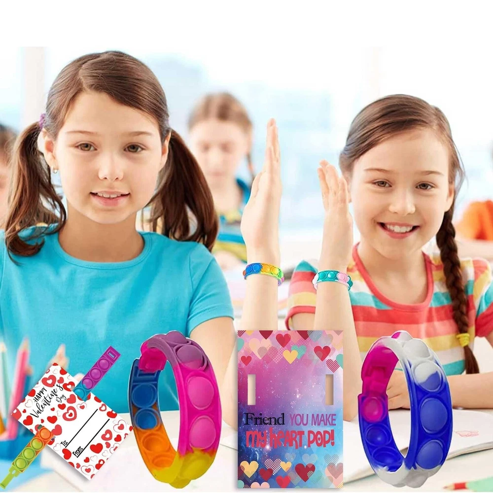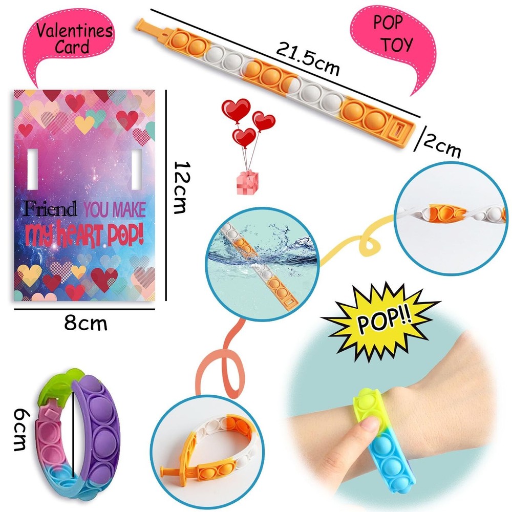 30 Pack Valentines Day Gift Cards for Kids Classroom, Pop Fidget Bracelets Stress Relief Sensory Toy School Classroom Gifts Exchange Valentines Party Favors Product Details Color: Multicolour Material: Rubber Brand: UPINLOOK Unit Count: 1.0 Count Theme: Valentine Item dimensions L x W x H: 11 x 5.5 x 0.75 inches Occasion: Valentine's Day Item Weight: 12.4 Ounces Manufacturer: UPINLOOK UPC: 744430177245 Age Range (Description): Kid Product Dimensions: 11 x 5.5 x 0.75 inches Item Weight: 12.4 ounces Country of Origin: China Item model number: CHBD2302201 Manufacturer recommended age: 36 months - 12 years Super Value Kids Valentines Gifts Set: The package includes 30 pcs Valentine's Day greeting cards(5 designs, 6 for each) and 30 pcs pop fidget bracelets toy. These are great value Valentines gifts for kids. The color is rich, so it can meet the needs of people who like different bracelets. Premium Material: Our pop fidget bracelets are made of high-quality silicone, soft and durable. Our Valentines cards are made of thick cards, sturdy and practical. Valentine greeting cards are designed with cut slits to allow the pop fidget bracelets toy to slide through, let others know where this gift comes from! Relieve Stress Effectively: It's pressed, makes a slight popping sound, which is effective in relieving stress and keeping the brain at rest. Kids Exchange Gift: These Valentines Day gift cards for kids can be carried to have fun anytime and anywhere, perfect for kids Valentine's Day gift exchange, Valentine's goody bag stuffers, valentine's day party favors, valentines party packs, valentines giveaways, school classroom prizes, etc. Kids will love getting this valentines gift from friends. Valentine's Day Party Favors: The Valentines day gift cards for kids have special punchlines and patterns, and each pop fidget toy comes with a card that children can pass on their love and care. Valentine's Day Gift Cards for Kids, Valentine's Day School Classroom Prizes, Valentine Exchange Gift, Kids Valentine Party Favors This Valentine gift set will be your choice! 1. Soft and smooth material can protect your children's skin from damage. 2. There are 30 pack cards for you. Make your children stand out by choosing the color that best suits them. Package includes: 30 Valentines Day Gift Cards