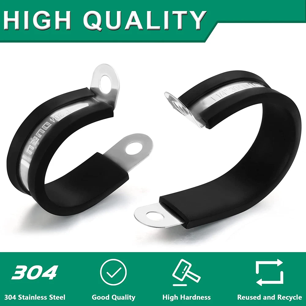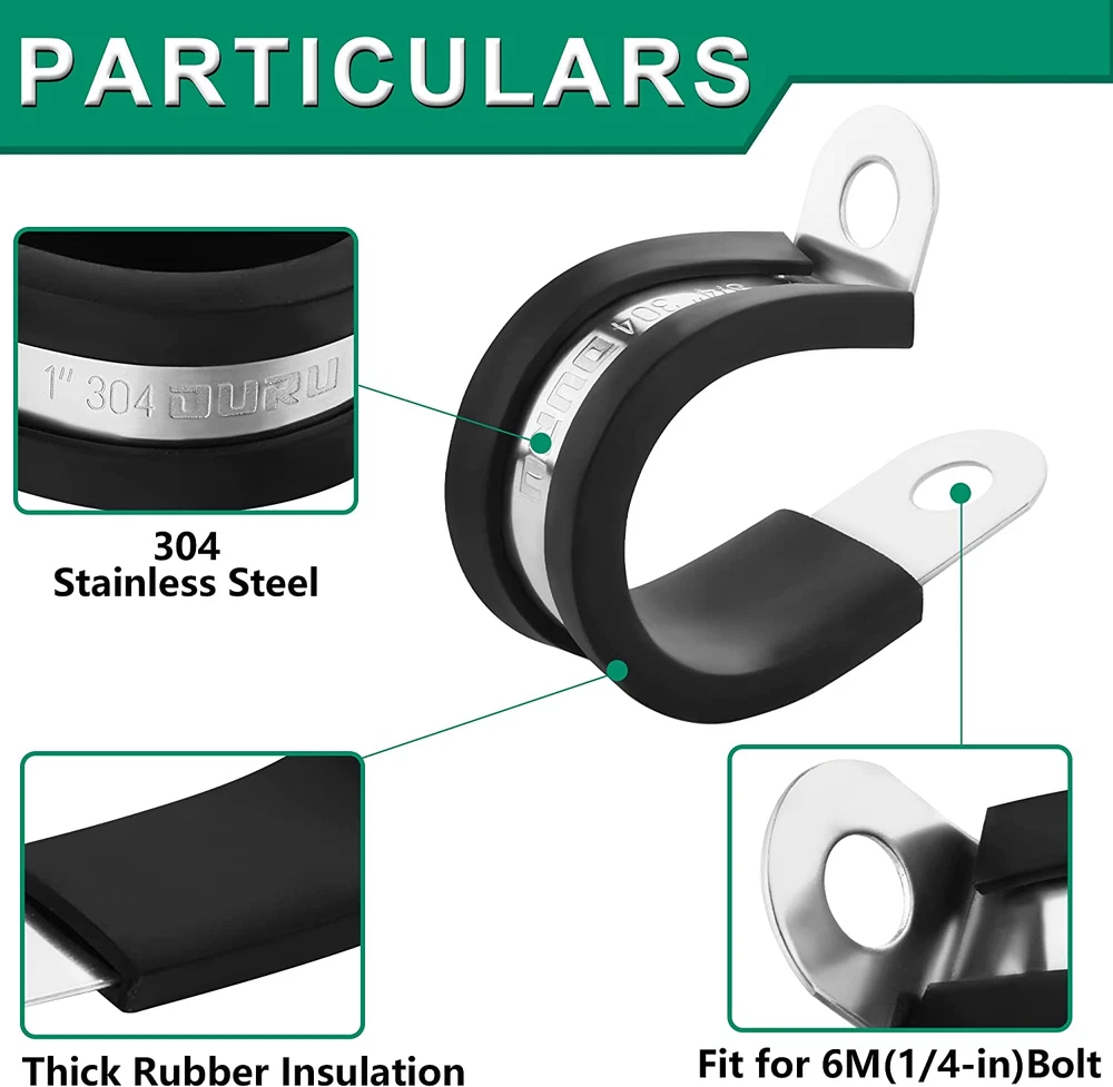 OURU Insulated Cable Clamps Kit —The stainless steel hose cable clamps box set contains 30PCS 1/2" p-clamps.Fit for 6M( 1/4 inch) screw bolt to through the screw hole Black Metal Cable Clamps-Each cable clamp is made of 304 high quality stainless steel with rubber coated cushioned.Excellent performance in abrasion,moisture,rust,cold and heat resistance even in harsh environments. It is strong and will not rust or break.It is the best choice for demanding indoor and outdoor Durable Rubber Insulated Wire Clamps-Used to fix and support pipes or wires and cables.The nylon rubber cushion on the hose clamps prevents damage caused by shock due to vibration,effectively protects the line and tube.Rubber insulation provides a safer installation.It can be firmly fixed in the right position,study and reliable Easy installation-The 30PCS 1/2 inch garden hose pipe clamps kit(13mm) in a storage box for easy to carry and store.With unique R-shaped design,flexible twisting and easy to control during installation,simple disassembly.You only need to use a screwdriver and screws to fix the clamps in the proper place,save time and effort.It can be recycled and reused,can be used for a long time Ideal for Application-The marine grade rubber p clamp.Used in automotive,industry,boat,outdoor,home decoration,DIY,RVs and any place where vibration may occur.Such as wires,cables,pipes,line management and repair Product Description The OURU Cable Clamps Assortment Kit, 304 Stainless Steel Rubber Cushion Hose Clamps Made from 304 Premium Stainless steel material with quality rubber cushioned. SINGLE USE DOUBLE USE THREE USE