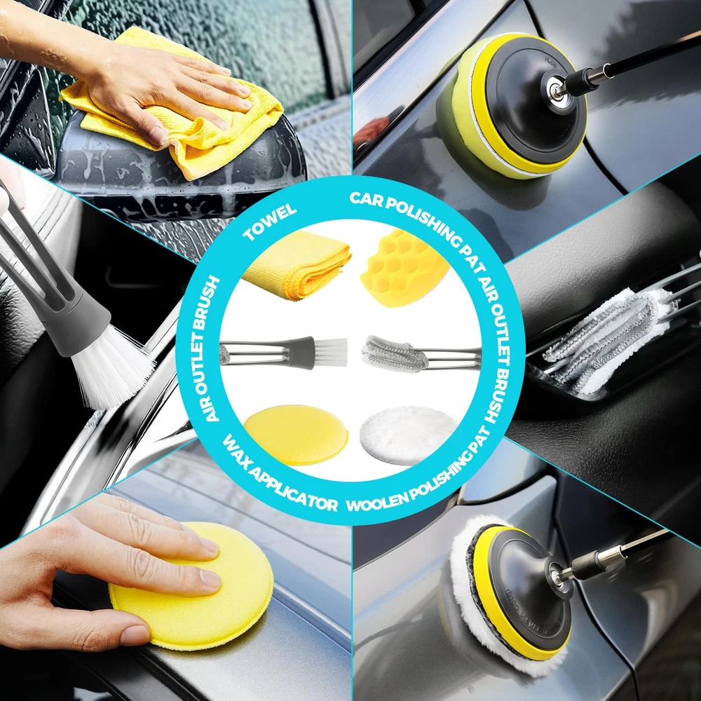 30Pcs Car Detailing Kit, Car Duster Exterior Scratch Free,Car Dusters Extendable Handle Cleaning Exterior, Car Cleaning , Car Detailing Brush Set for Interior, Exterior, Wheels Car Detailing Kit: It includes brushes, towels, car wash gloves, detail brushes and other tools to meet the cleaning needs of different parts such as the body, wheels, gaps, etc and is suitable for all-round car washing(Drill not include) Car Cleaning : Automotive dust cleaning can clean the nooks and crannies of the car, and can also be used in homes and offices. Cleaning putty for car air vents, steering wheel, console panel, storage bins, cup holder, door handles, dashboard and other hard to reach places. (NOTE: don’t wash the universal cleaning with water) Car Duster Exterior:Car Dusters Extendable Handle Cleaning Exterior for windshield, hood, and other hard-to-reach areas of large vehicles with ease Detail Brush Precise Cleaning: Includes a variety of sizes of detail brush, suitable for cleaning wheel hubs, grilles, window gaps and other hard-to-reach parts, ensuring no dead corners cleaning Versatile and Cost-Effective: This 30 piece set is ideal for home use, professional car wash, or car detailing , offering great value for money and making car cleaning effortless