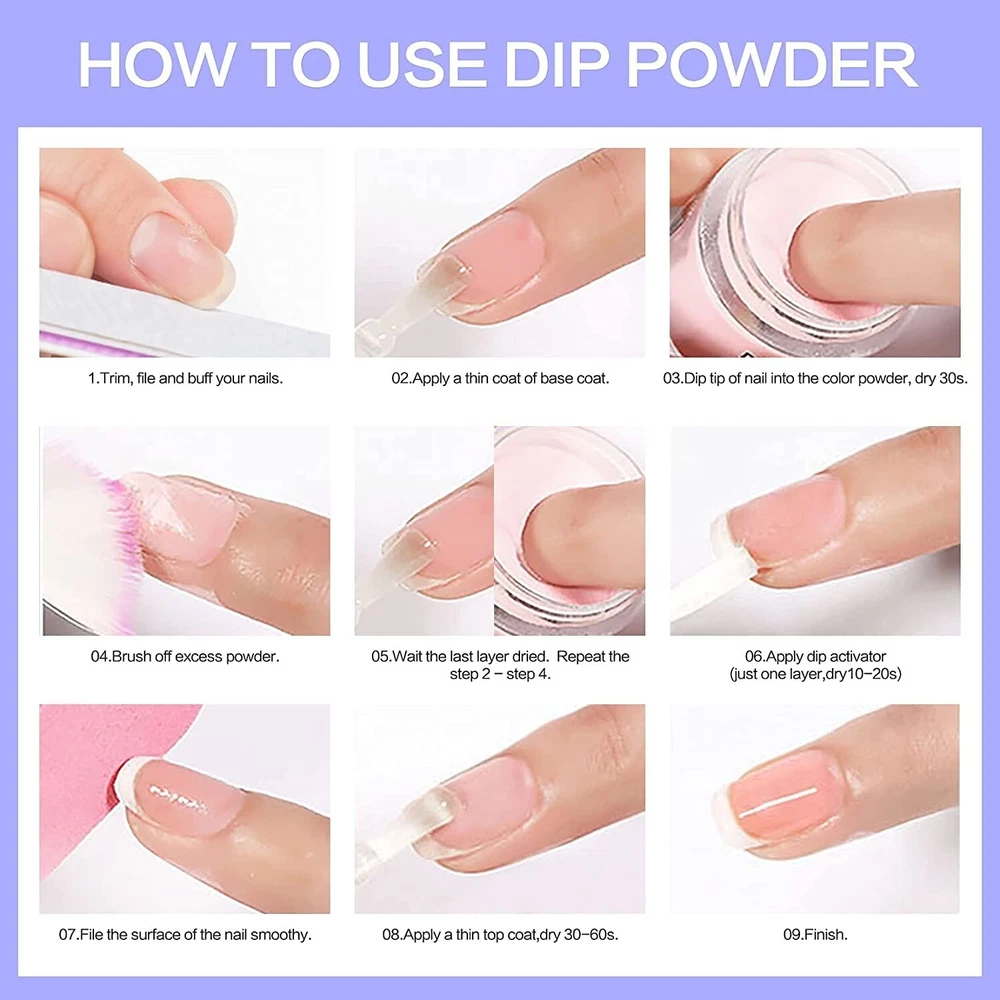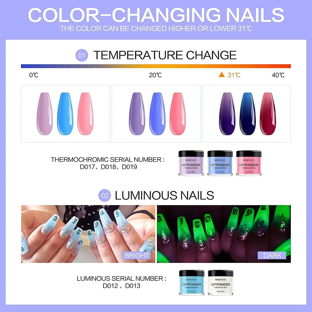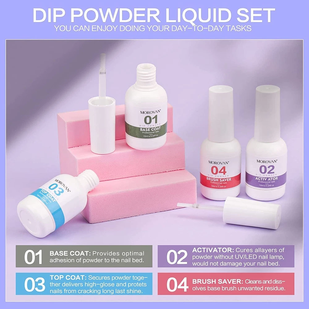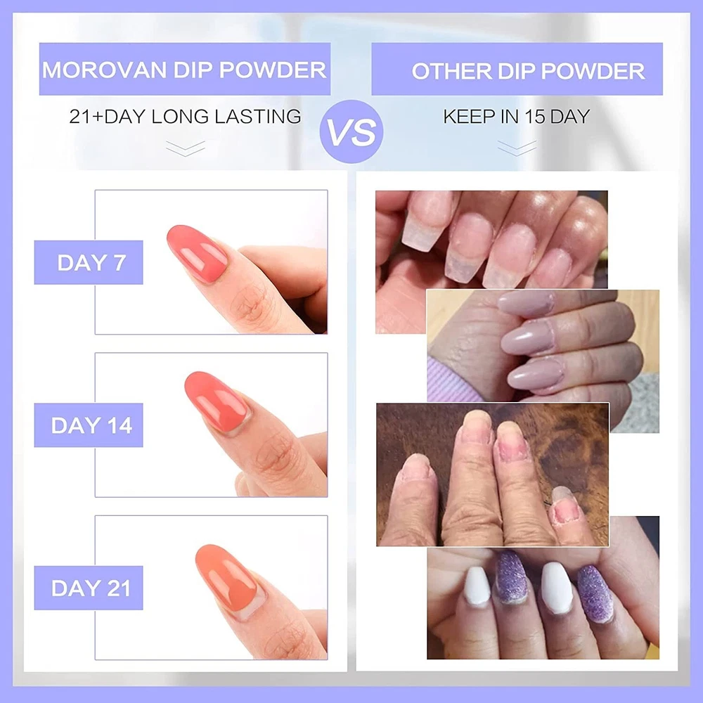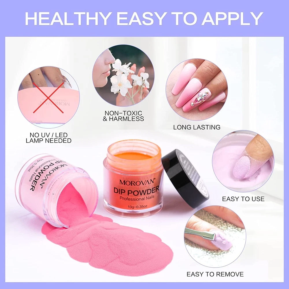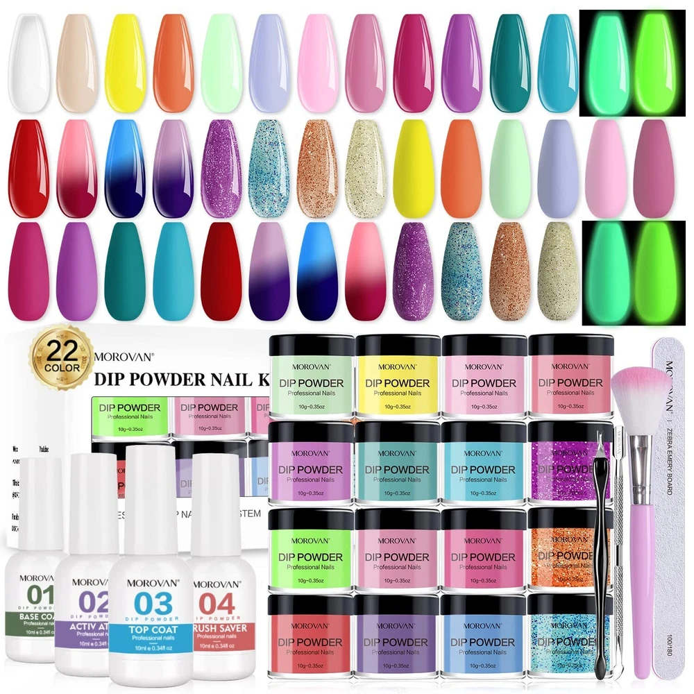 30Pcs Dip Powder Nail Kit 22 Colors Dipping Powder Kit Starter With Base Top Coat πŸ’ Amazing Effect Of Nail Dip Powder Kit - The dip powder nail kit starter includes 22 colors of glitter, pure and color change dipping powder only for you to refill your kit saving your money. The dip powder color of dip nail kit can be changed higher or lower at 31℃, amazing, and create a personal design. The dipping powder nail kit is very popular in all seasons and suitable for all occasions. πŸ’ Long Lasting Nail Dip Powder Kit- Morovan dip powder nail kit starter is long-lasting, chip-resistant , dipping powder nail kit doesn't need an uv light to cure.dip nails powder starter kit looks natural, lightweight, and has impeccable shine. The dip powder kit can keep the nail art gorgeous and shiny for about 21+ days of durable wear if have proper application. You can mix the different dipping powder nail as you like freely to create your personal nail art! πŸ’ No Needed Nail Lamp & Saving Time dip powder kit- This fast dry dip powder nail kit starter does not need nail lamp to cure, nail dip powder kit saves your 25% operation time and avoids turning skin black and damaging. dip nail kit perfect for both beginner and professional salons.It's a faster way to paint your nail. TIP: Stir the dipping powder nail kit evenly before using with a sticker. πŸ’ Healthy & Safe Of Nail Dip Powder Kit -Morovan dip powder nail kit Starter make with healthy, natural new formula to help nails grow stronger and healthier. These dip nail kit doesn't damage the nail bed and available for air dry. Morovan dip nails powder starter kit suitable for all kinds of nails. dipping powder nail kit is surely safe and easy to handle for both professionals and home users.