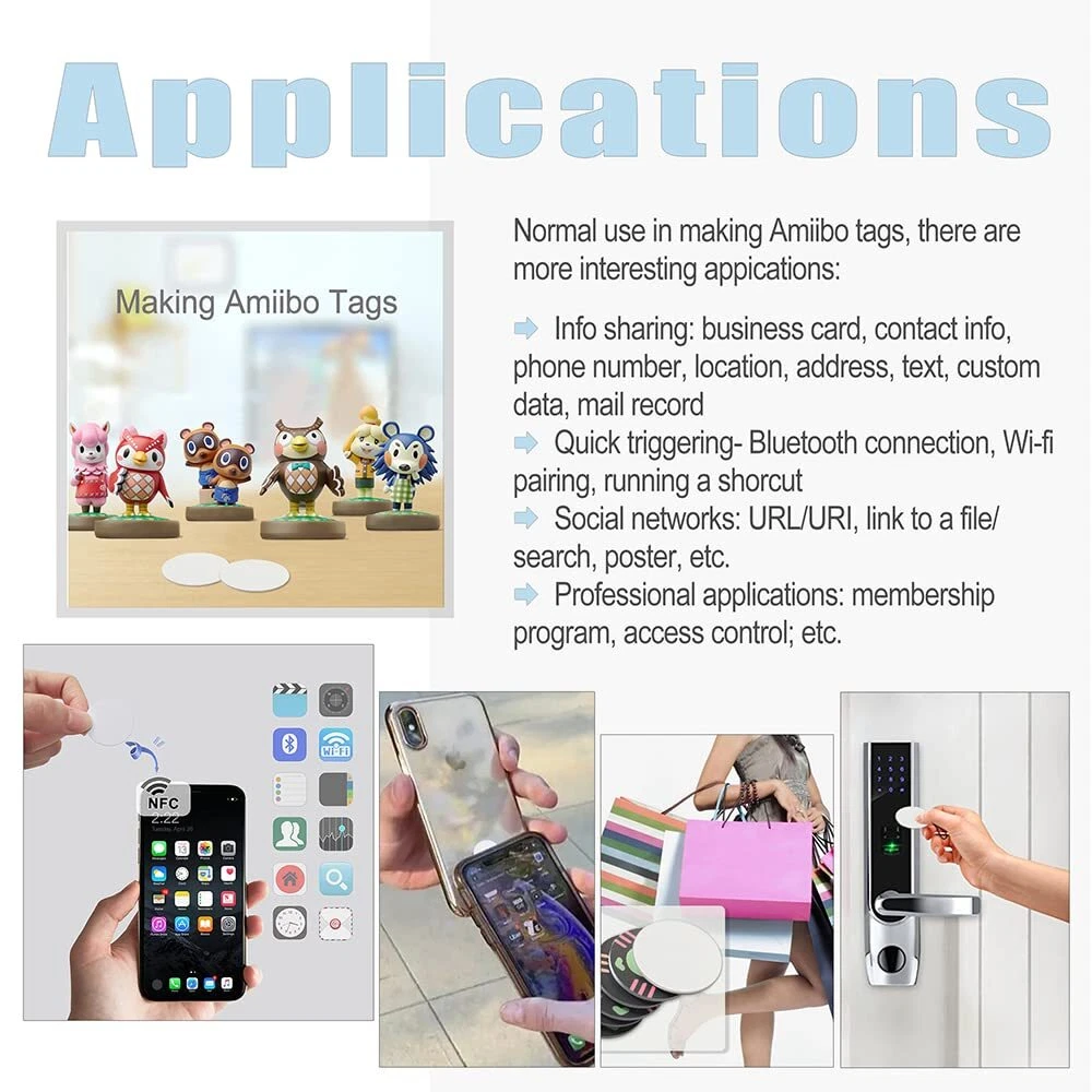 【Quantity】Includes 30pcs 25mm(1 inch) white NTAG215 NFC tags with adhesive back, Compatible with Nintendo Switch, Wii U and 3DS. Good choice as a gift. 【Safe Material】Using environmentally friendly material, NFC tag surface is smooth and shiny. The back adhesive is strong enough and easy to paste on surface of most items.(Note: not designed for use on metal surface). 【Installed with NTAG215 Chip】Enough storage space: 504 bytes of available NDEF memory, you can quickly write the information you want. NTAG215 chip has a read-write lock function so that it can be edited repeatedly or read-only. You can write, erase and rewrite easily (write endurance: >100,000 cycles). NOTE: If set as “read-only”, the chip can NOT be edited or reset any more. You can only edit Amiibo just once, and then the chip can not be repeatedly erased and rewrite. 【Scope Applications】Great for making Amiibo tags via NFC-enabled smartphones (Android OS 5.0 and above iOS 13 and above), Android support use TagMo app; iOS support use Placiibo/Amiibox/Tagmiibo app etc. Make sure to download a retail key bin file as well as the Amiibo files into the folder, that way the bin files will work. iOS users also can use “NFC Tools” app edit the NFC tags set up some siri shortcuts to quickly listen to music, connect to WiFi and more. 【Worry-free After-sales Service】If you have no idea how to use, we recommend: before your buying, watch related videos on Tik Toks/ YouTube OR Search “iPhone NFC tag” OR check r/amiibomb on Reddit for a guide on how to get started to see if they are suitable for you. For any reason the NFC tags that you received show error or damaged, doesn’t work, just contact us immediately for a free replacement!