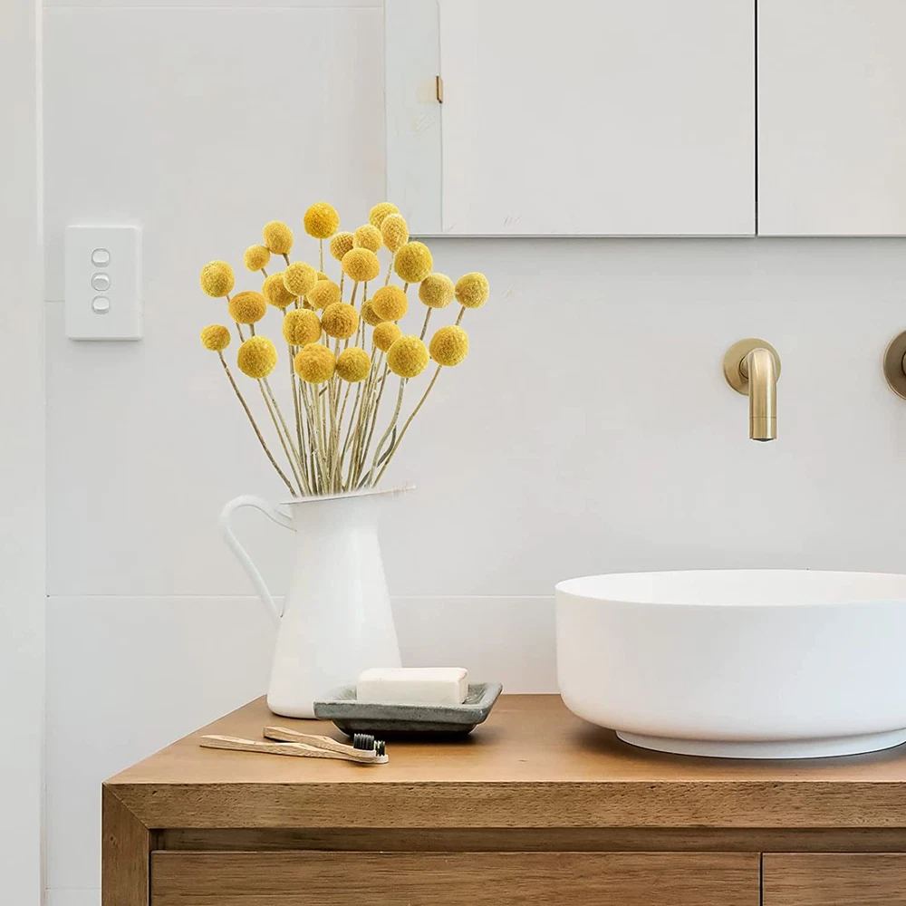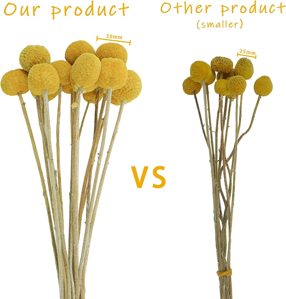 Package: Billy's ball is about 0.8-1.1in in diameter (you won't find as large as ours at this price in other store).You will receive 30pcs of gold billies balls flower; each craspedia billy balls is 16.5 inch/ 43cm long, suitable for a tall vase. These flowers are well-packaged, and you can fill them all in your retro style clay pot. If you want to fill more full, it is recommended that you buy multiple batches Times Yellow Flowers for floral arrangement: Dried Billy balls are known of their bright yellow and are a fun addition to your handmade floral arrangements. For vase fillers, Christmas Wreath, door wreath, chic Floral Arrangements, Wildflower bouquet, beach theme, placed around table, living room, woodland country decor, dining room decoration. Add whimsical color and texture Craspedia are versatile, meaning these blooms can be used in anything from boho to rustic arrangements. Perfect for giving shape and visual interest to your Floral Arrangements, Pair with blooms like dried lavender flowers, succulen, golden yellow roses, dahlia flowers Gifts from nature: Billy balls flower is a cute and budget-savvy flower that will give your wedding decor a twist. billy balls can be easily incorporated into your wedding boutonnieres, bouquet, Wedding Centerpieces, aisle, cake, and place cards. That’s fun Everlasting flower: As a kind of natural dried flowers, please put away from the damp place, otherwise It will be moldy, Dried Billy Buttons Flowers can be well preserved, you can put it on your desk, cabinet, dining table, bedroom, bright yellow will not fade, year after year to you Bring beauty to enjoy Why Choose us? Our billy balls are 100% as big as 25-30mm, and some of them even have 40mm in diameter. You can't find such quality at this price. By the way, since all of them are 100% natural, we can't guarantee the balls don't get mold during long-distance transportation. If you receive a ball that gets mold, please contact us, we would definitely give you a free return Product Description Uieke 30Pcs Natural Dried Flowers Craspedia Billy Balls Flowers 100% Natural About Size Our 30mm billy balls are 100% as big as 25-30mm, and some of them even have 40mm in diameter. You can't find such quality at this level. If you are looking for the big balls' heads, then 30mm is your optimal choice. If you want some mix sizes, then you can buy some 10mm and 25mm billy balls to make some more arrangements. About Moldy Problem and Smells the little white stuff on the billy balls are 100% natural since they are hand-picked directly from the soil. It's not moldy. You can use a cleaning brush and wipe it gently to remove the white stuff. About Quantity 30pcs in total; All billy balls are hand-picked by our farmers, sometimes there are manual mistakes and result in quantity missing. Don't worry. If you receive these balls less than 30pcs, please let us know. photos are 100% real Elements for Dried Flower Bouquets About smell 100% natural dried billy balls and the smell is natural. If you don't like the smell, just put it under direct sunshine for a few hours and the smell will disappear. About color problems Color: Natural yellow; The billy balls are harvested from the soil and dried in the sun, so it is natural that the balls have a little dirt and dust. In other words, they are intact and do not dye by chemical additives. About Fullness One bouquet is 30pcs for fullness, you can order a few more bouquets.