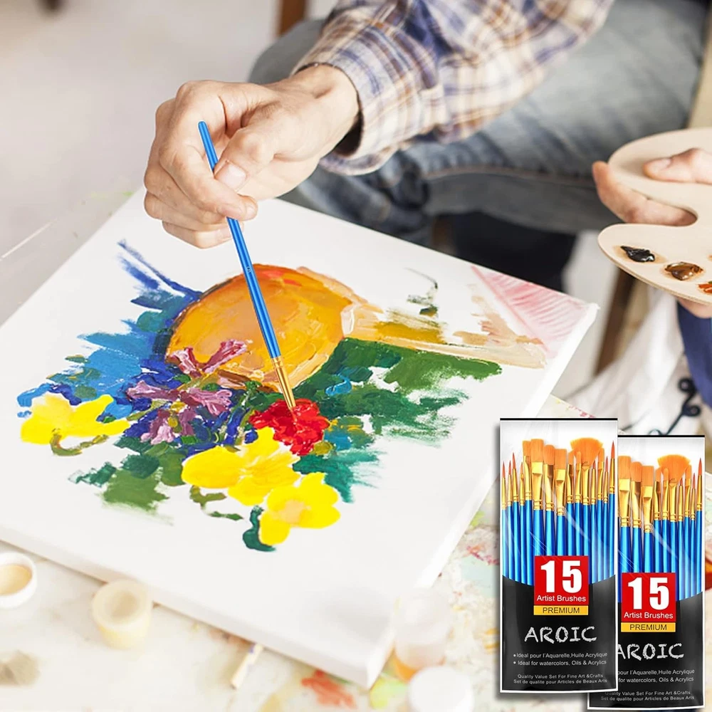 AROIC Acrylic Paint Brush Set, 30 pcs Nylon Hair Brushes 30pcs, Blue Product Details Color: Blue Material: Nylon, Wood Size: 30pcs Brand: AROIC Paint Type: Oil,Acrylic,Watercolor Handle Type: Wood Brush Width: 1.26 Inches Bristle Type: Flagged Bristle Manufacturer: AROIC Package Dimensions: 7.91 x 5.83 x 0.59 inches Item Weight: 3.84 ounces Country of Origin: China Item model number: PaintBrush-30p New 2 PACKS of 15 SIZES ART BRUSHES: The 15 sizes versatile paintbrushes set with a variety of shapes make mixing color more easier, perfect for artists, students, teens, kids and painters of all levels. Wonderful gift idea for your friends and families that enjoy painting! All-purposed Brushes Sets: Professional paint brushes can cover all your needs. The multi-purposed brushes are ideal for watercolor, oil, gouache, acrylic painting, body, nail, face painting, miniature, model, ceramic, craft art painting, etc. High Quality Process: Designed with anti-shedding bristles, anti-rust nickel ferrules, and sturdy wooden handles, you can use the brushes to focus on your painting and always be filled with creative ideas. Easy Maintenance: After using the brushes, it’s very convenient to clean them with warm soapy water and reshape the brush tips. Air-dry the brushes and store them in the carrying container in a tip-top position for long time of use.