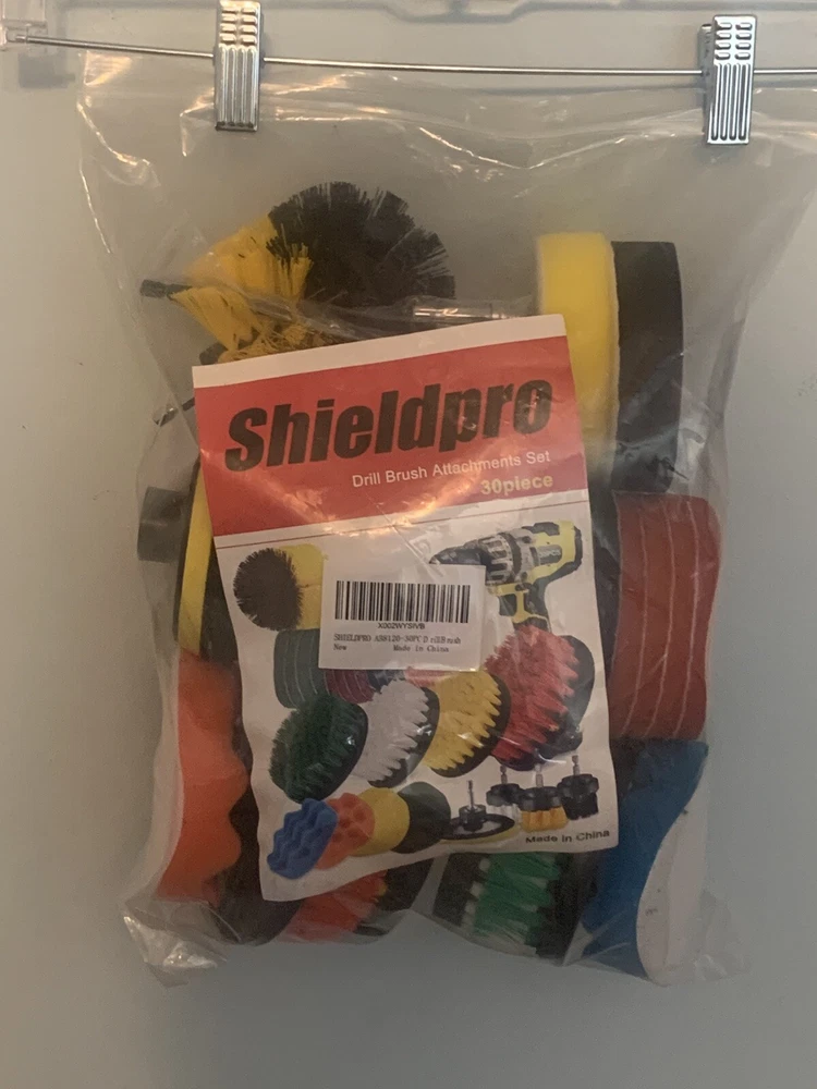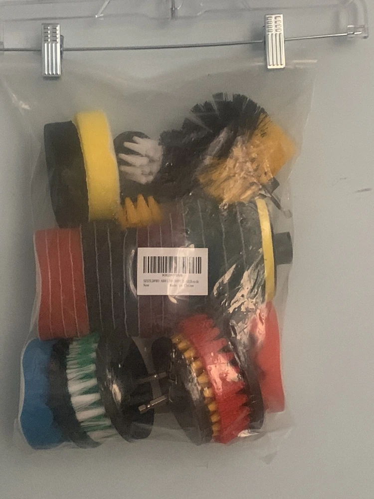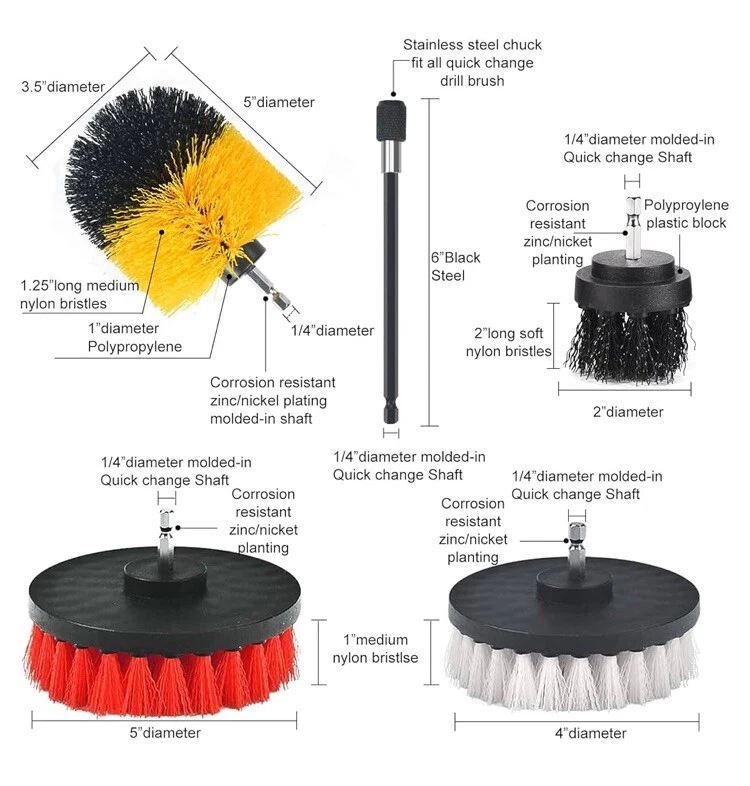 A perfect way to make every nook and cranny of your house or car absolutely spotless! Brush, Scouring Pads & Scrub Sponge. Includes: 8 Drill scrubber brushes, (DRILL IS NOT INCLUDED) 16 Scouring pads of different stiffness, 4 Scrub sponges, 1 piece corresponding scrubber connector, 1 piece Extended Reach Attachment