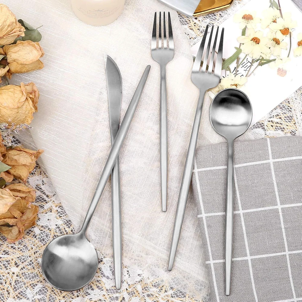 Number of Pieces 30 Material Stainless Steel Color Matte Silver Product Care Instructions Dishwasher Safe Recommended Uses For Product Indoor Special Feature Dishwasher Safe Finish Type Polished Included Components 6 x Dinner Forks, 6 x Knives, 6 x Dinner Spoons, 6 x Tea Spoons, 6 x Salad Forks Item Weight 3.3 Pounds See less About this item 🍴30 Pieces cutlery set service for 6---Each set includes: 6 salad forks, 6 dinner forks, 6 knives, 6 soup spoons, and 6 dessert spoons. 🍴Superior 18/0 Stainless Steel--This flatware set has 18/3 Stainless Steel fabrication that is immune to corroding, warping or flexing. When you commit your money in dinner knife you are making an investment in tableware that will serve your kitchen for a long time. This set with a finely polished satin finish and has a reliable, enduring construction for an exceptional comfort in use. 🍴This silverware set will add some style to your dining table purchasing this economic tableware that isn’t breaking under regular everyday use! Features 18/0 stainless steel construction with a finely polished chrome finish. A three-pronged design allows for an essential use with nearly any appetizer. This item has a reliable, enduring construction for an exceptional comfort in use. 🍴Sleek design for formal and causal use--With slim profiles and pointed stems, the FAMEWARE Flatware is a sophisticated take on minimalist design. The set includes everything you need for a formal full-course meal, but the reliable stainless steel and dishwasher-safe design makes it perfect for everyday dining too. 🍴Your appropriate care will make the silverware sets always look as good as new, please don’t use iron wire to scratch the pieces to keep their smooth surface. Number of Pieces 30 Material Stainless Steel Color Matte Silver Product Care Instructions Dishwasher Safe Recommended Uses For Product Indoor Special Feature Dishwasher Safe Finish Type Polished Included Components 6 x Dinner Forks, 6 x Knives, 6 x Dinner Spoons, 6 x Tea Spoons, 6 x Salad Forks Item Weight 3.3 Pounds Is Stain Resistant Yes Is Dishwasher Safe Yes UPC 787803790276 Package Dimensions 9.76 x 3.54 x 2.28 inches Item Weight 3.3 pounds