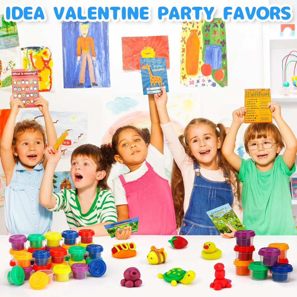 Fun and Creative Valentine's Set: This set includes 30 Punny Valentine's Day Cards and 30 colorful playing dough tubs, offering kids hours of creative fun while making Valentine’s Day extra special. Unique and Playful Cards: The pun-filled Valentine’s Day cards feature charming designs that are perfect for kids to share with friends, spreading joy and laughter. Versatile for Various Occasions: Ideal for classroom gift exchanges, party favors, and prizes, this set is a great choice for teachers, parents, and students seeking hassle-free Valentine’s Day solutions. Premium Quality Materials: The playing dough is soft, durable, and easy to mold, while the cards are made from sturdy, high-quality cardstock, ensuring safety and long-lasting use. Non-Candy and Engaging Gift Option: A healthier alternative to candy, the playding dough inspires creativity and keeps kids entertained, making it a hit for all ages and a thoughtful Valentine’s Day gift! Product Description