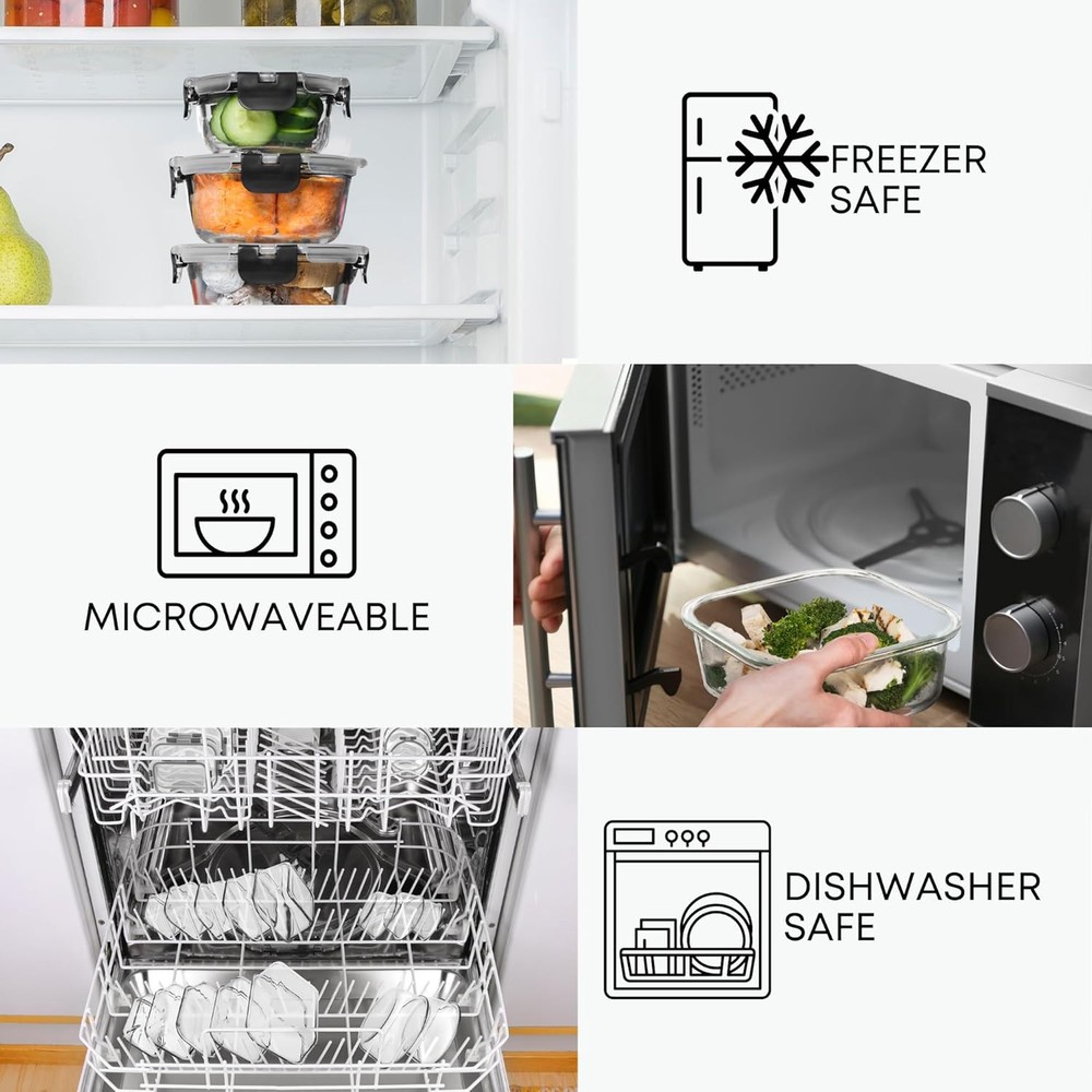 Razab 30 PC Glass Food Storage Containers with Lids - Reusable Black Product Details Product Dimensions: 8"L x 6"W x 7"H Recommended Uses For Product: Meal Prep, Leftover, Lunch Special Feature: Air Tight, Stackable, Durable, Microwave Safe, Dishwasher Safe Container Shape: Round, Square, Rectangular Closure Type: Snap Is Dishwasher Safe: Yes Material Type Free: BPA Free Item Package Quantity: 1 Item Weight: 11 Pounds Product Care Instructions: Dishwasher Safe Item Volume: 212 Fluid Ounces Unit Count: 30.0 Count Is Microwaveable: Yes Manufacturer: Razab Part Number: 30_Glass_Black Item Weight: 11 pounds Item model number: 30_Glass_Black Shape: Rectangular - Square - Round Number Of Pieces: 30 Special Features: Air Tight, Stackable, Durable, Microwave Safe, Dishwasher Safe Included Components: Glass Containers, Lids Batteries Included?: No Batteries Required?: No Number of Sets: 30 Brand: Razab Color: Black Material: Borosilicate Glass Material Feature: BPA Free Capacity: 212 Fluid Ounces 【Comprehensive Set】Includes 30 glass storage containers with lids in various shapes and sizes: Rectangular (1040ml / 35 oz, 660ml / 22 oz, 370ml / 13 oz, 185ml / 6 oz), Square (800ml / 27 oz, 510ml / 17 oz, 310ml / 11 oz, 160ml / 6 oz), and Round (960ml / 33 oz, 630ml / 21 oz, 390ml / 13 oz, 240ml / 8 oz). Perfect for meal prep, food storage, and organizing your pantry 【Airtight & Leakproof】Snap locking lids with silicone seals ensure airtight and leakproof protection, keeping your food fresh. These glass food storage containers are ideal for meal prep glass containers with lids, freezer storage containers, and storing leftovers without spills. 【Temperature Resistant】These glass meal prep containers can withstand extreme temperatures from -40°F to 500°F, making them safe for oven, microwave, freezer, and dishwasher. Transition seamlessly from cooking to storing with glass containers that maintain your food's quality. 【Healthy & Safe】Made from BPA-free, non-toxic borosilicate glass, these reusable glass food containers provide a safe alternative to plastic. Ideal for health-conscious individuals and households seeking non-toxic food storage containers. 【Organize with Ease】Razab glass storage containers with lids are perfect for meal prep, leftovers, and pantry organization. The assorted sizes and shapes of these glass containers make it easy to keep your kitchen tidy and your meals fresh. These containers are also stackable food storage containers, maximizing your kitchen space.